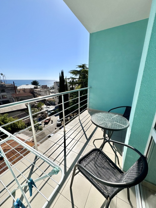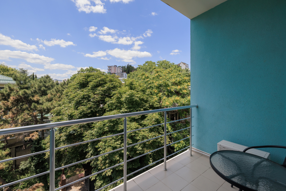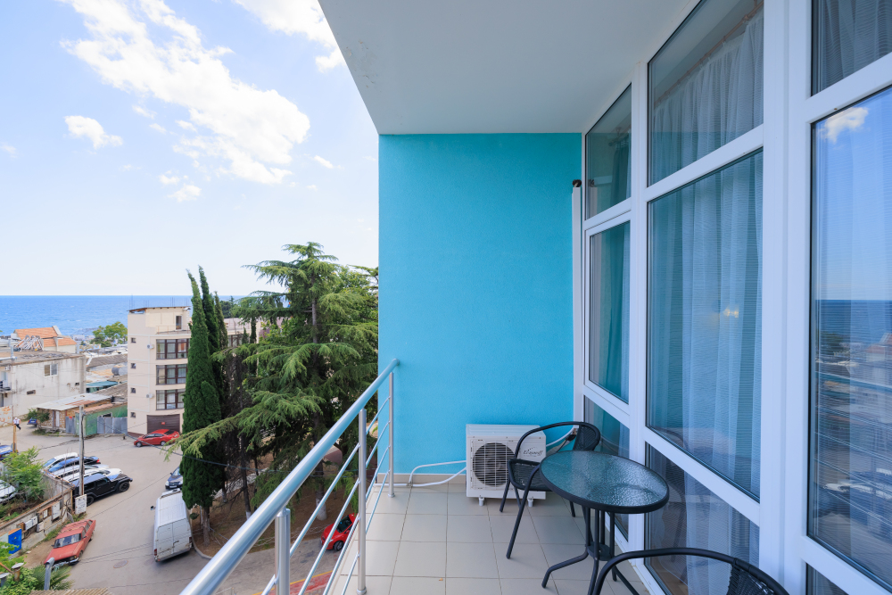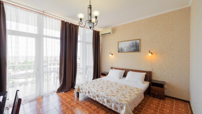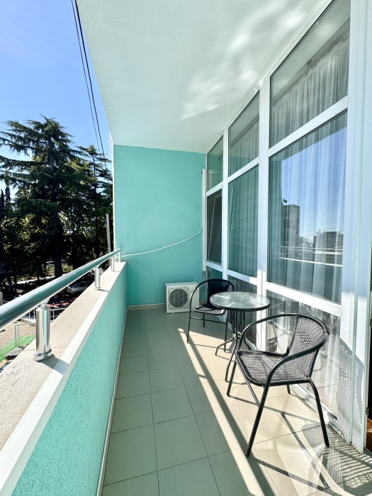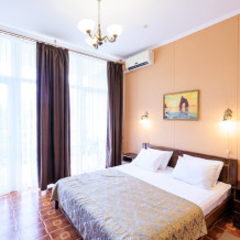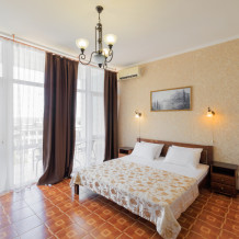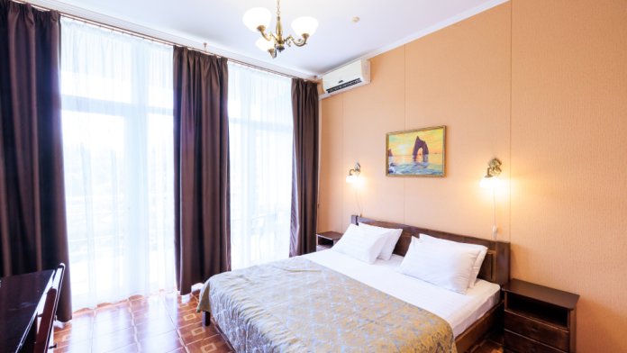 В номере: двуспальная кровать (1800 см х 2000 см), кондиционер, шкаф для одежды, прикроватные тумбы, стол, стул, чайная посуда, телефон, возможность подключения к интернету через Wi-Fi, отдельный балкон с мебелью.