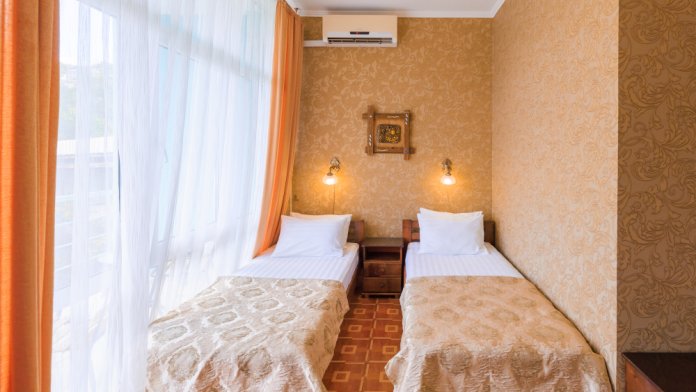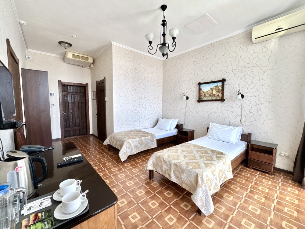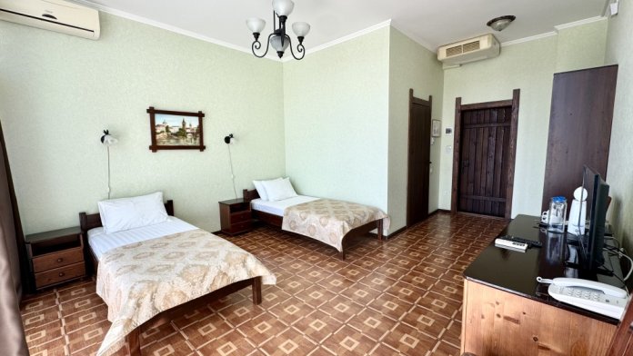В номере: две односпальные кровати (80 см х 180 см), кондиционер, шкаф для одежды, прикроватные тумбы, стол, стул, чайная посуда, телефон, возможность подключения к интернету через
