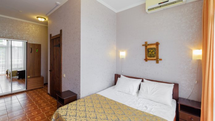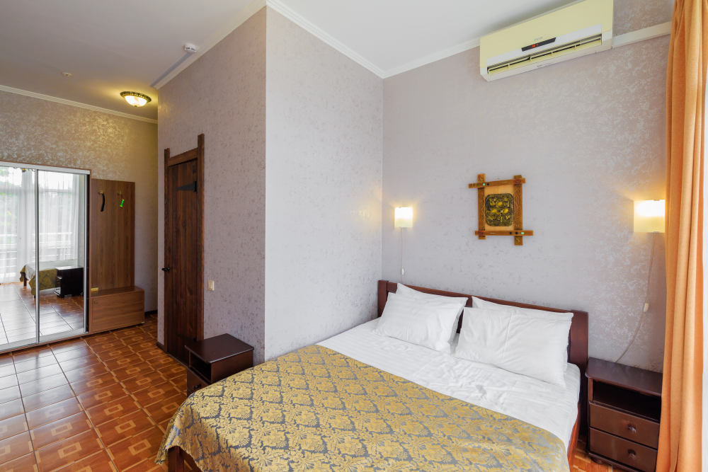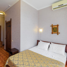 В номере: двуспальная кровать (1800 см х 2000 см), кондиционер, шкаф для одежды, прикроватные тумбы, стол, стул, чайная посуда, телефон, возможность подключения к интернету через