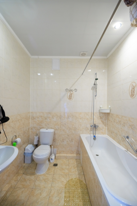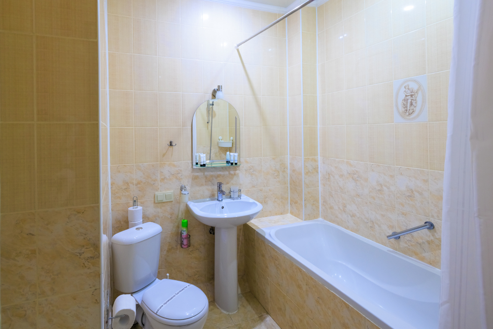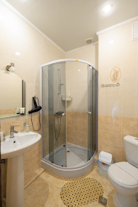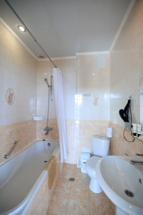 Номер - 16 кв.м с удобствами (совмещенный санузел с душевой кабинкой, тапочки, туалетные принадлежности, фен, 2 халата).