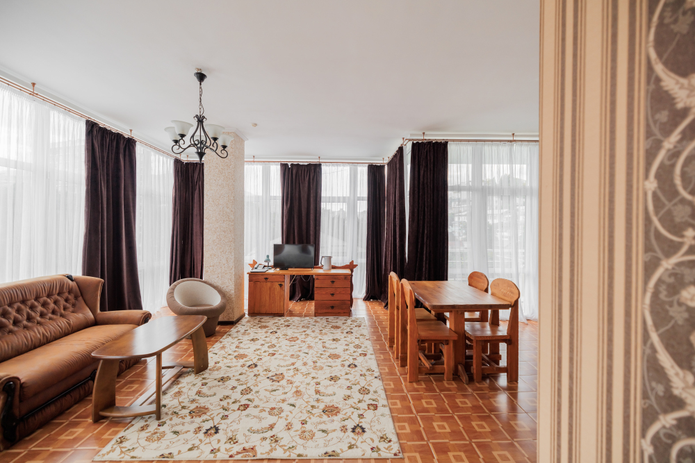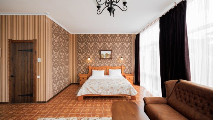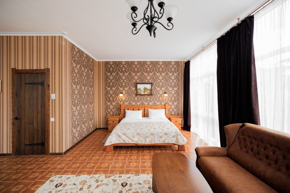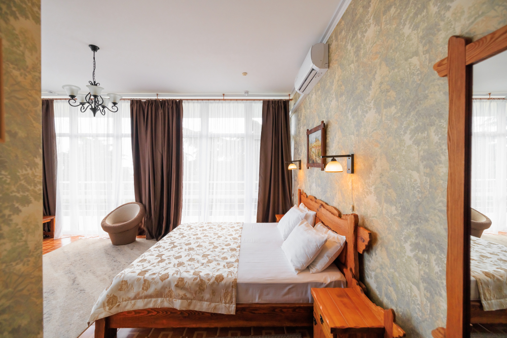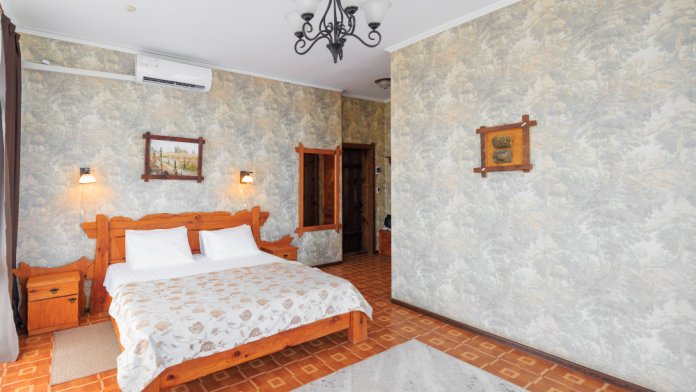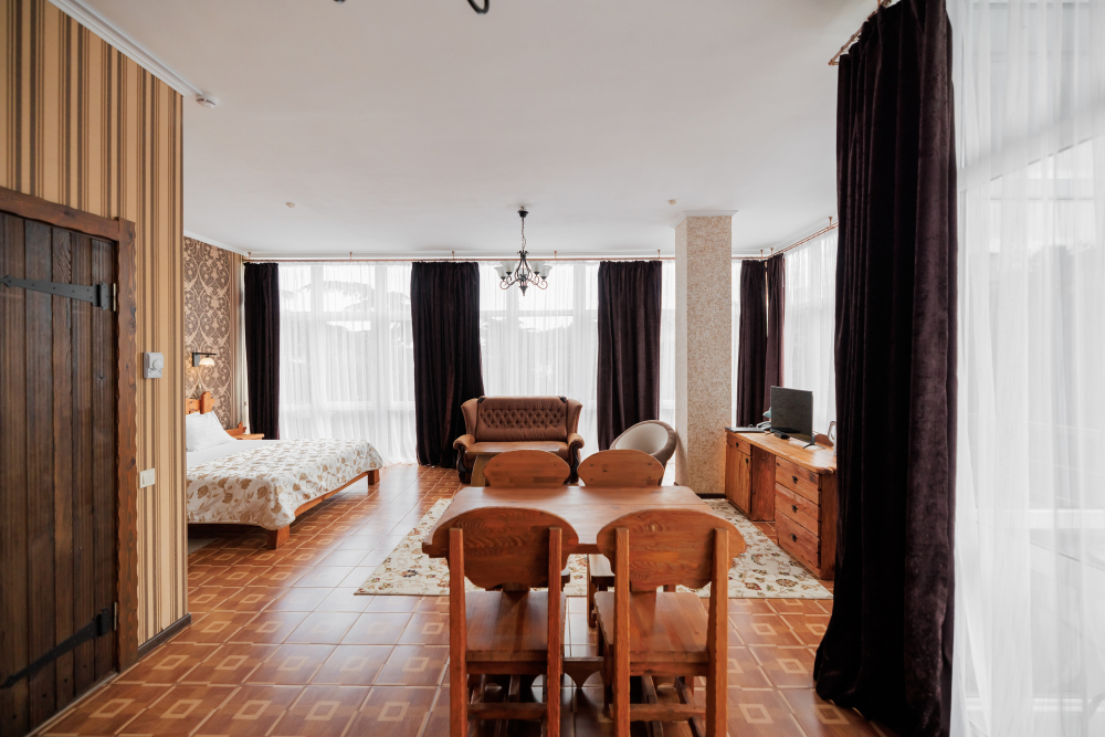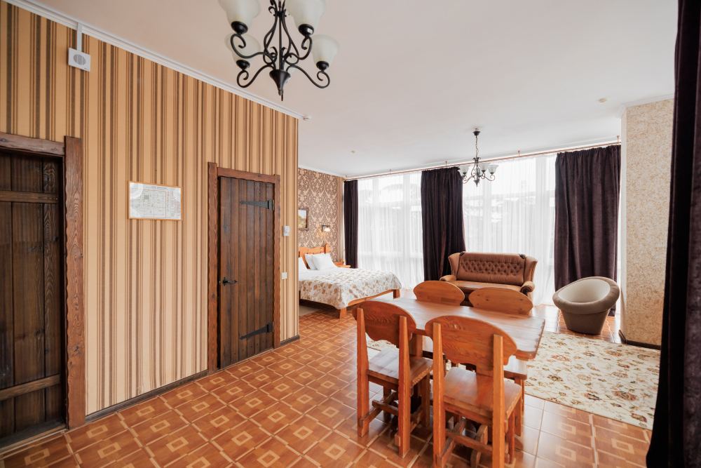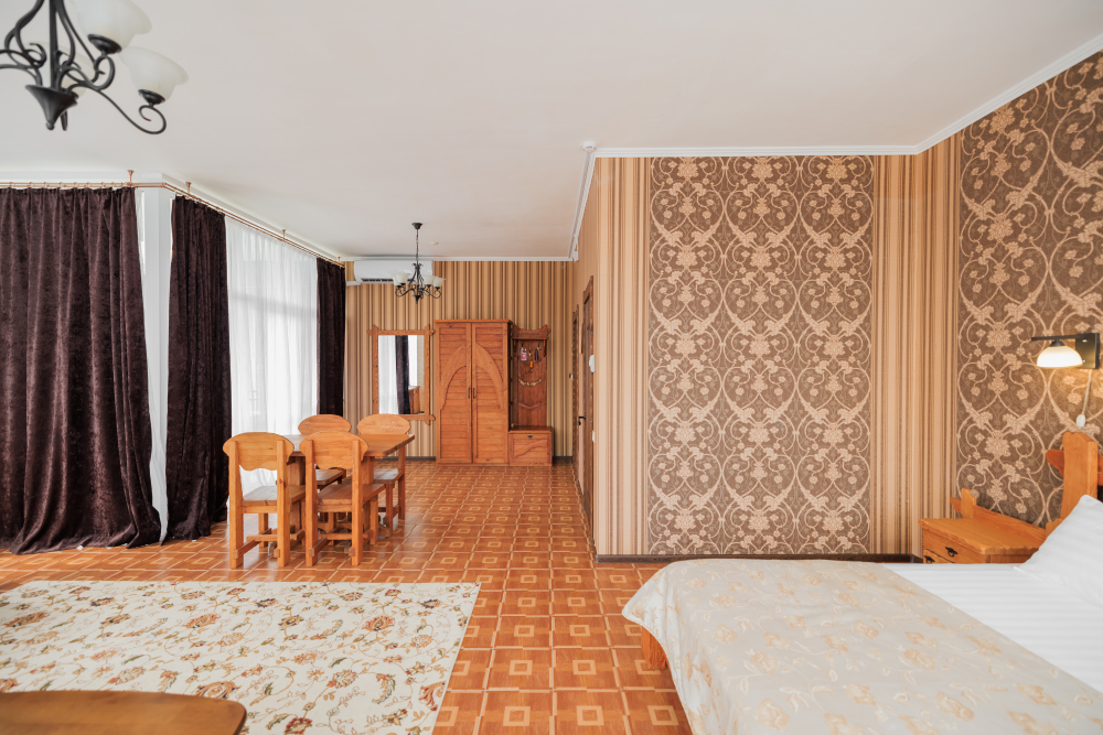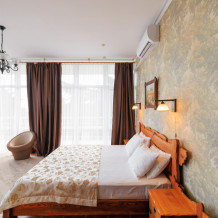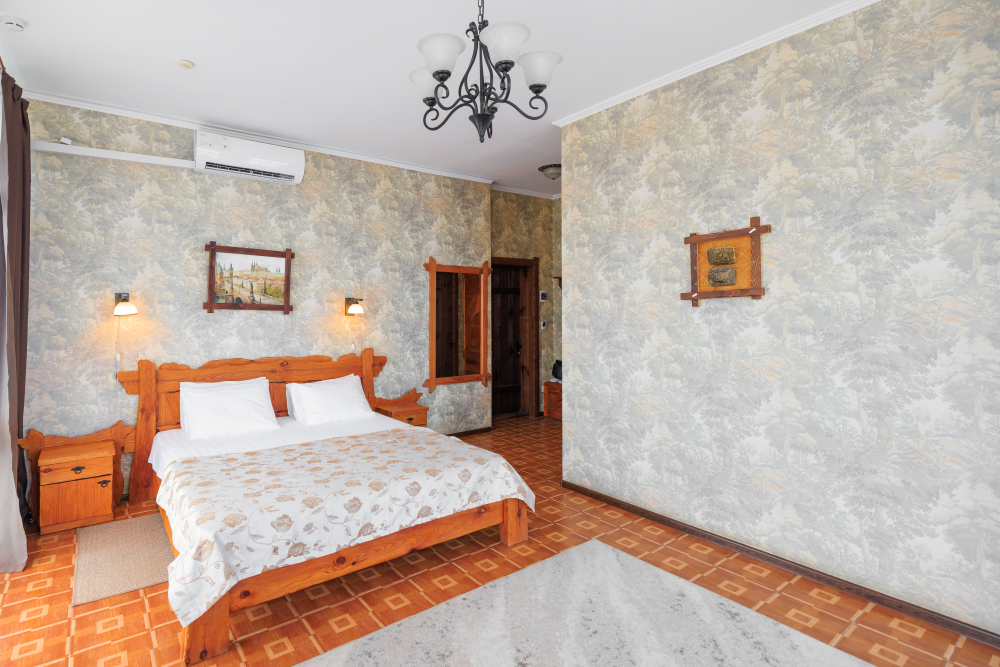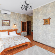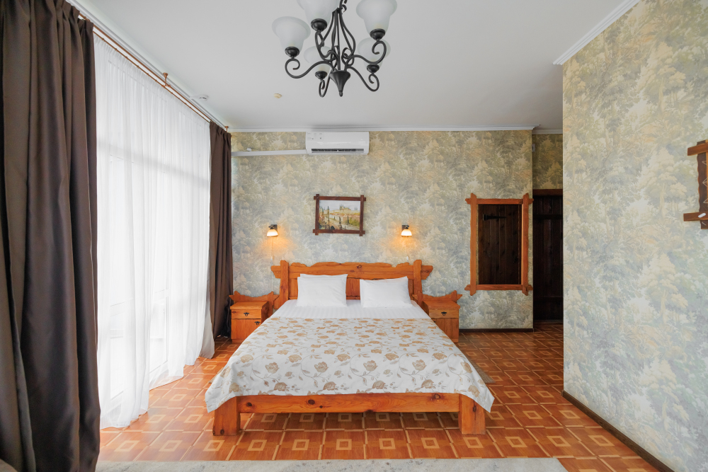 Наши номера — это гармоничный союз старинного шарма и безупречного современного удобства. Вы будете отдыхать в апартаментах, обставленных изысканной мебелью из натурального дерева, вдыхая его аромат и чувствуя тепло фактуры. Здесь вас ждет безупречный покой: тихий кондиционер, многофункциональный телевизор, мини-холодильник для прохладительных напитков и сверхскоростной Wi-Fi. А в просторной ванной комнате, выложенной керамикой, так приятно смыть усталость после дня, полного впечатлений.