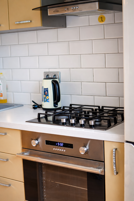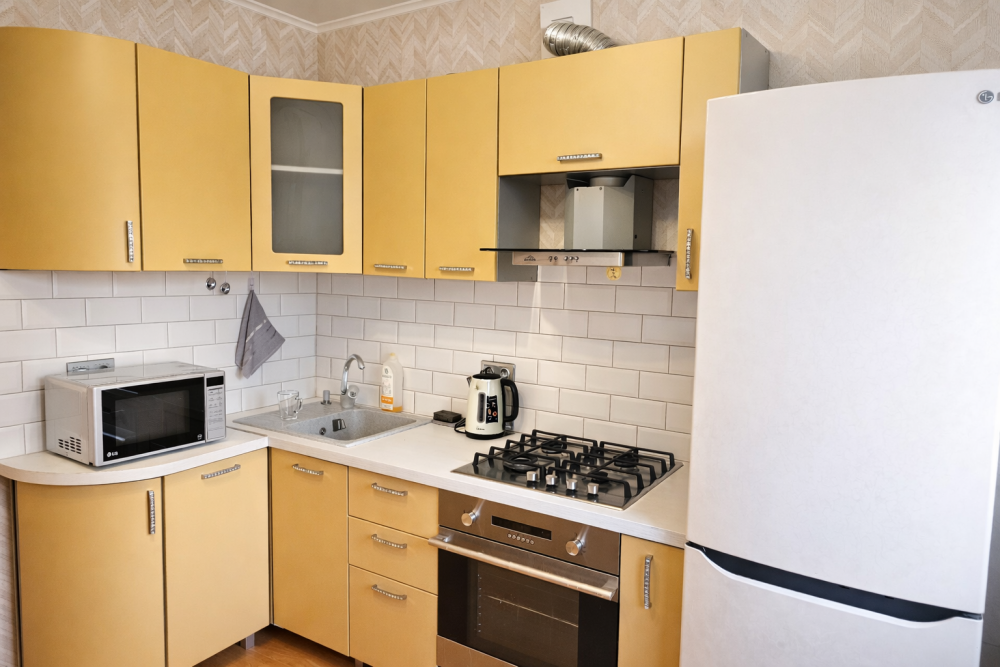• Кухня с техникой и посудой (холодильник, плита, микроволновка, чайник, духовой шкаф)