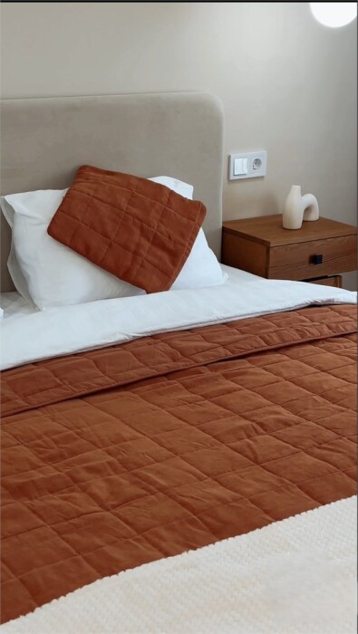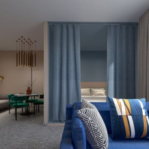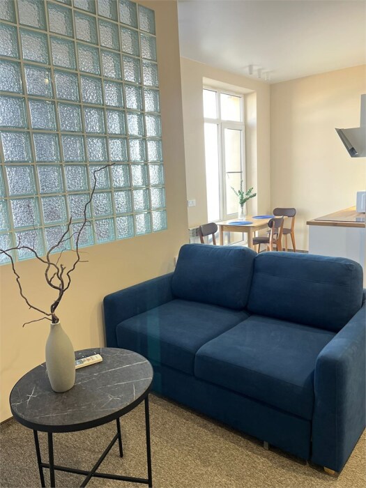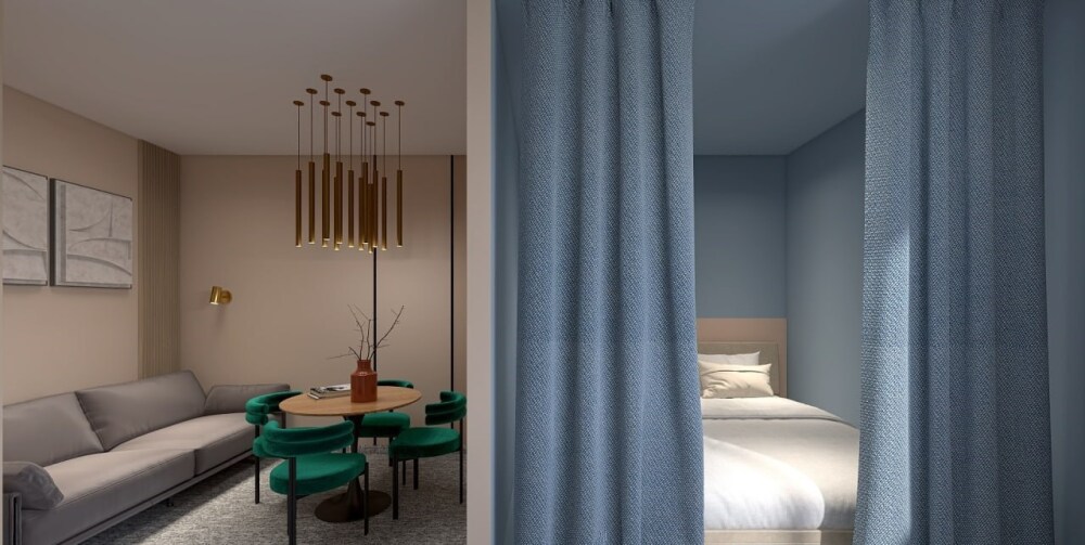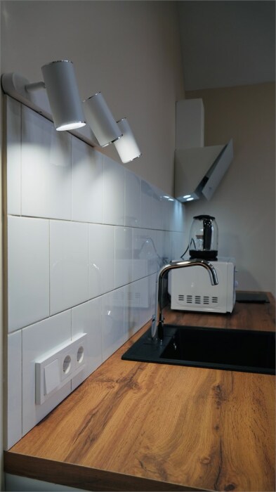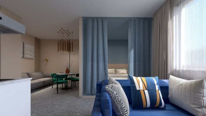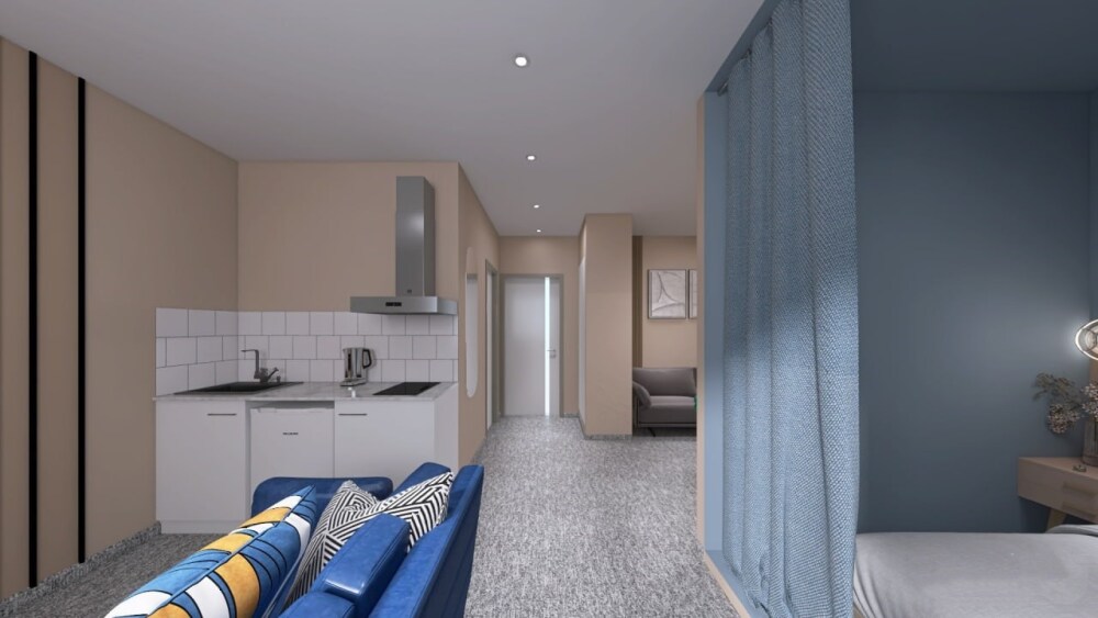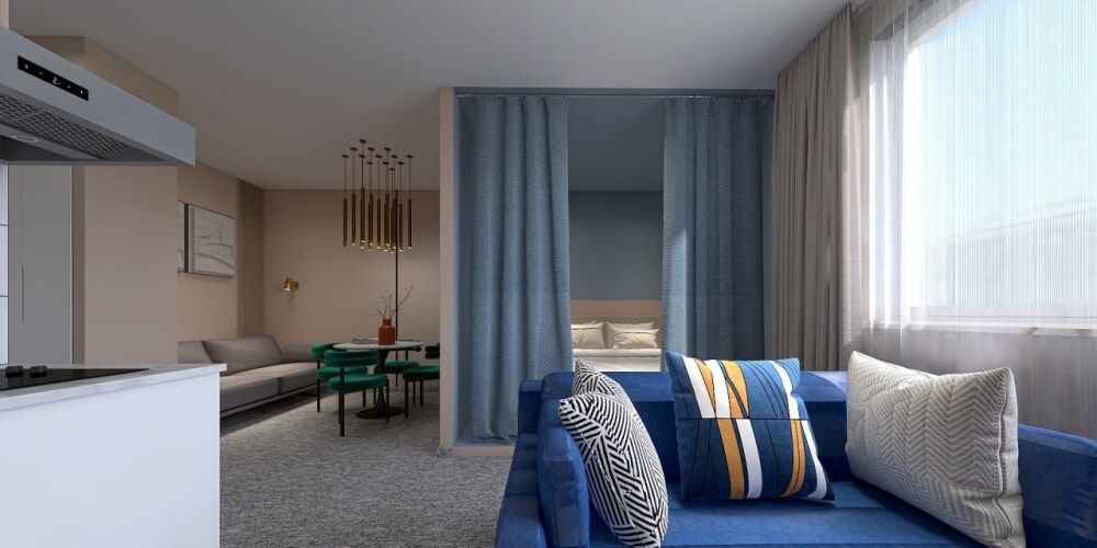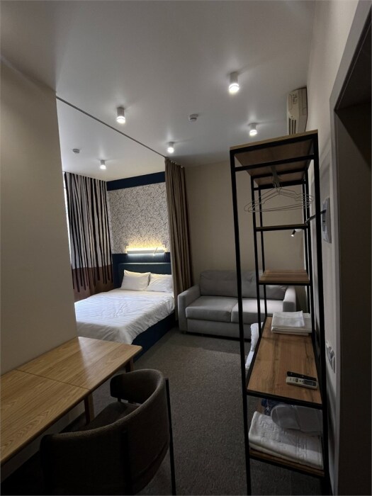 Однокомнатные апартаменты площадью 35 кв. м оснащены одной двуспальной кроватью размера queen-size. В номере имеется оборудованная мини-кухня, необходимая посуда и рабочее место. Отель предоставляет постельное бельё премиум-класса и косметические средства.