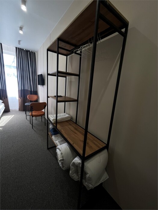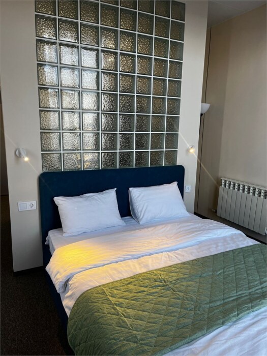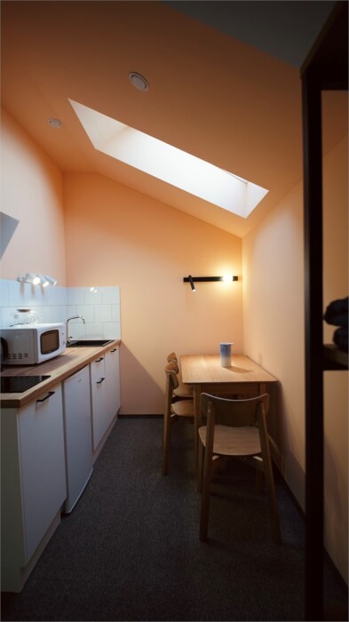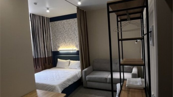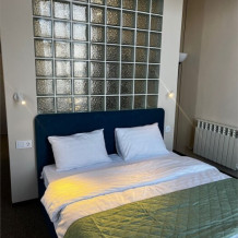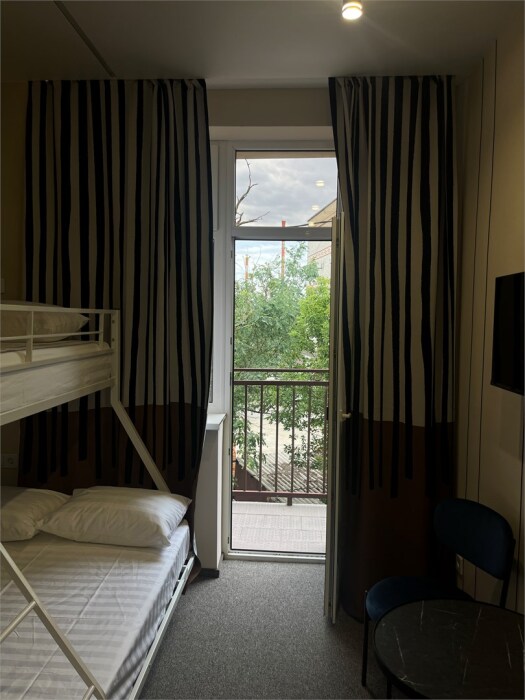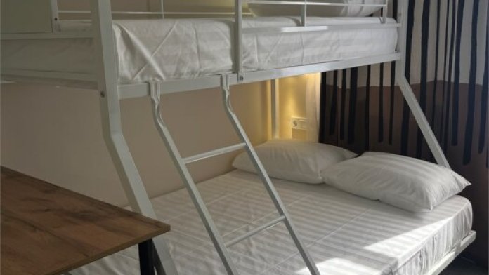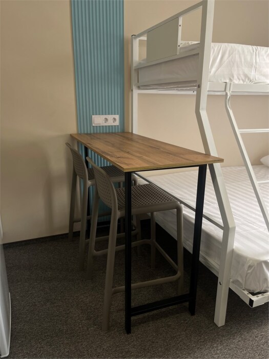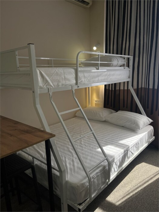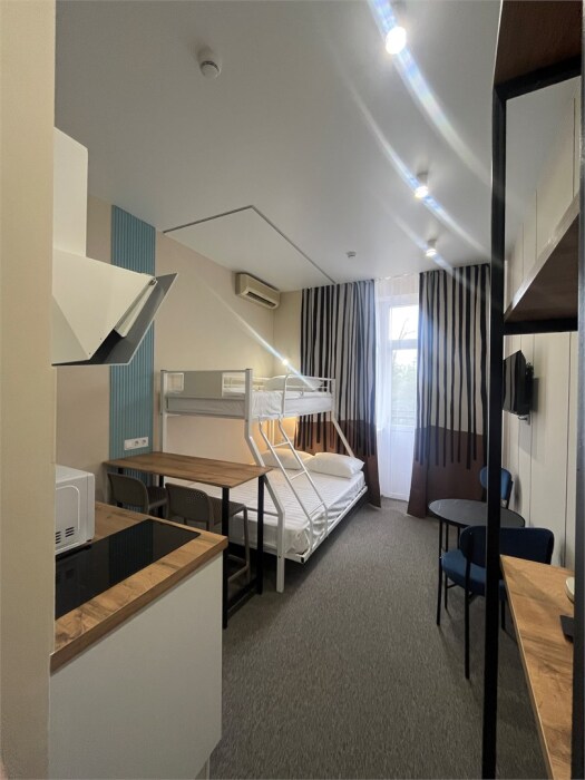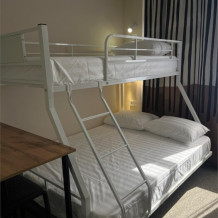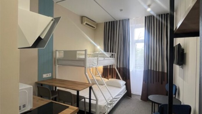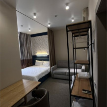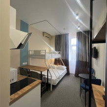 Однокомнатный номер площадью 15 кв. м. оснащён одной двухъярусной кроватью. В номере также есть оборудованная мини-кухня, необходимая посуда для приготовления пищи и пространство для работы. Гостей отеля порадует премиальное постельное бельё и косметические принадлежности. Один ребёнок до 6 лет - можно без отдельного спального места.