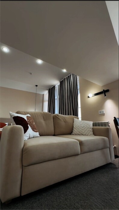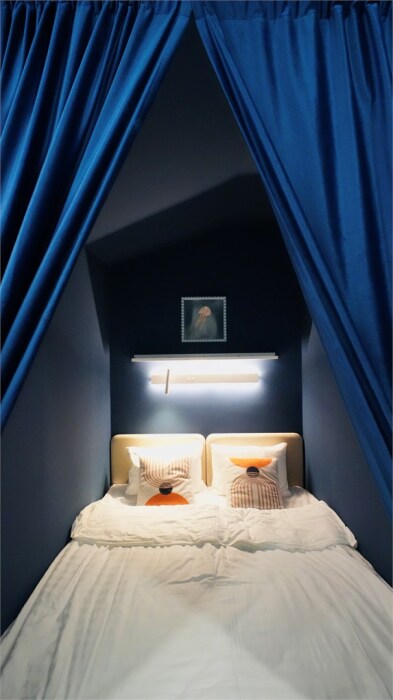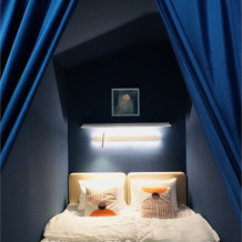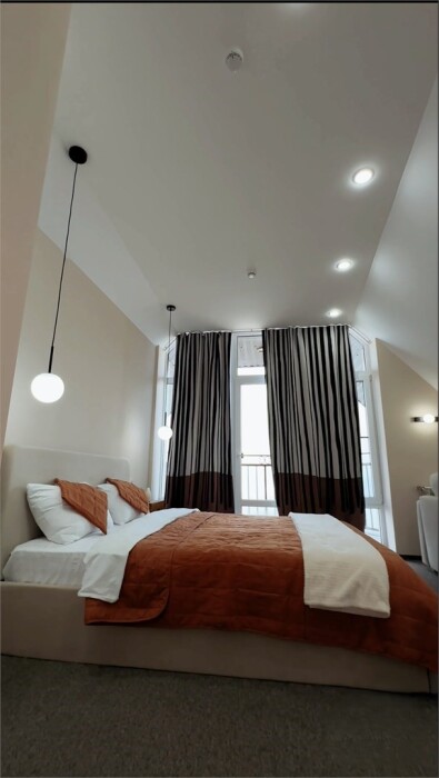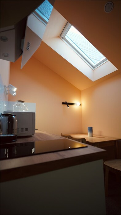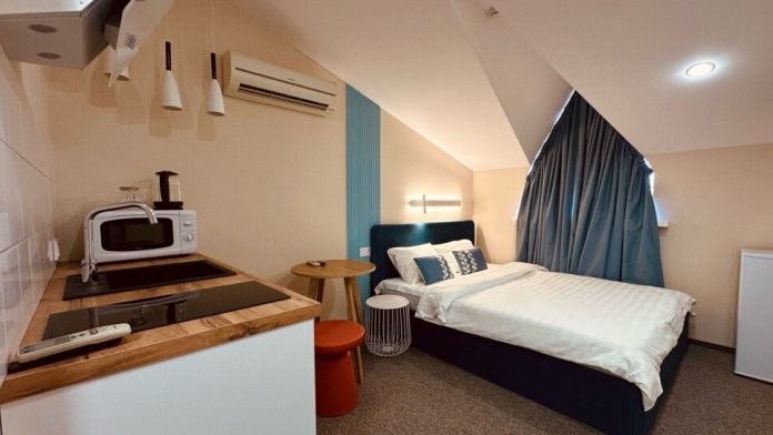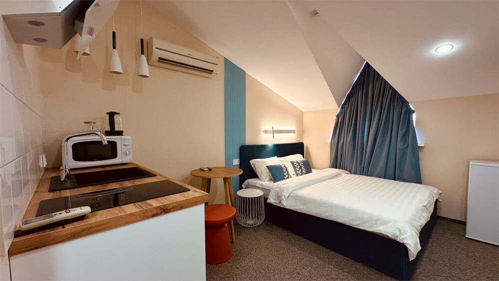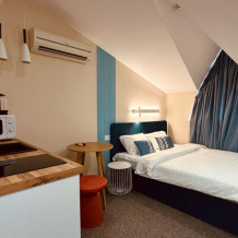 Мансардные однокомнатные апартаменты площадью 25 кв. м оснащены одной двуспальной кроватью размера queen-size. В номере имеется оборудованная мини-кухня, необходимая посуда и рабочее место. Отель предоставляет постельное бельё премиум-класса и косметические средства. Один ребёнок до 6 лет - можно без отдельного спального места.