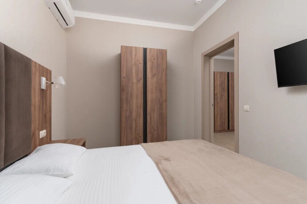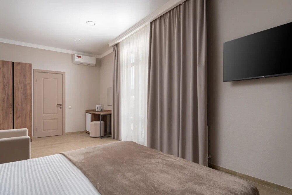 двуспальная кровать с ортопедическим матрасом и мягким изголовьем, кресло-кровать (доп.место оплачивается отдельно), прикроватные тумбочки, шкаф, сейф, внутренний телефон, телевизор Smart TV, холодильник, электрический чайник, сплит система, интернет, оборудованное рабочее место, высокосортной бесплатный Wi-Fi. В ванной комнате: классический душ, санузел, умывальник, фен, комплект полотенец. Имеются все банные и гигиенические принадлежности: шампунь и кондиционер для волос, гель для душа, одноразовое мыло.
