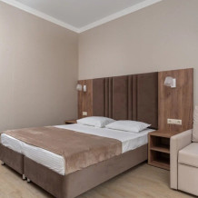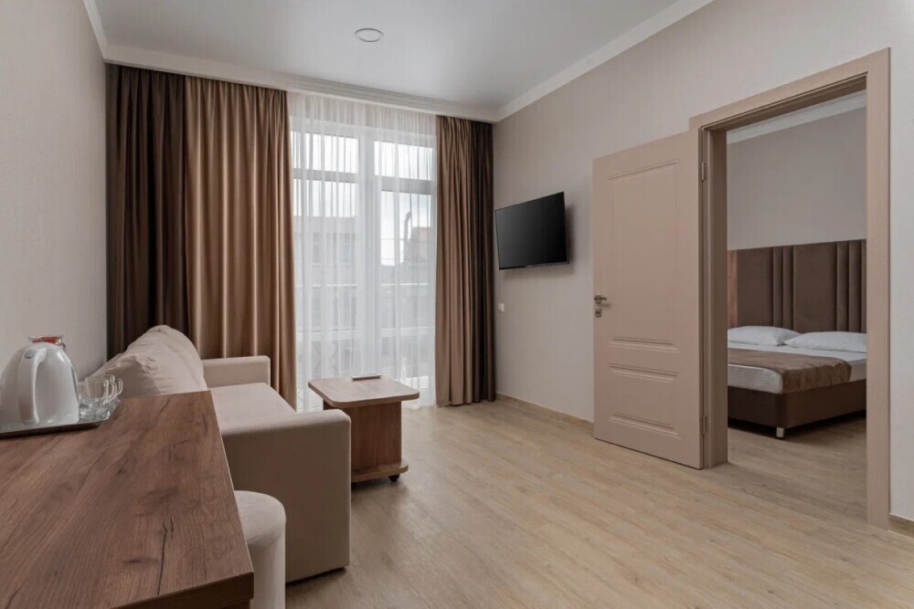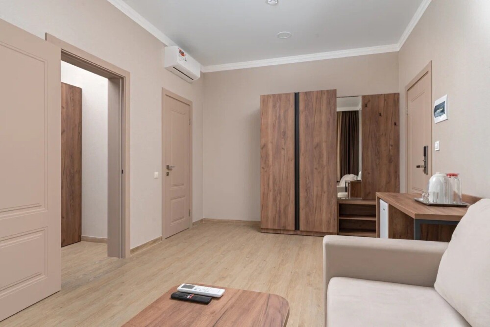 Двухкомнатный семейный номер общей площадью 32м². Просторный номер поделен на спальную и гостиную зоны. В спальне: двуспальная кровать с ортопедическим матрасом и мягким изголовьем, прикроватные тумбочки, телевизор Smart TV, сплит-система, шкаф; в гостиной: большой двуспальный раскладной диван с ортопедическим основанием, телевизор Smart TV, шкаф, журнальный столик, сплит-система, сейф, внутренний телефон, холодильник, электрический чайник. Здесь можно разместиться большой семьей с детьми или компанией из 4 человек.