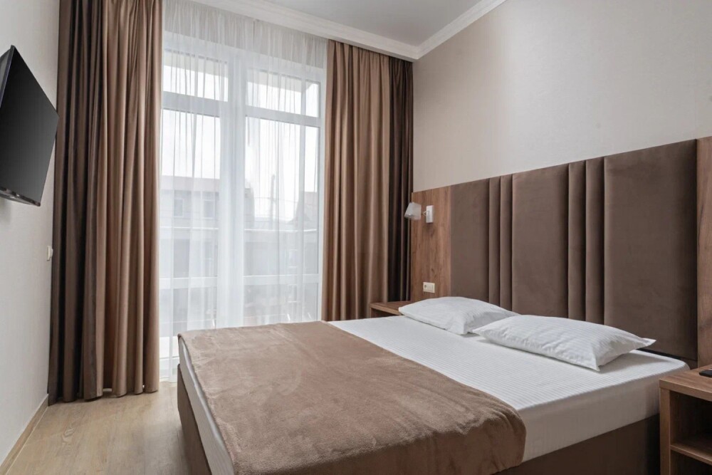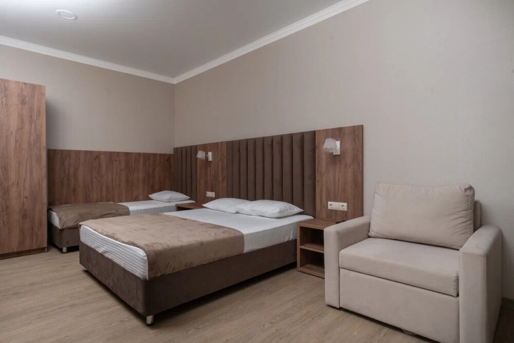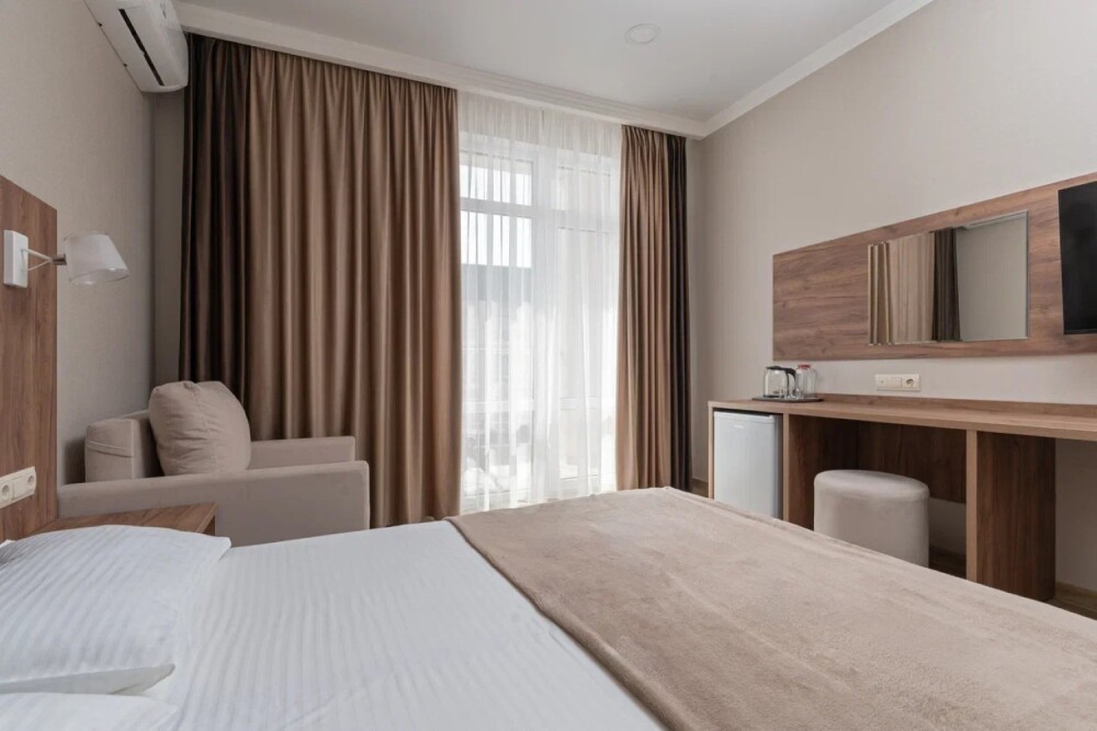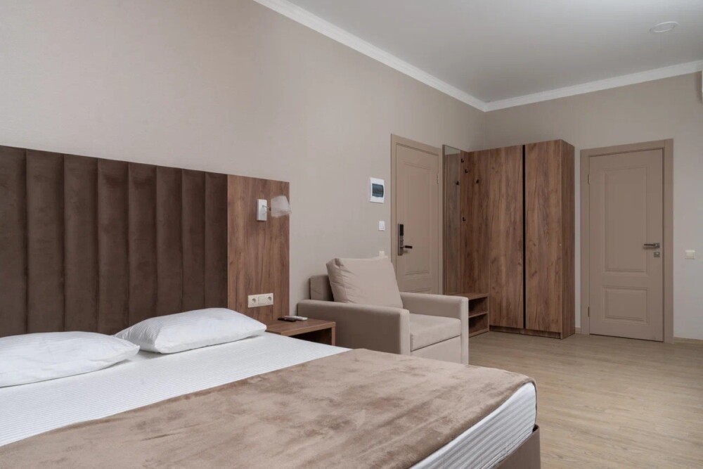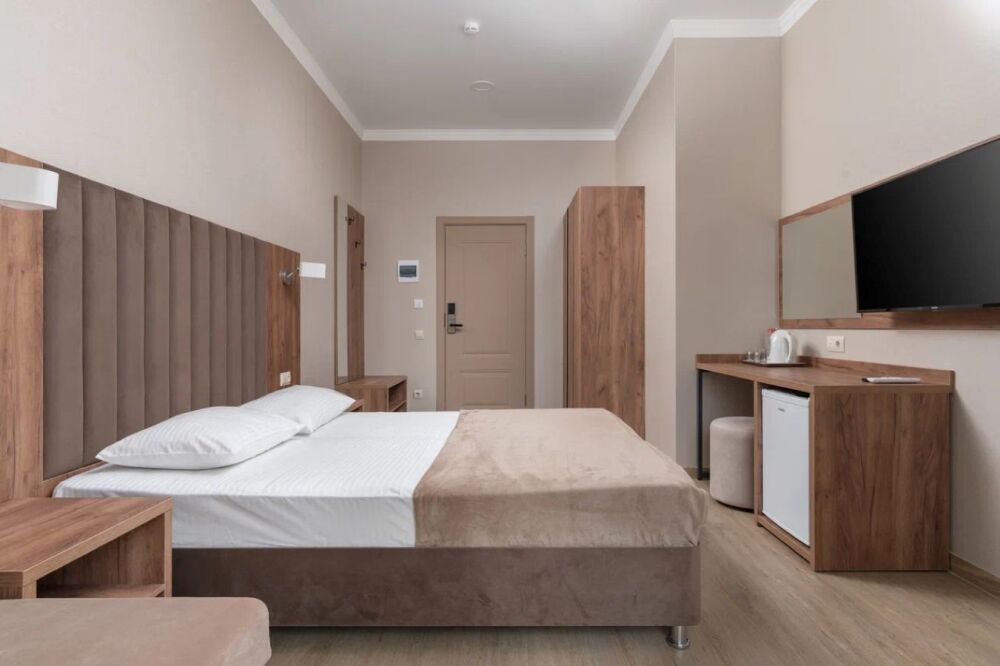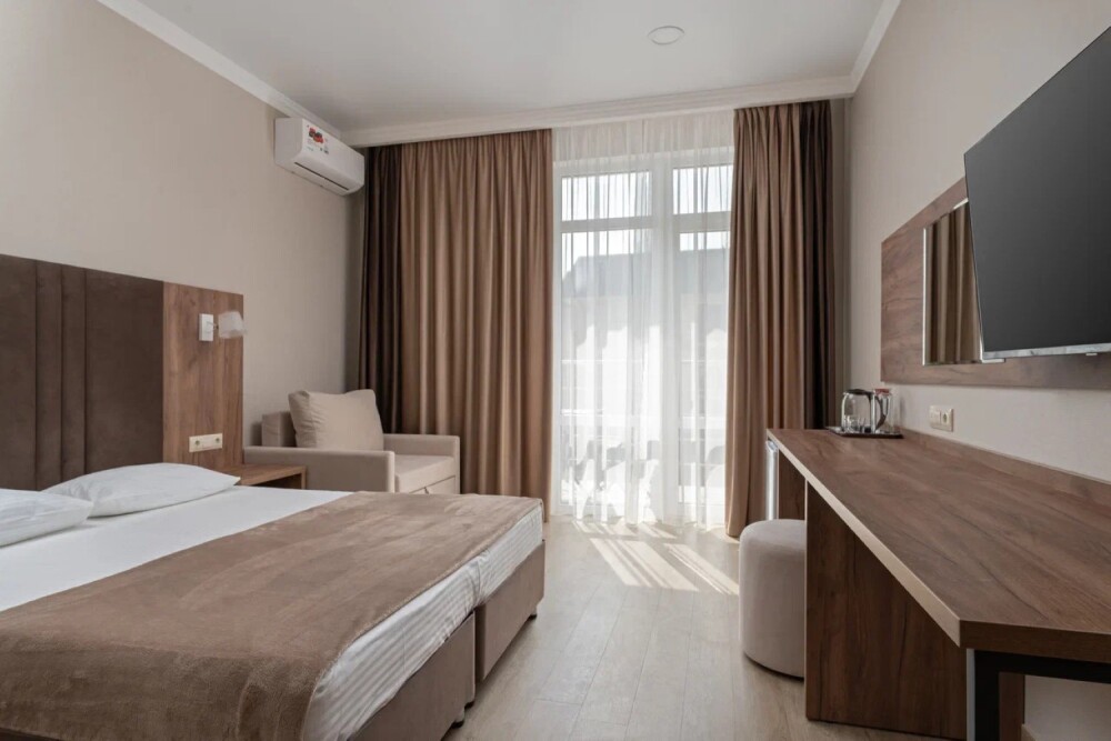 Гостиница состоит из одного трехэтажного корпуса. Гости могут забронировать номера категорий Комфорт и Семейный. В каждом из них есть все необходимое для комфортного проживания: двуспальная кровать с ортопедическим матрасом и мягким изголовьем, прикроватные тумбочки, шкаф, сейф, внутренний телефон, телевизор Smart TV, холодильник, электрический чайник, сплит система, интернет, оборудованное рабочее место, высокосортной бесплатный Wi-Fi. В ванной комнате: классический душ, санузел, умывальник, фен, комплект полотенец. Имеются все банные и гигиенические принадлежности: шампунь и кондиционер для волос, гель для душа, одноразовое мыло. На каждом этаже есть утюг и гладильная доска. В некоторых номерах есть балкон.