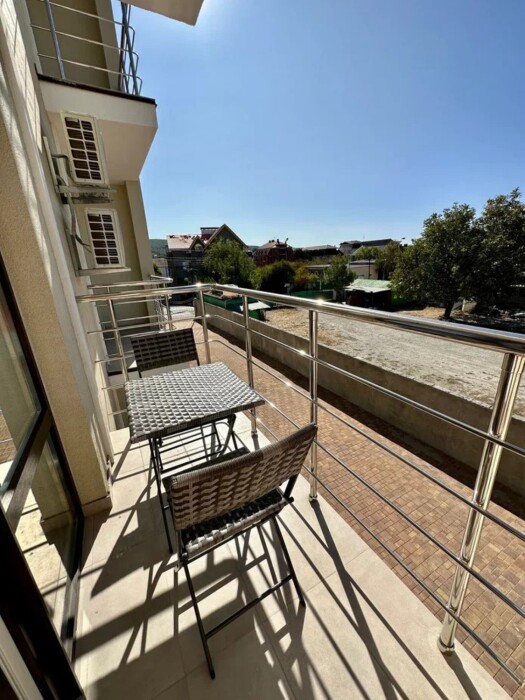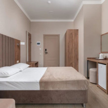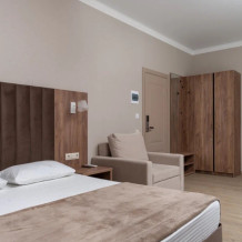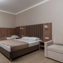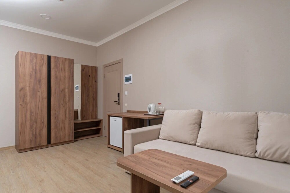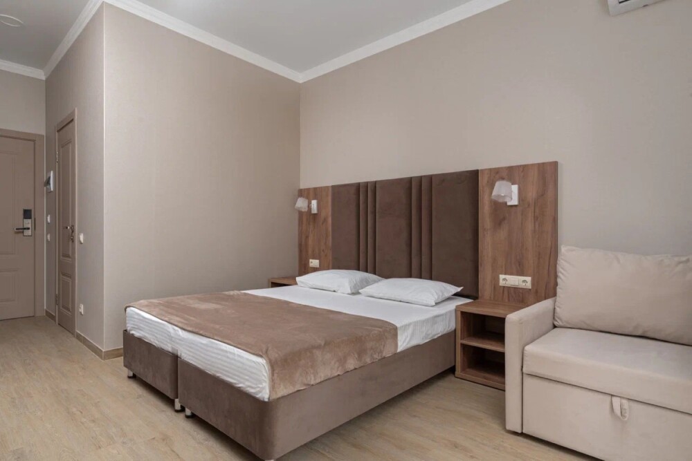 Номер, площадью 27 м² оснащен: двуспальная кровать с ортопедическим матрасом и мягким изголовьем, односпальная кровать, кресло-кровать (доп.место оплачивается отдельно), прикроватные тумбочки, шкаф, сейф, внутренний телефон, телевизор Smart TV, холодильник, электрический чайник, сплит система, интернет, оборудованное рабочее место, высокосортной бесплатный Wi-Fi.