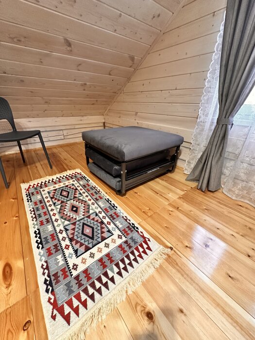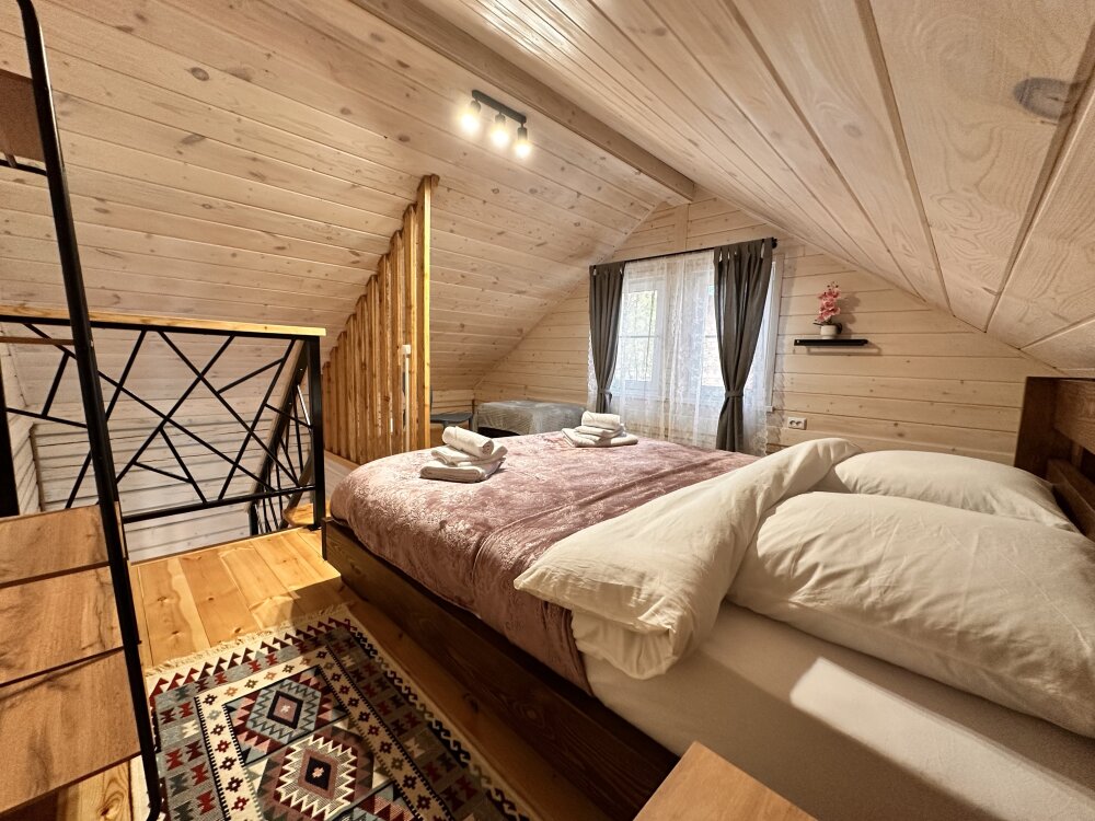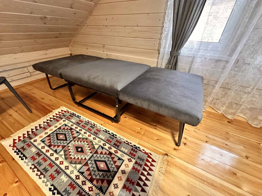 На 2 этаже: Двуместная кровать 160*200 и дополнительное односпальное место - раскладная кровать-пуф 80*200.
