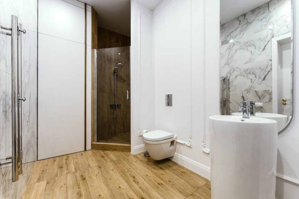 - Душевая кабина, выполнена в деревяном стиле;