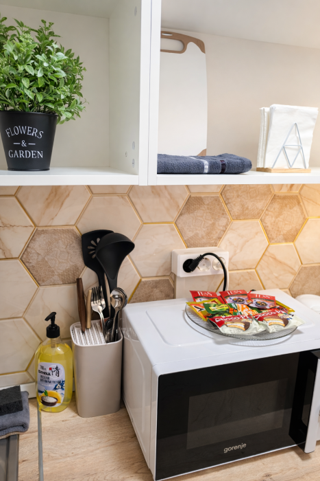 • Кухня с техникой и посудой (холодильник, плита, микроволновка, чайник)