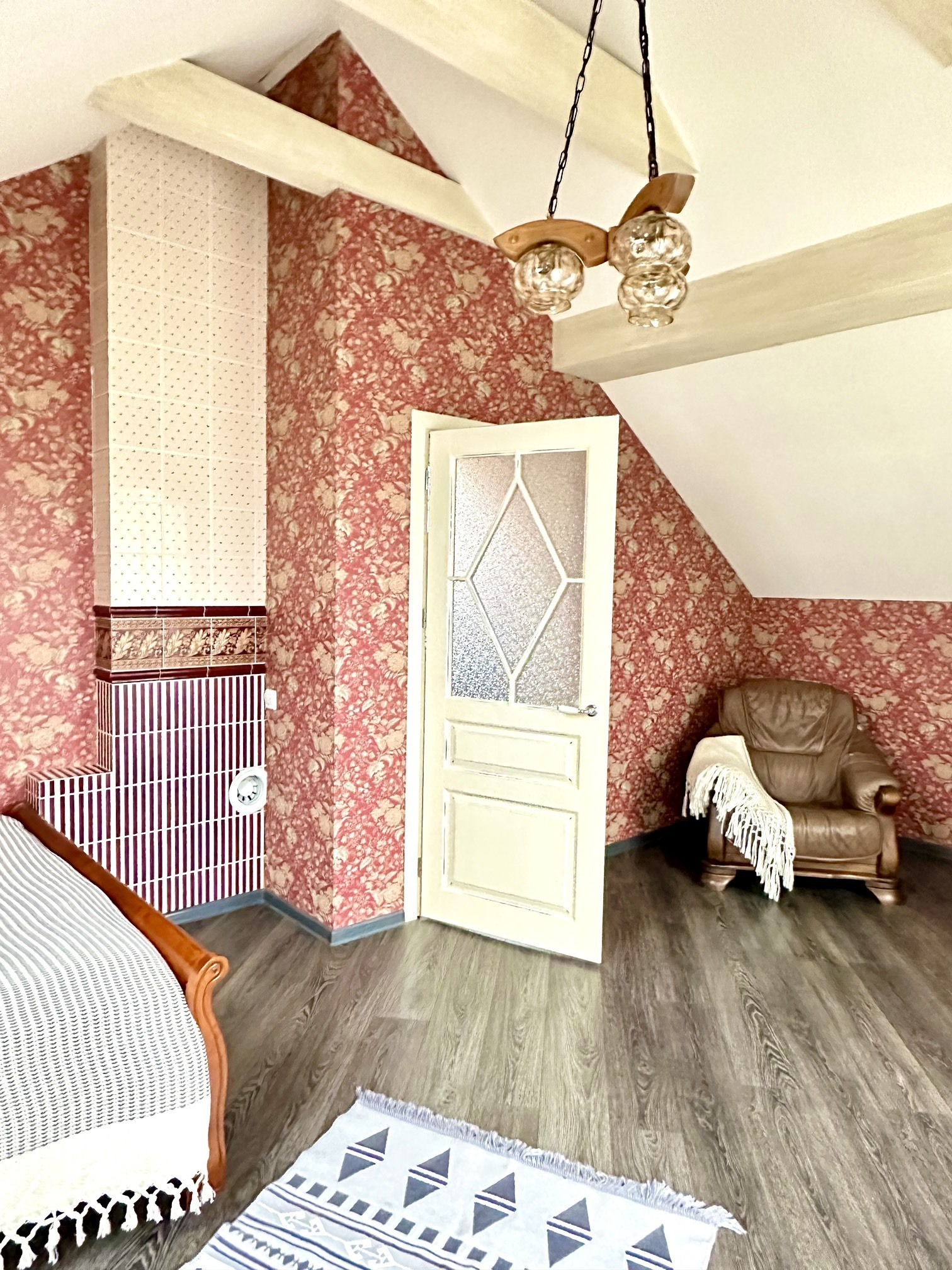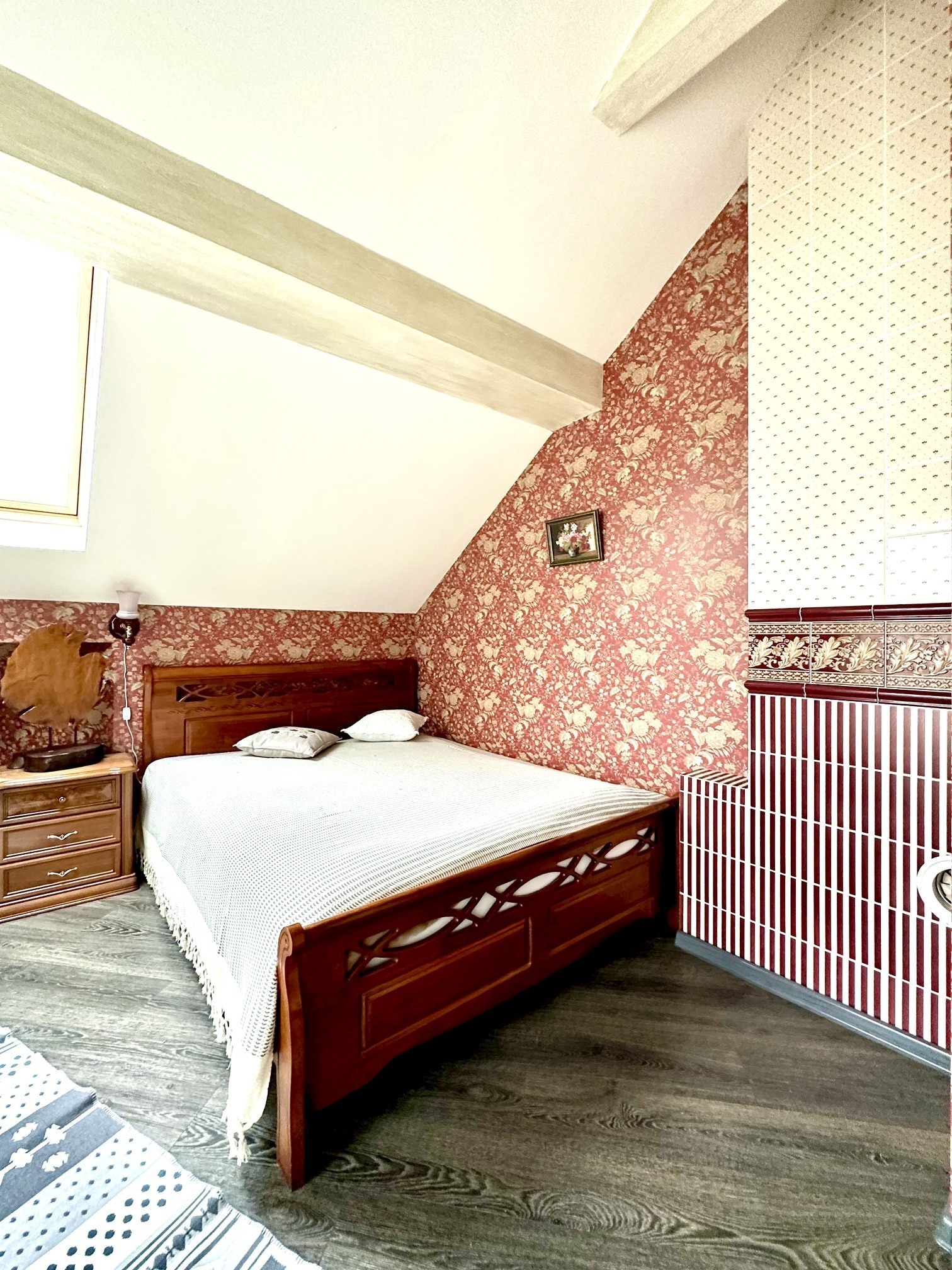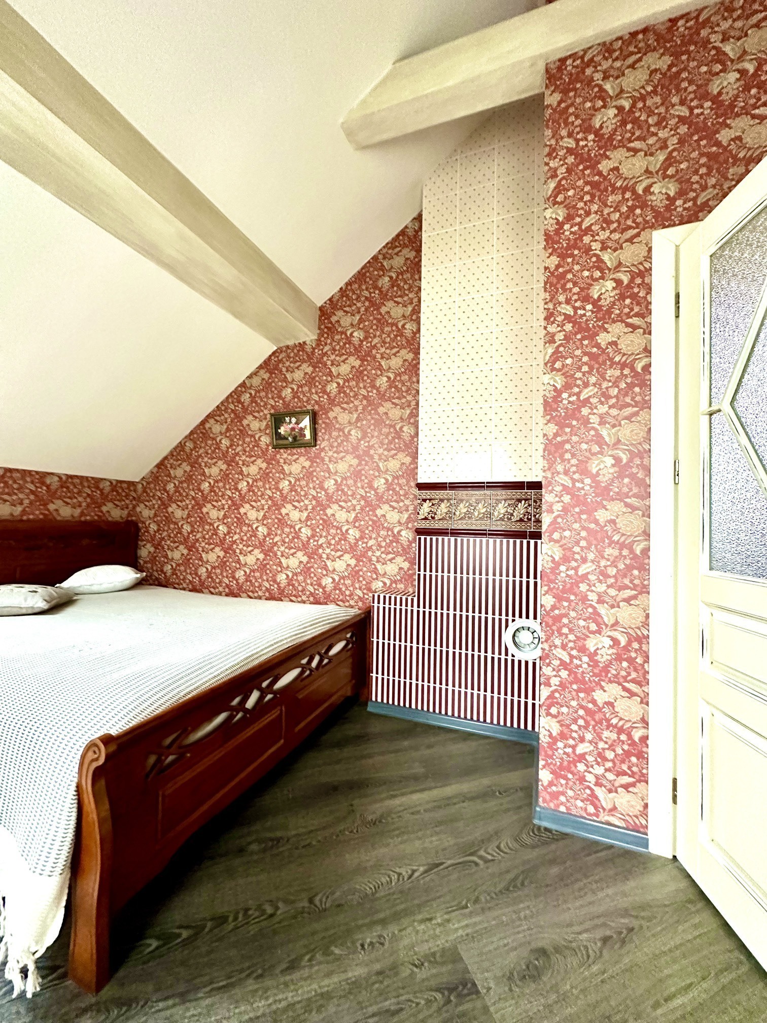 2 этаж: 1 спальня с печью и большой двуспальной кроватью. Индивидуальный санузел с ванной, мини- балкон. 2 спальня: двуспальная кровать, ТВ.