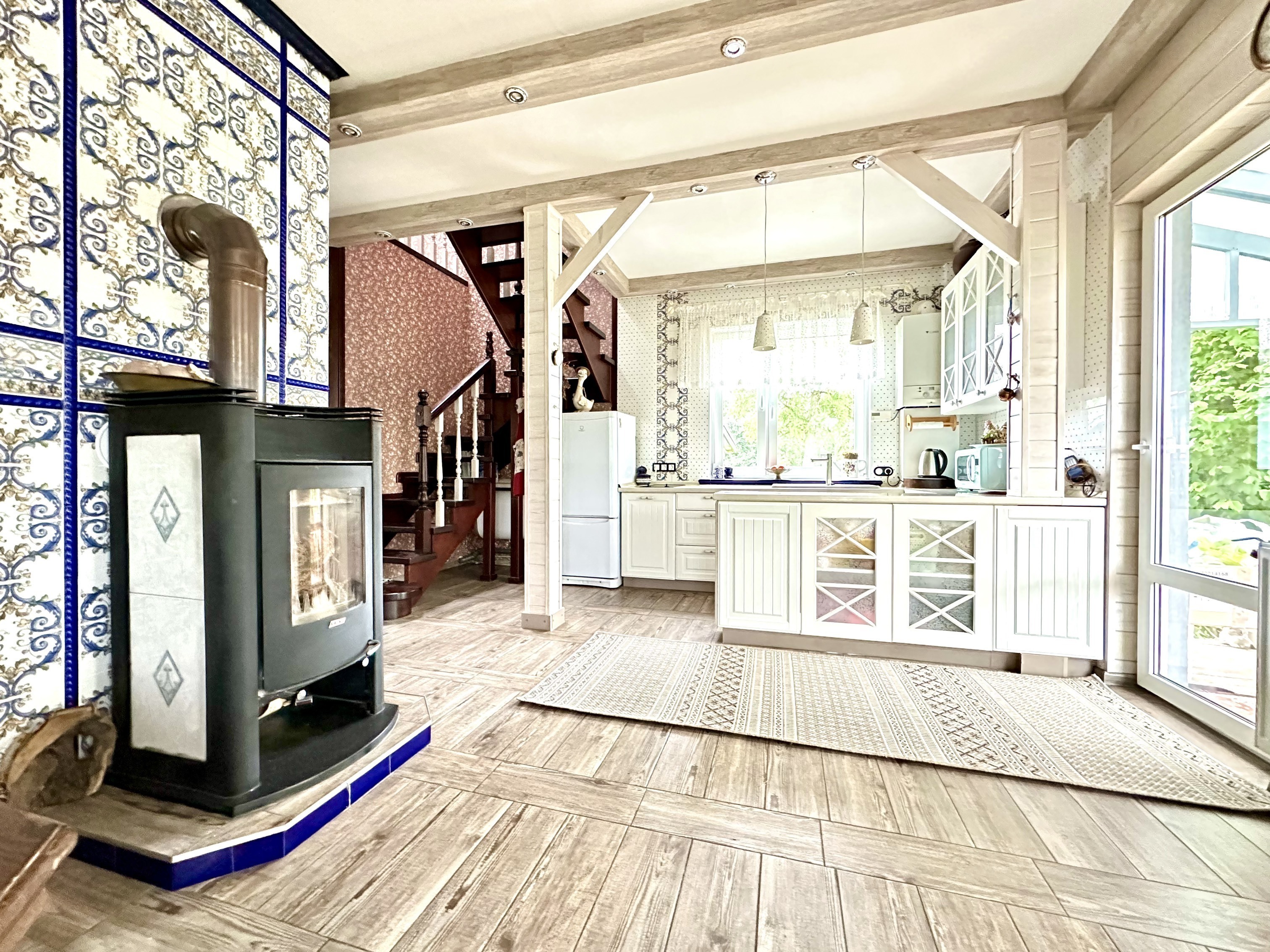 1 этаж: просторная светлая гостиная с мягкой мебелью, совмещенная с кухней. В гостиной раскладной диван. Гостевой санузел на этаже.