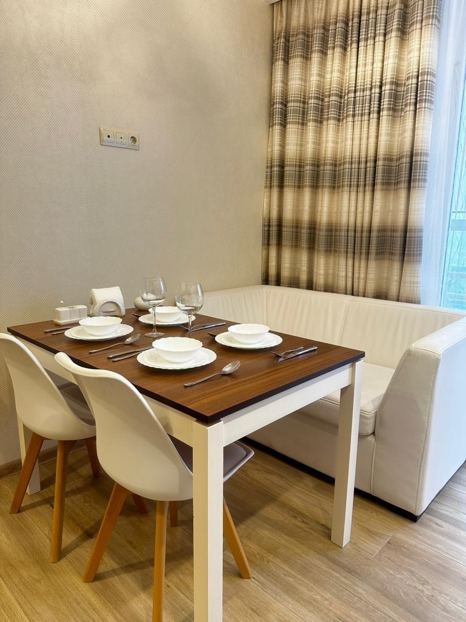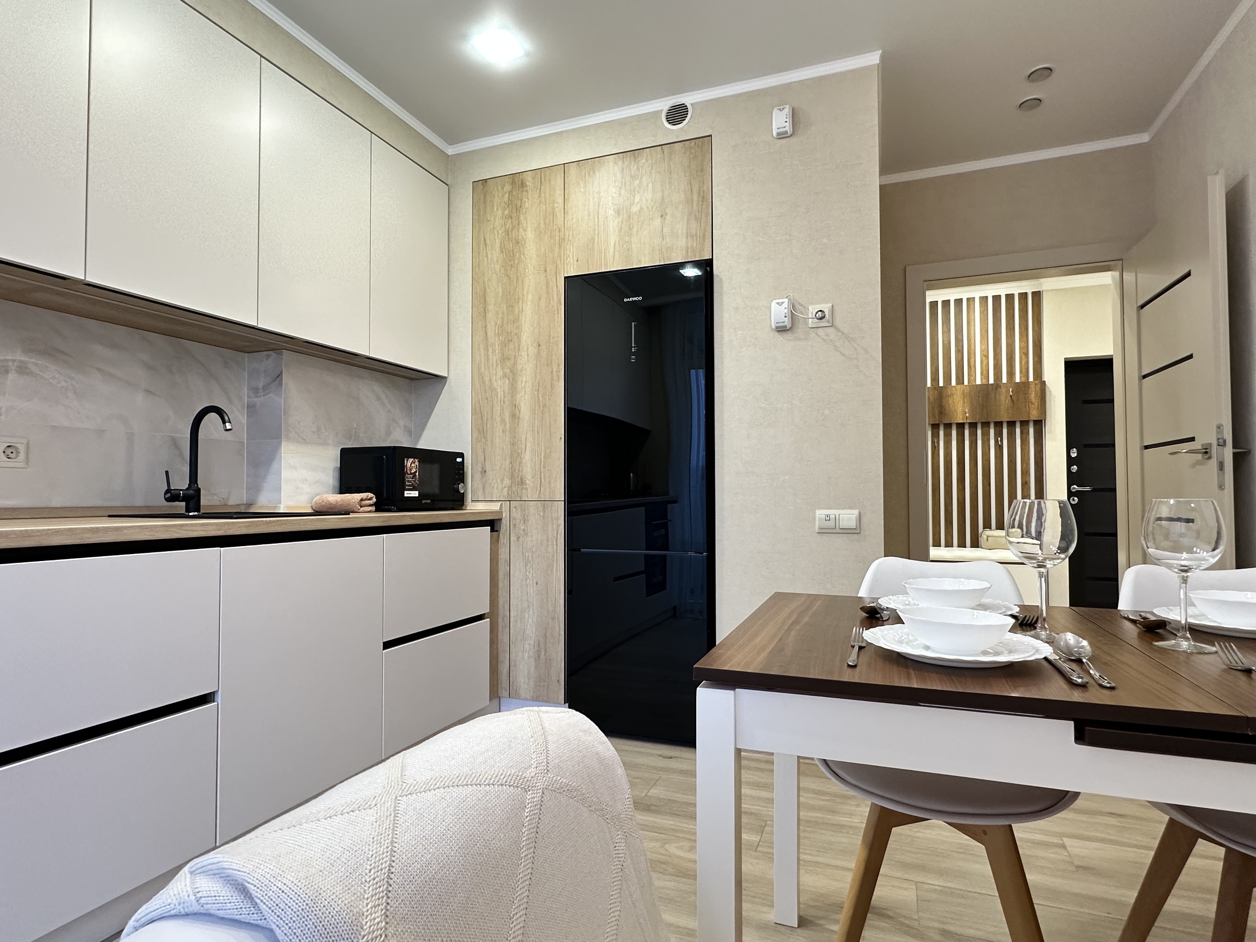 - Отдельная просторная кухня, оборудована всем необходимым для комфортного приема и приготовления пищи. Есть холодильник, плита, электрический чайник, микроволновая печь, духовой шкаф