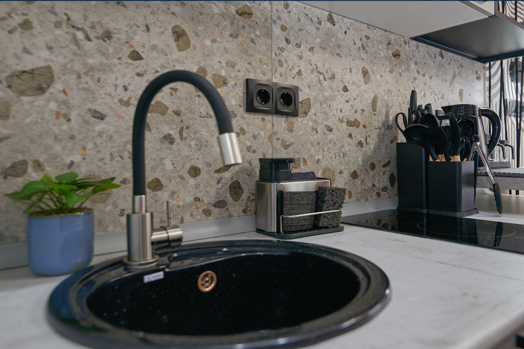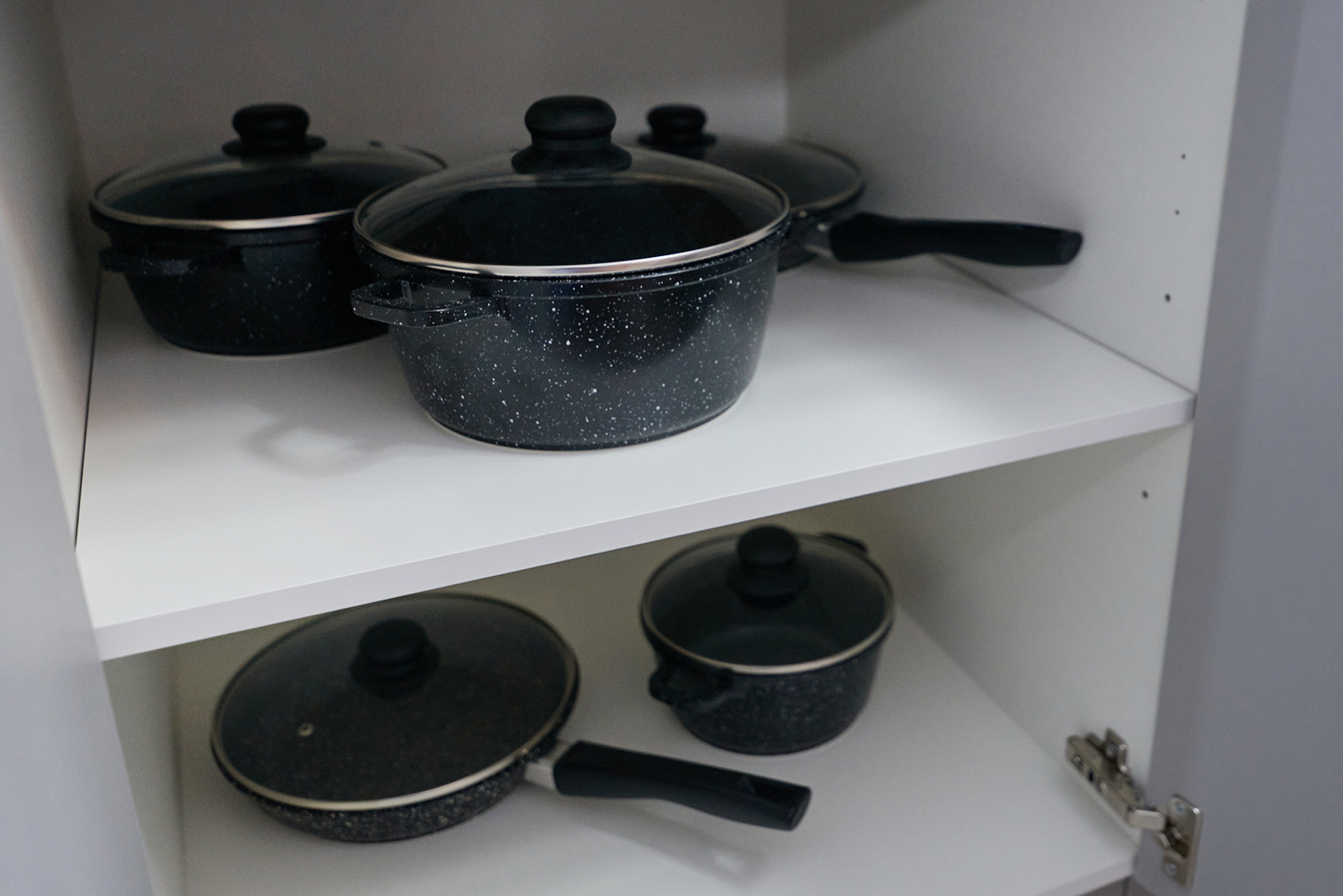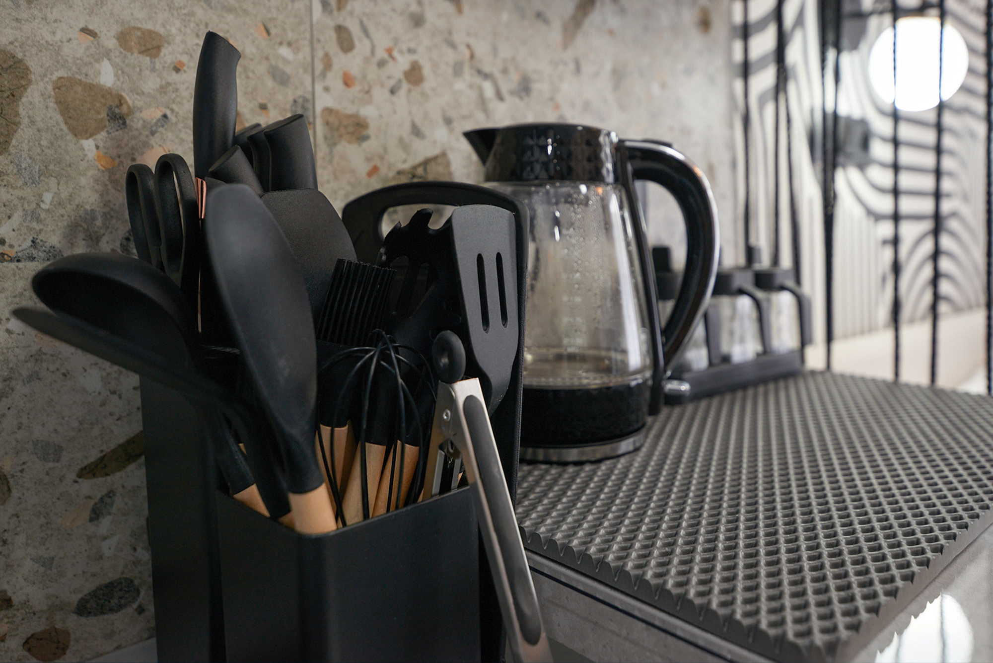 Полностью оборудованная кухонная зона (плита, чайник, посуда).