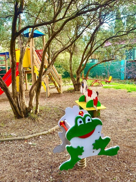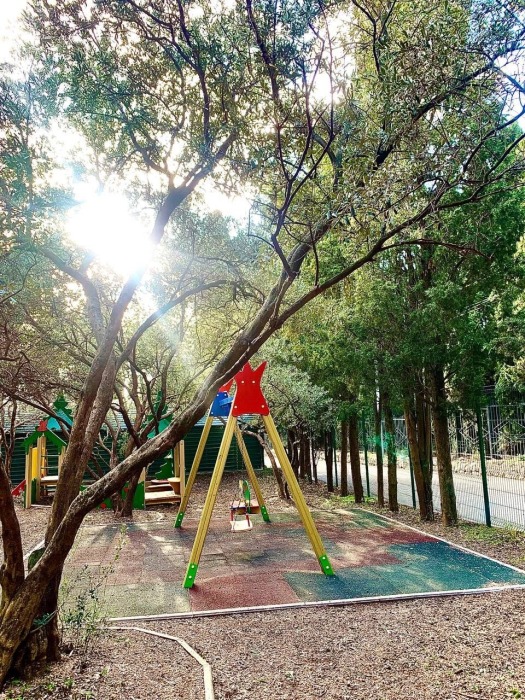 Гостиница приспособлена для семейного отдыха, отдыха с детьми. Это семейные номера, различные экскурсии, детское питание, детская площадка. Площадка расположена в 50 метрах от гостиницы, огорожена. Во время пребывания в гостиничном комплексе у детей есть возможность поиграть на площадке. Площадка просторная, часть ее имеет специальное покрытие, в местах без покрытия - грунт. Здесь установлено современное оборудование для детей разного возраста. Несколько разновидностей качелей и качалок, горки, домик, для детей постарше - спортивные комплексы. Есть несколько лавочек, где можно посидеть. На площадке растут деревья, при желании можно укрыться в тени.