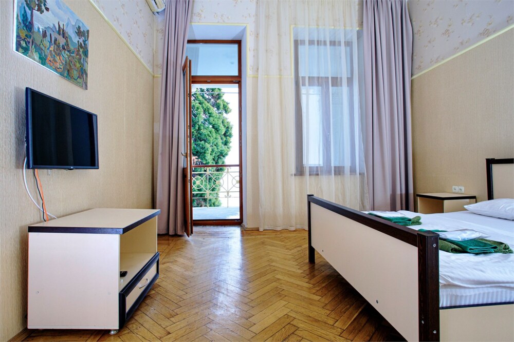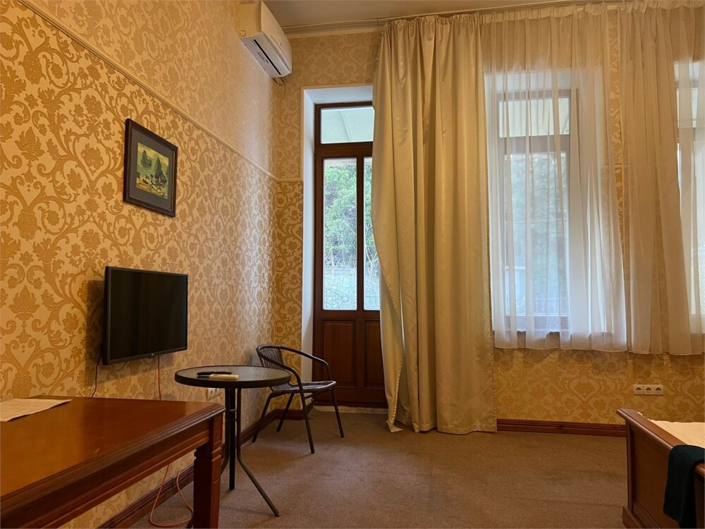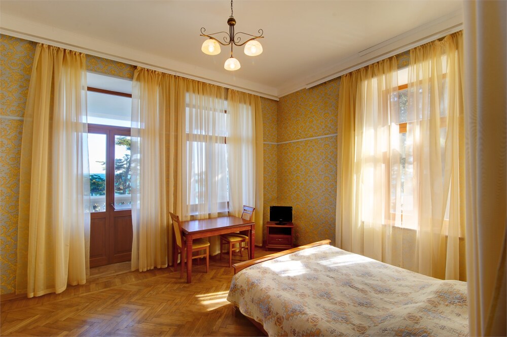 Чудесный однокомнатный номер, с романтическим местом для чаепития с видом на парк и море. Расположен в главном корпусе в 20 метрах от пляжа. Рассчитан на двух человек с возможностью установки двух дополнительных спальных мест. Номер расположен на 1 этаже и имеет отдельный вход. Смешанный аромат моря, фитонцидов хвойных деревьев и цветов. В номере прохладно даже в самый жаркий день.
