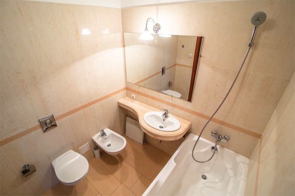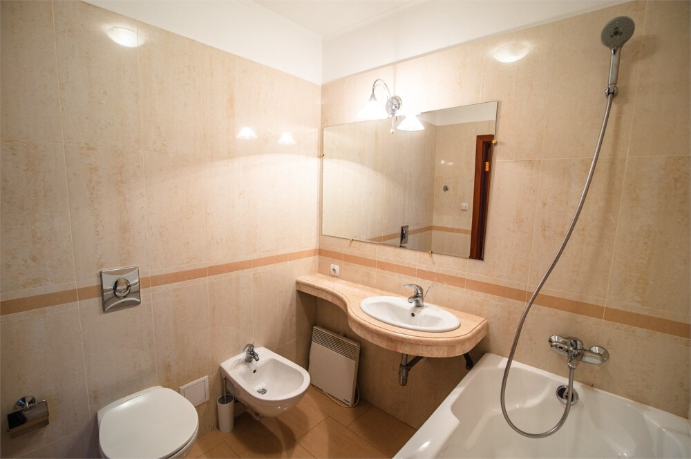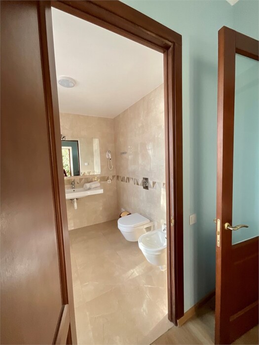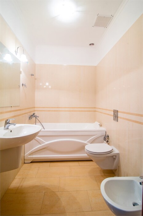 В санузлах подвесная сантехника, биде, мраморная столешница.