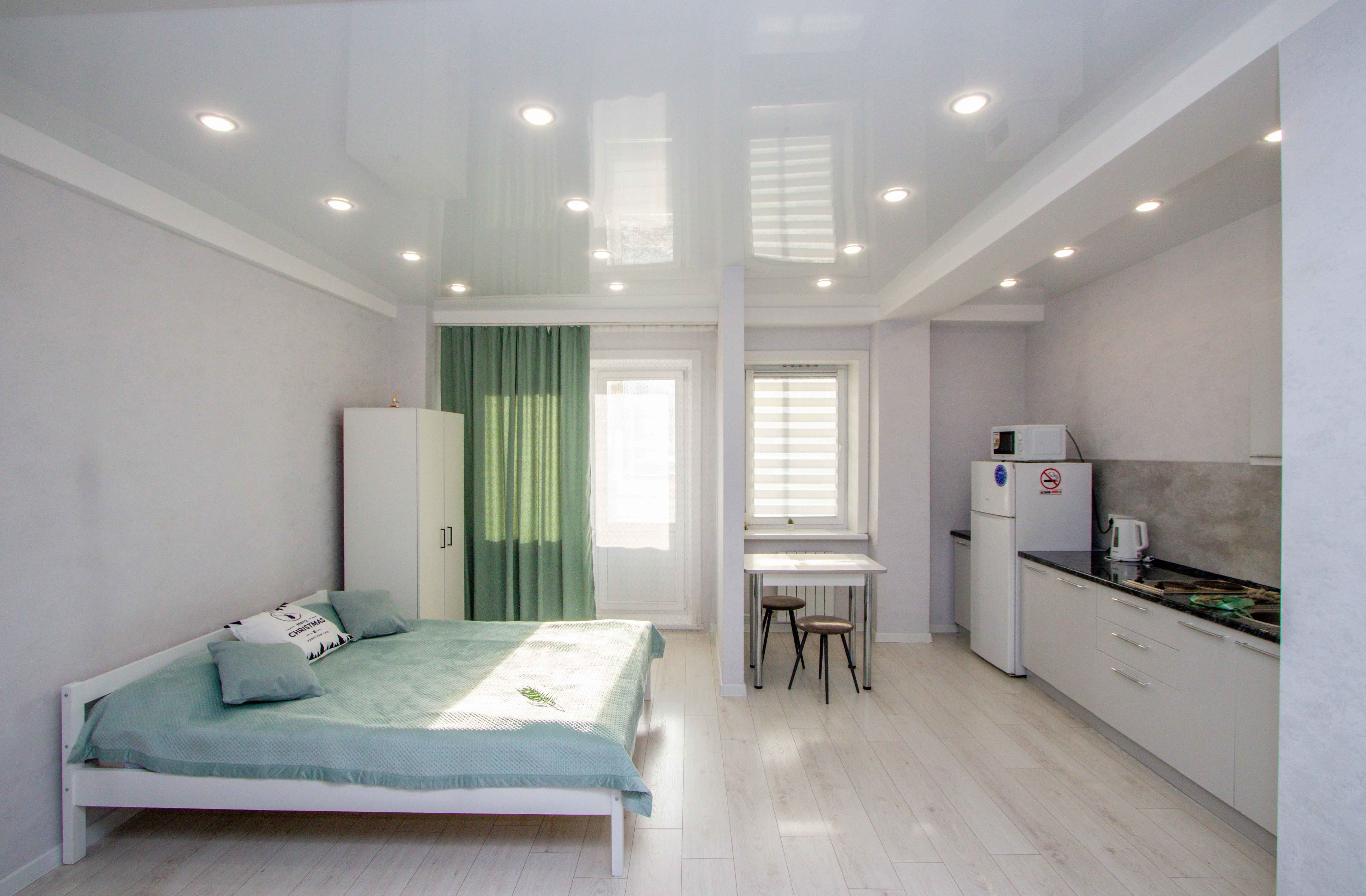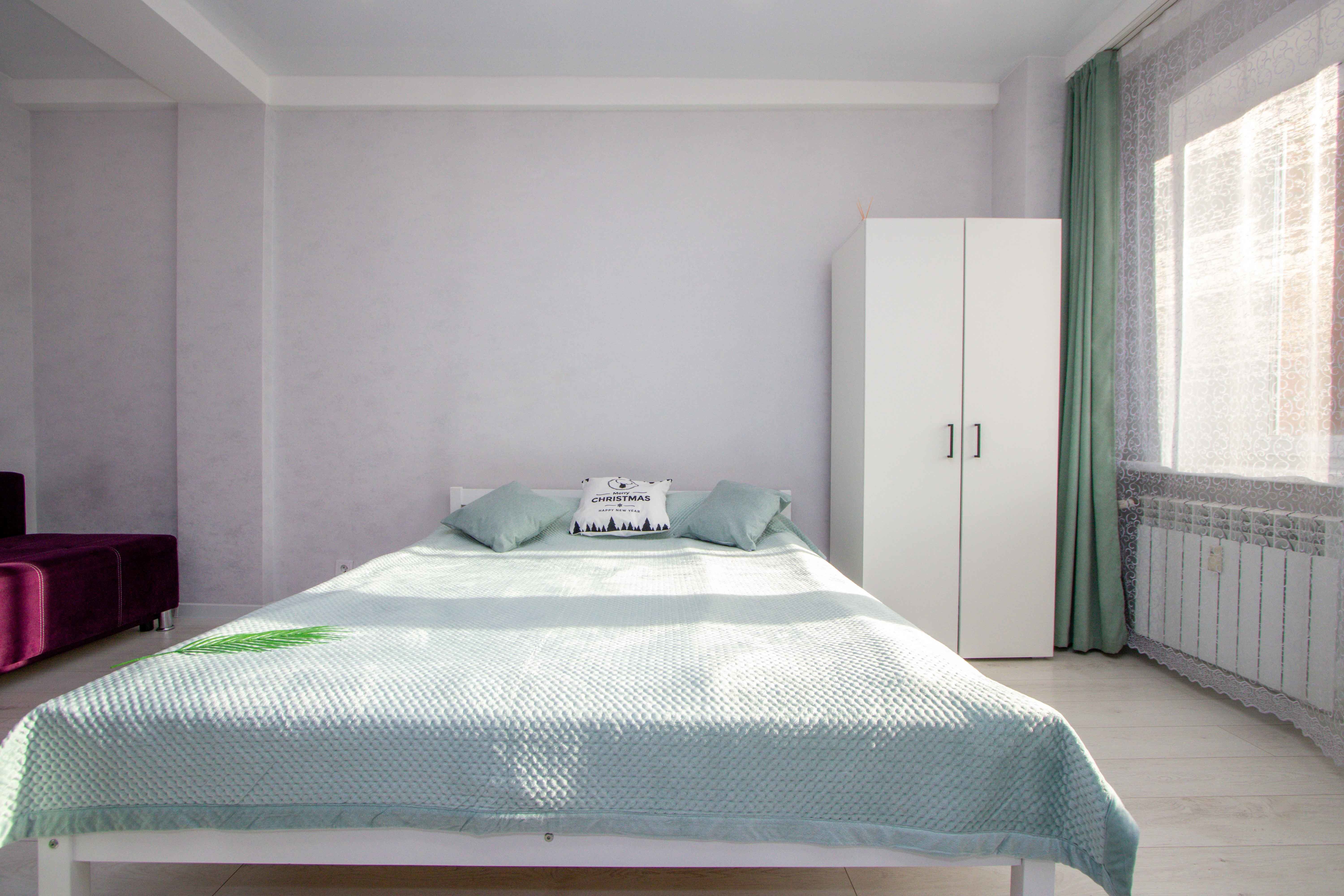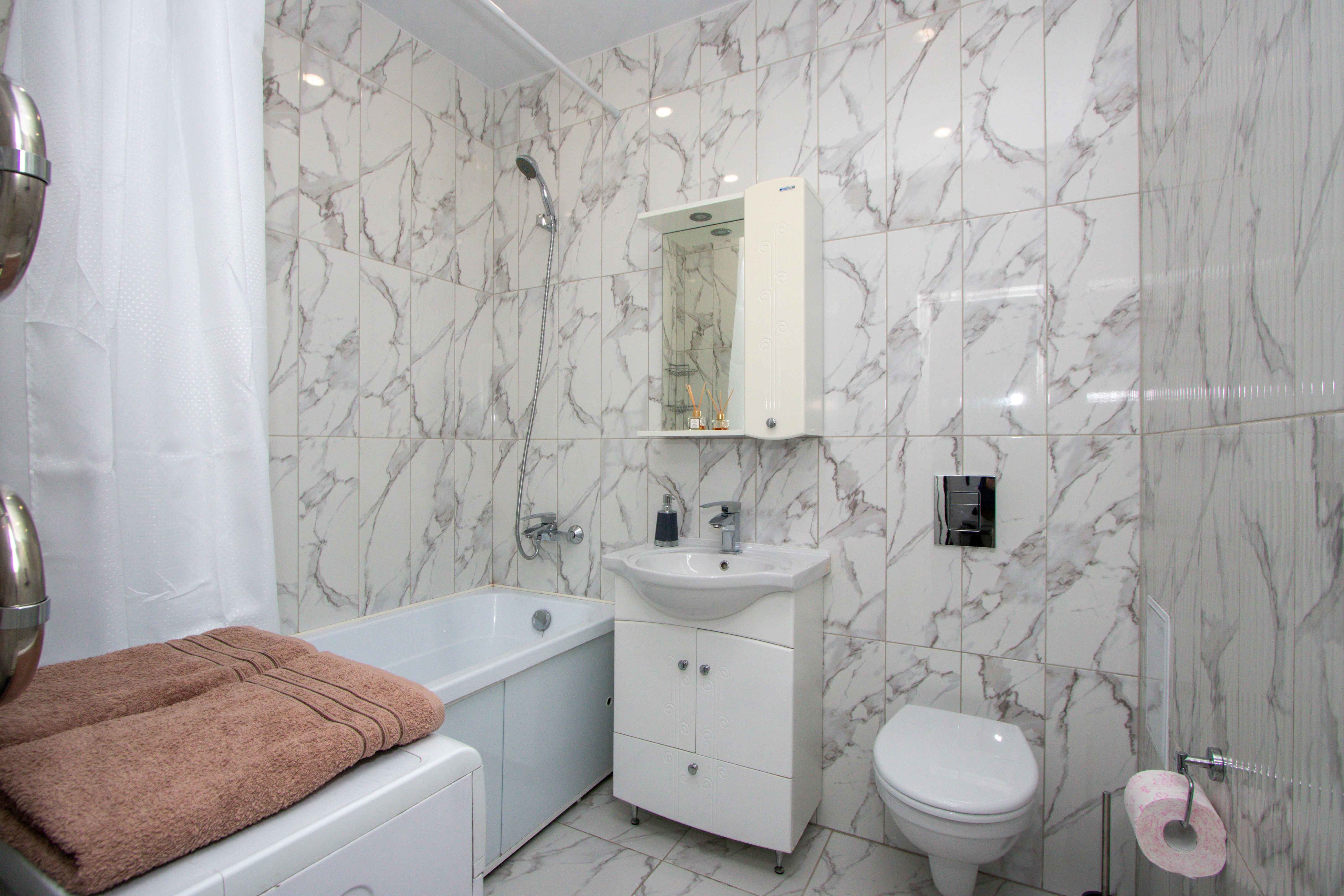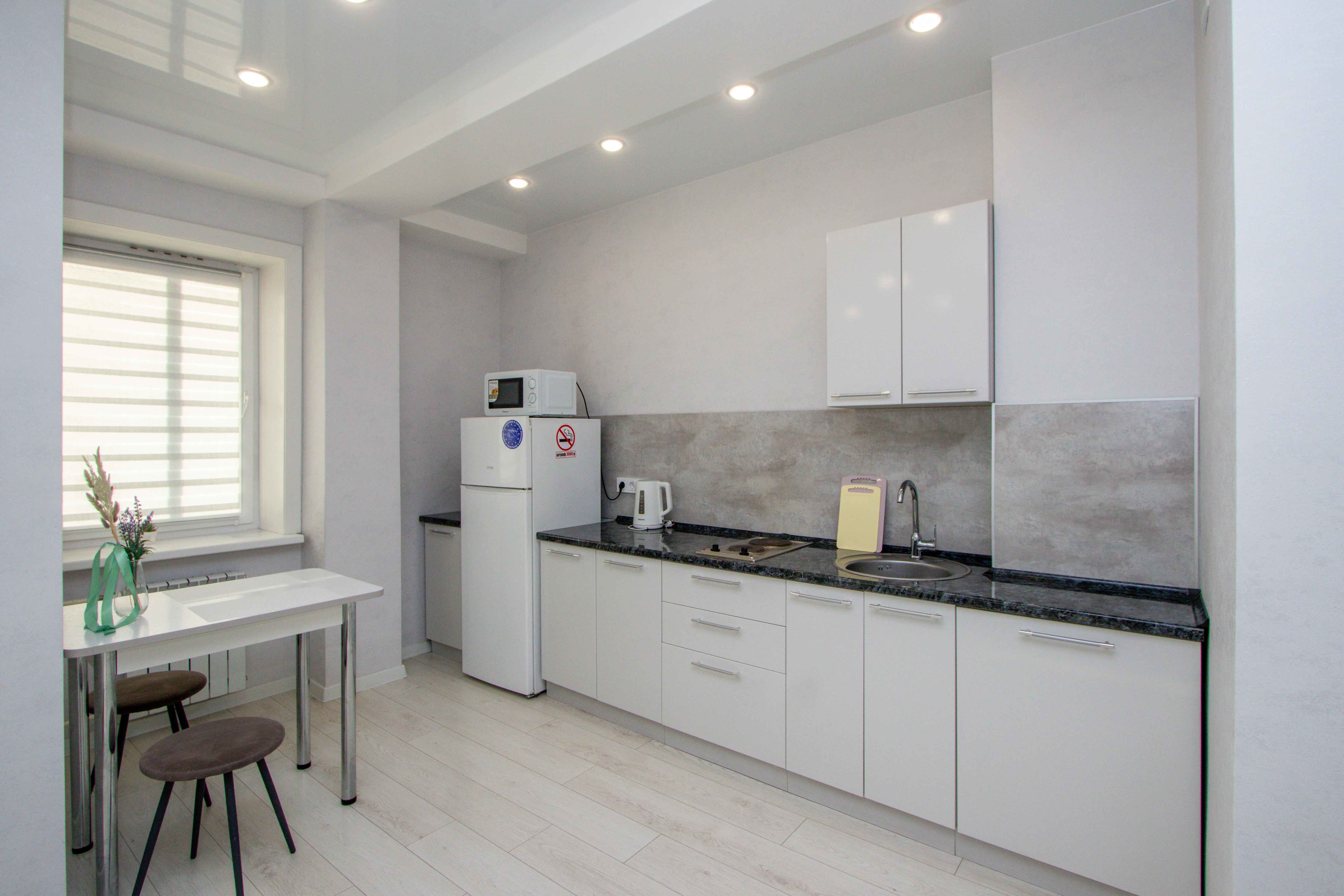 Выполнен качественный дизайнерский ремонт в светлых тонах, натяжные потолки, ламинат, кафель, новая бытовая техника, мебель. Светлая ванная под мрамор. Квартира с двуспальной кроватью, и двуспальным диваном. Диван с легкостью раскладывается, создавая два места для сна. Для проведения досуга предусмотрен ЖК-телевизор с Wi-Fi, кабельным телевидением.