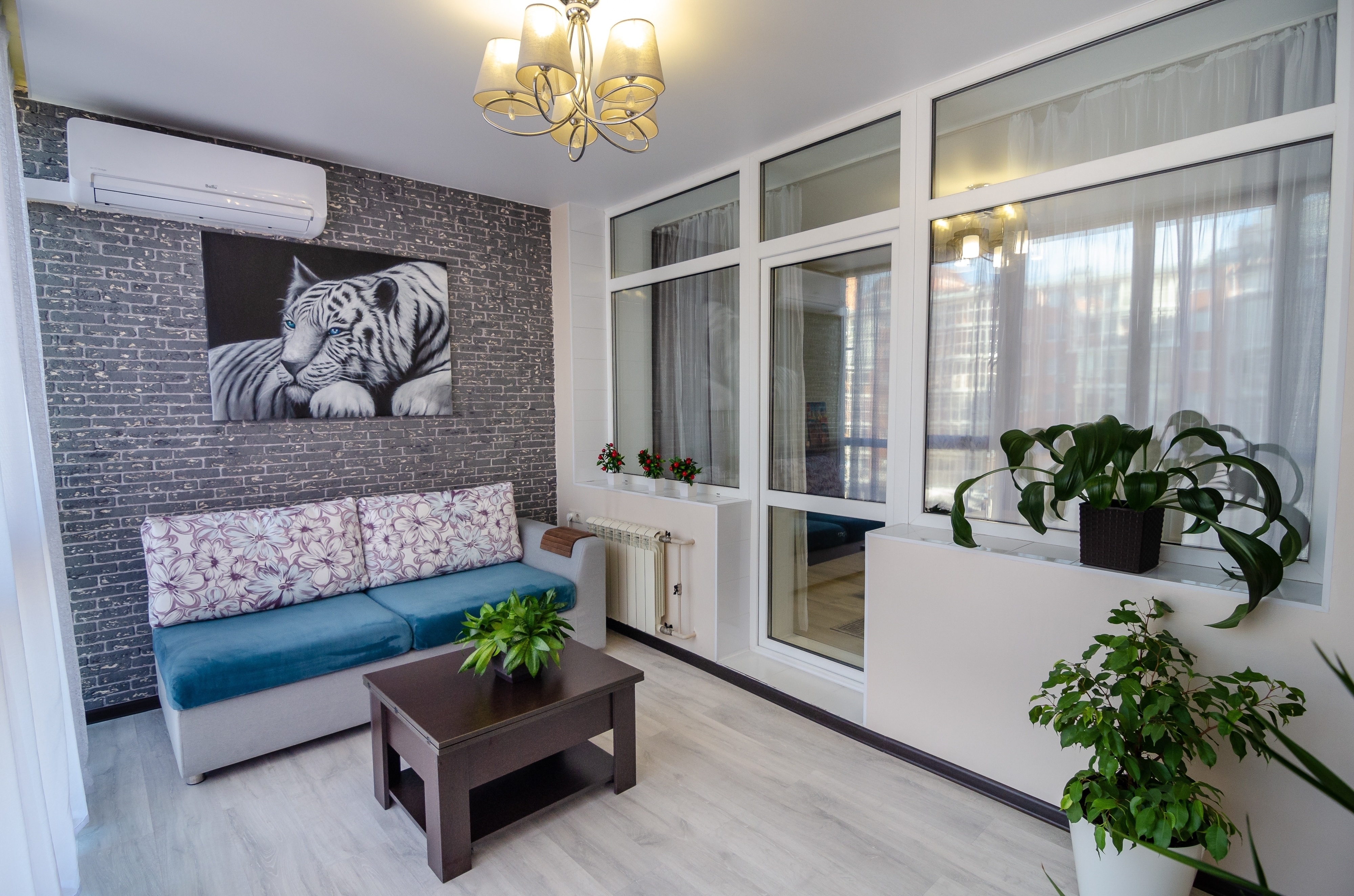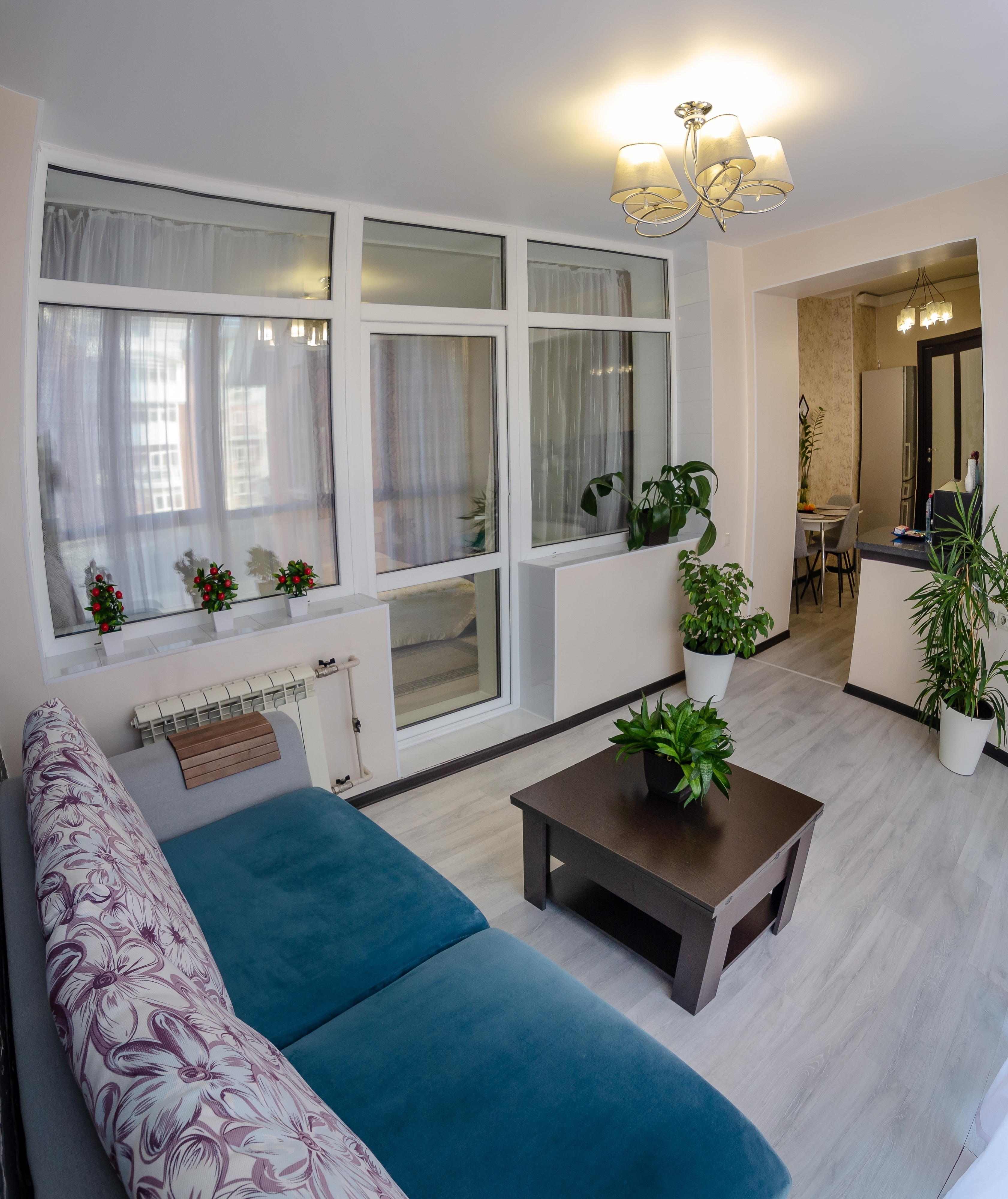 - гостиная-кухня с раскладным очень удобным диваном и панорамных окном во всю стену с видом на Ангару и на детскую площадку во дворе (дети не останутся без присмотра);