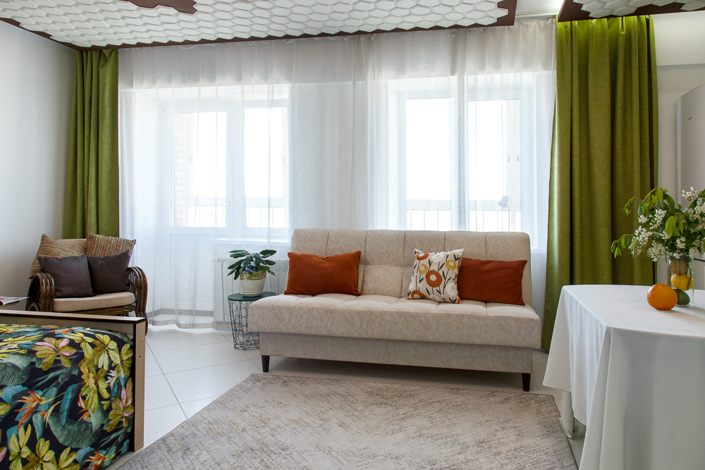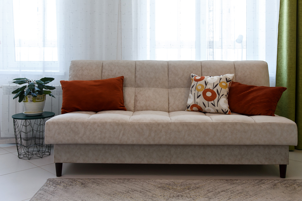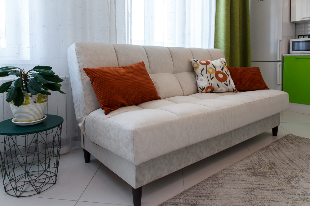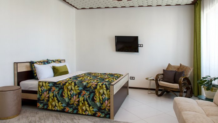 - Двуспальная кровать и двуспальный диван с качественными постельными принадлежностями и белоснежным бельем.