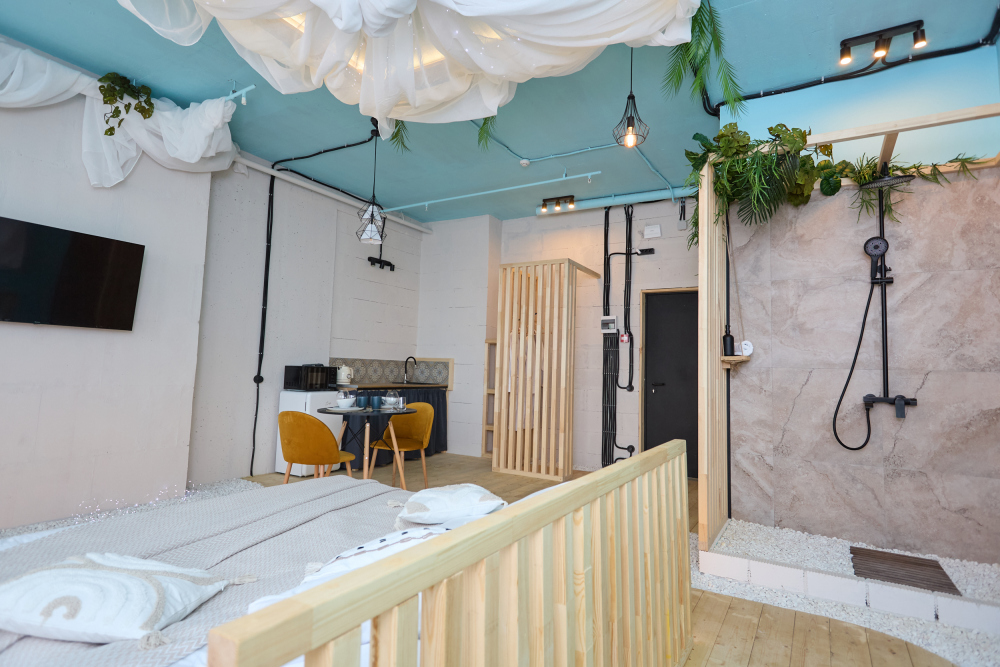 Квартира - пляж. В интерьере продумана каждая деталь, чтобы вы чувствовали себя, как на пляже. Просторная гостиная с деревянными дорожками и галечным покрытием пола, декор из ракушек и морских камней создают атмосферу настоящего тропического курорта.