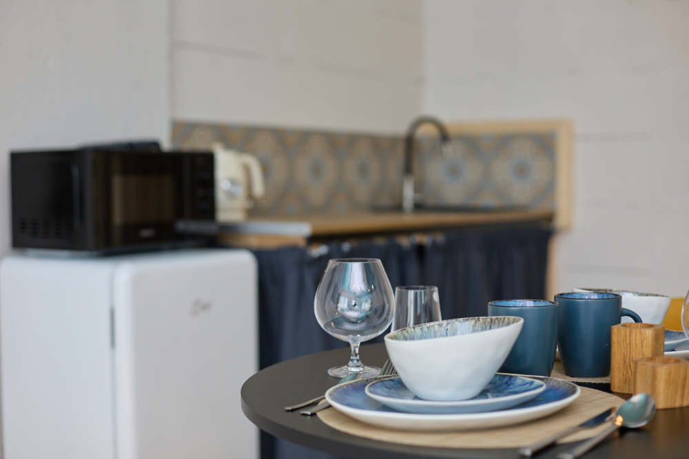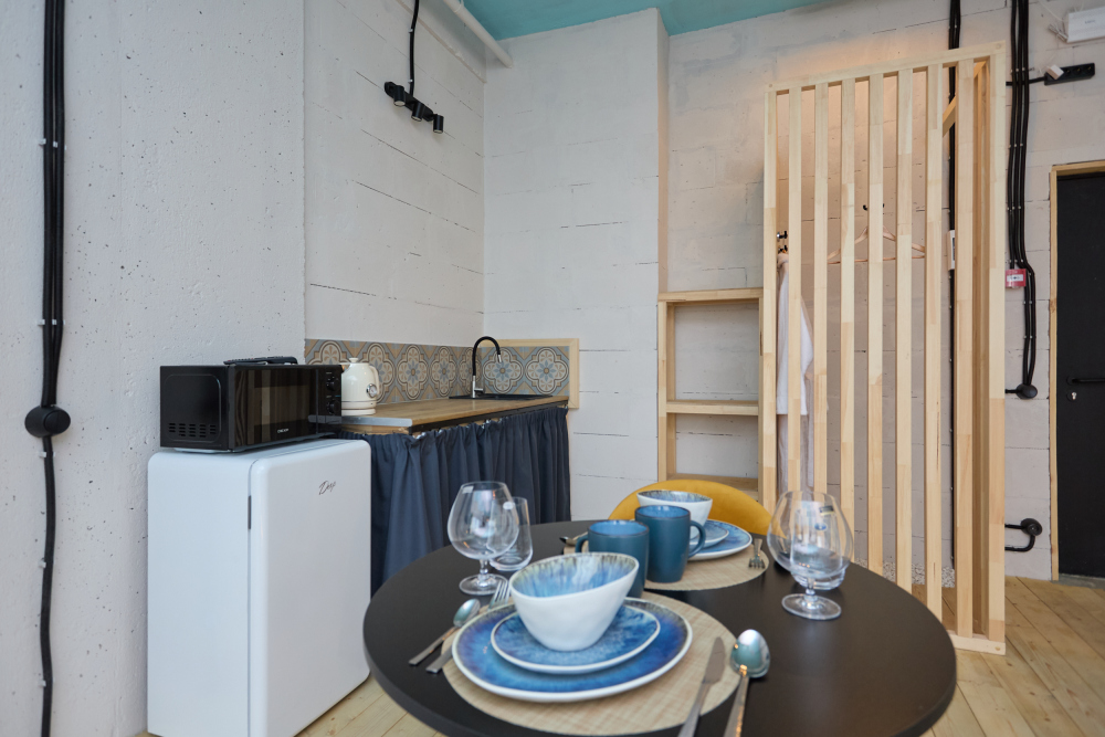 Кухни нет, но рядом много ресторанов и доставка еды за 30 минут.