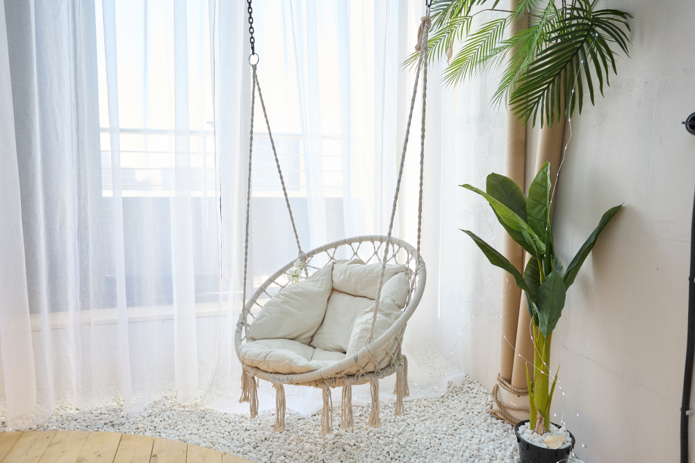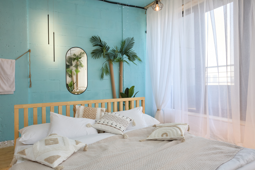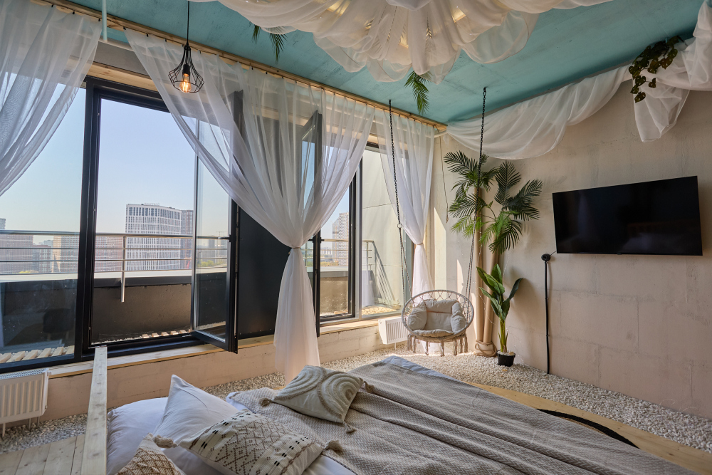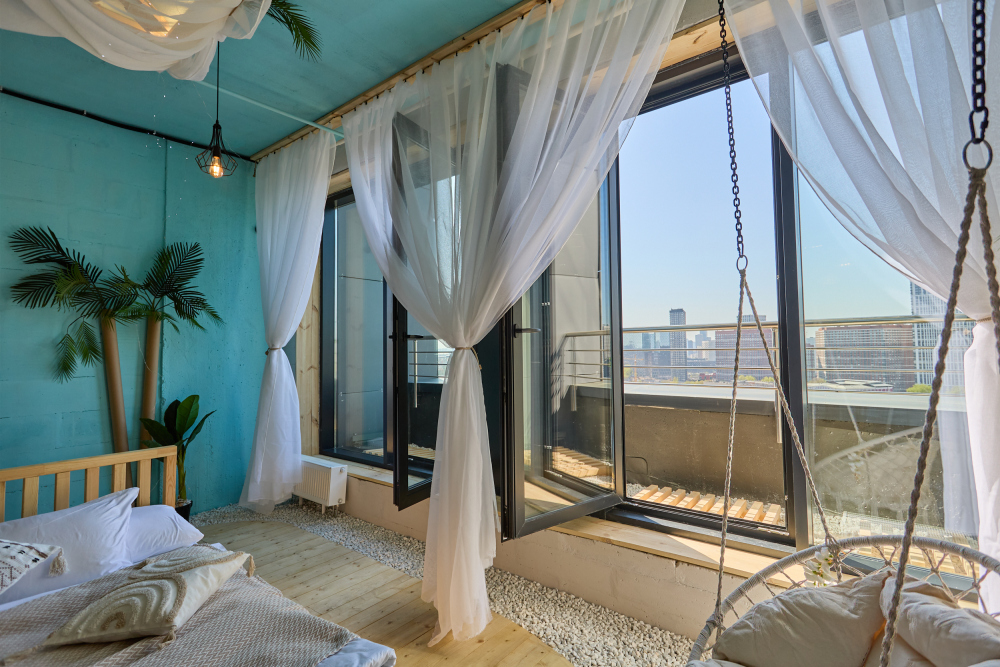 — Панорамные окна с морскими мотивами, шторы-тюль, напоминающими прибрежные виды;