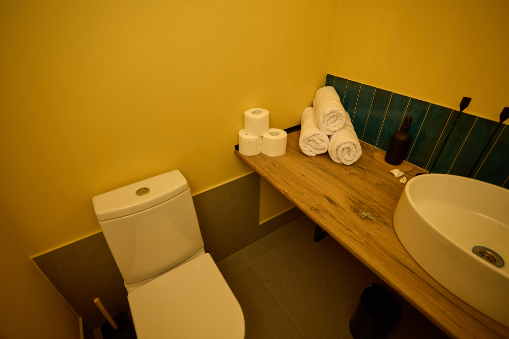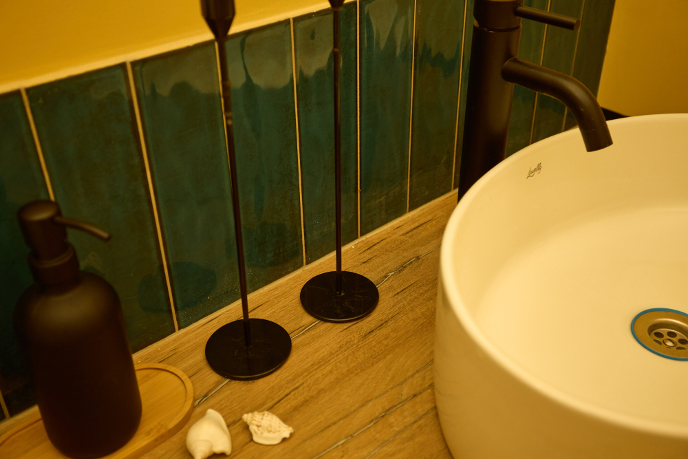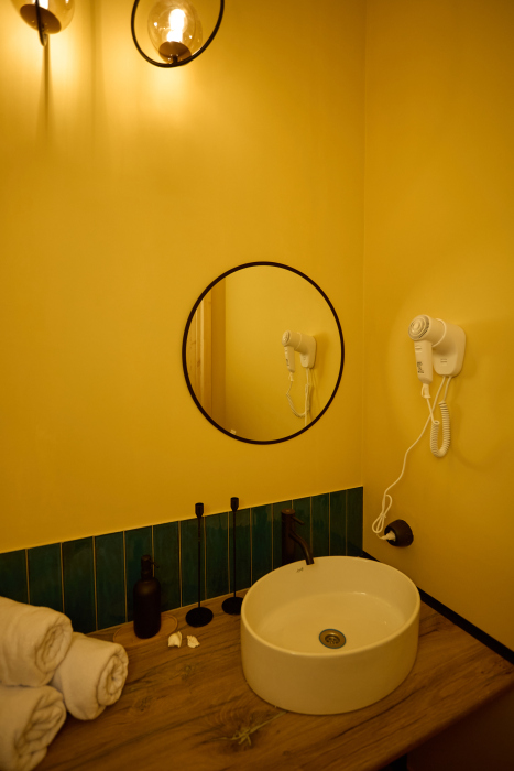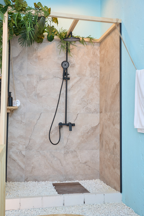 — Ванная открытого исполнения, выполнена в стиле SPA, открытая душевая с элементами, имитирующими морские пейзажи;
