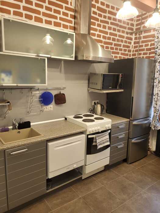 Кухни полностью укомплектованы всем необходимым, что делает процесс приготовления пищи приятным и простым. Высокие потолки и открытые фактуры стен придают интерьеру особый шарм.