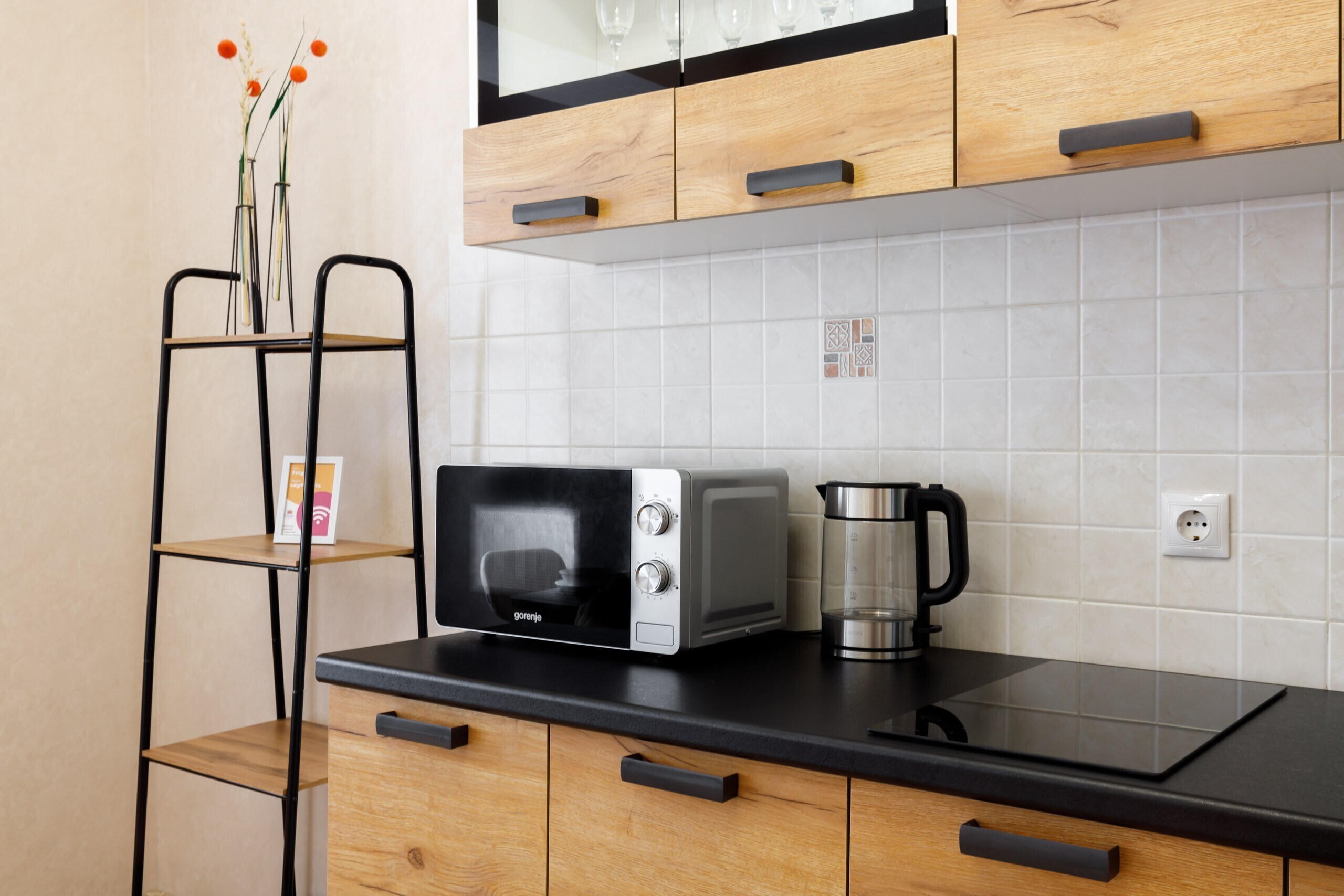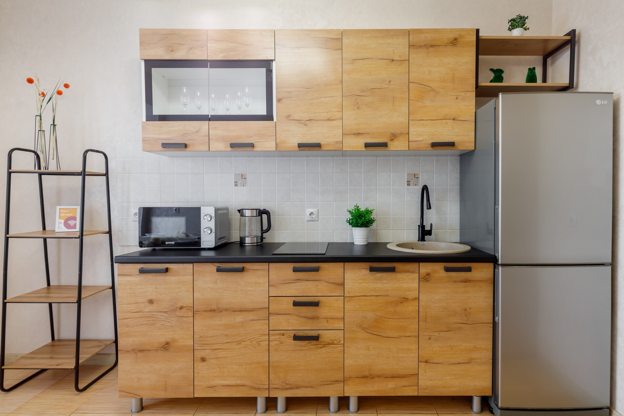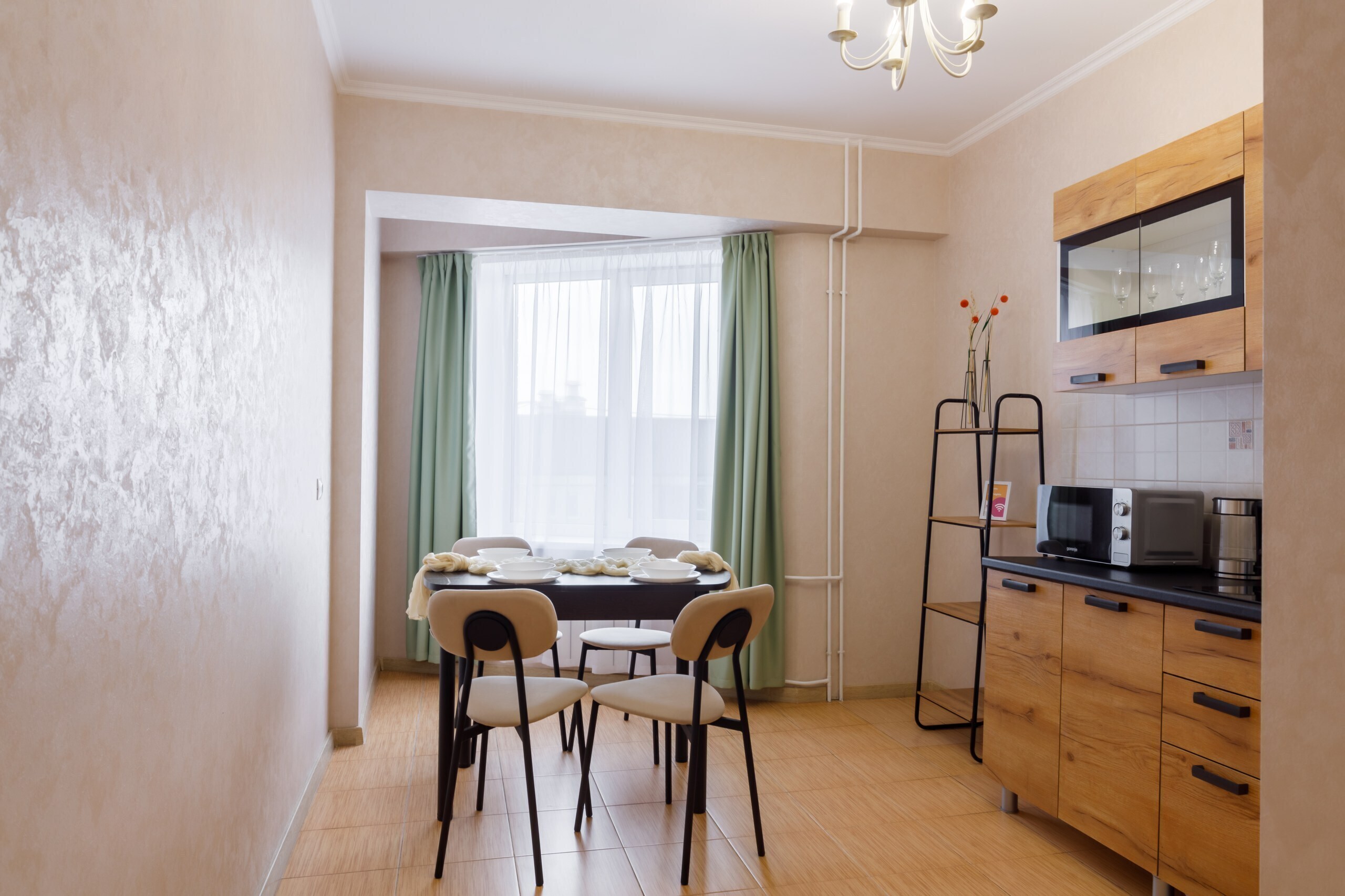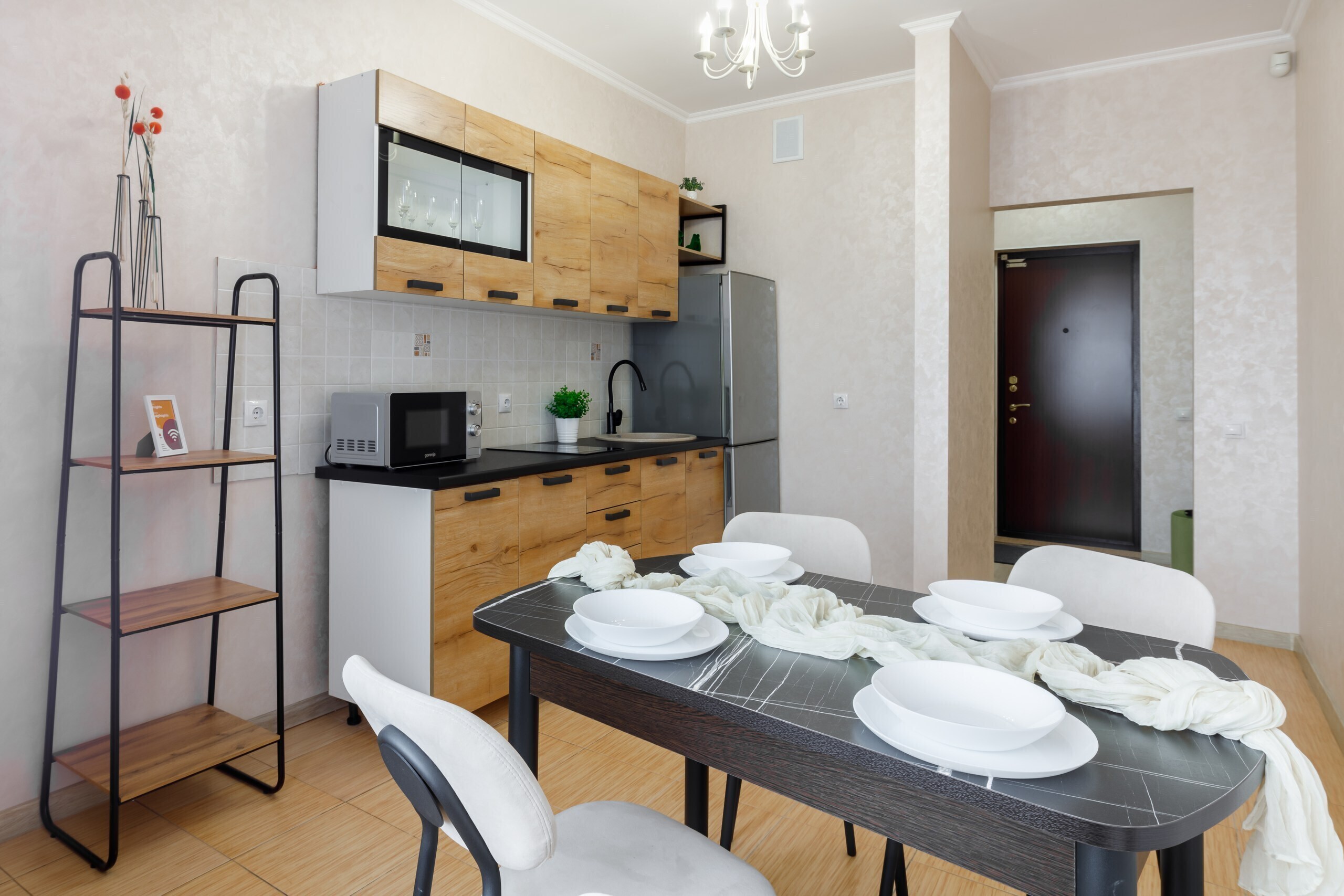 Полностью оборудованные кухни с посудой и столовыми приборами.