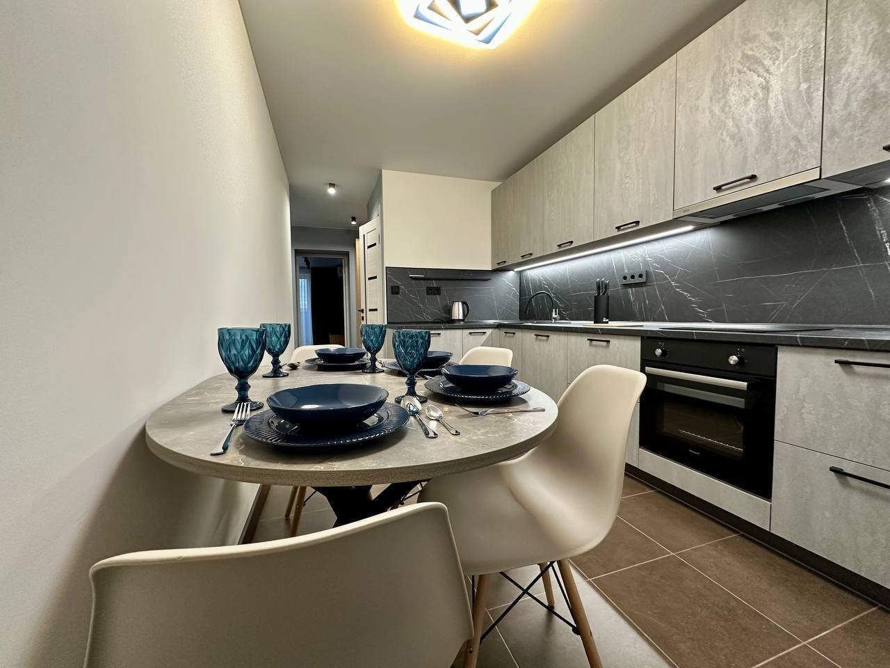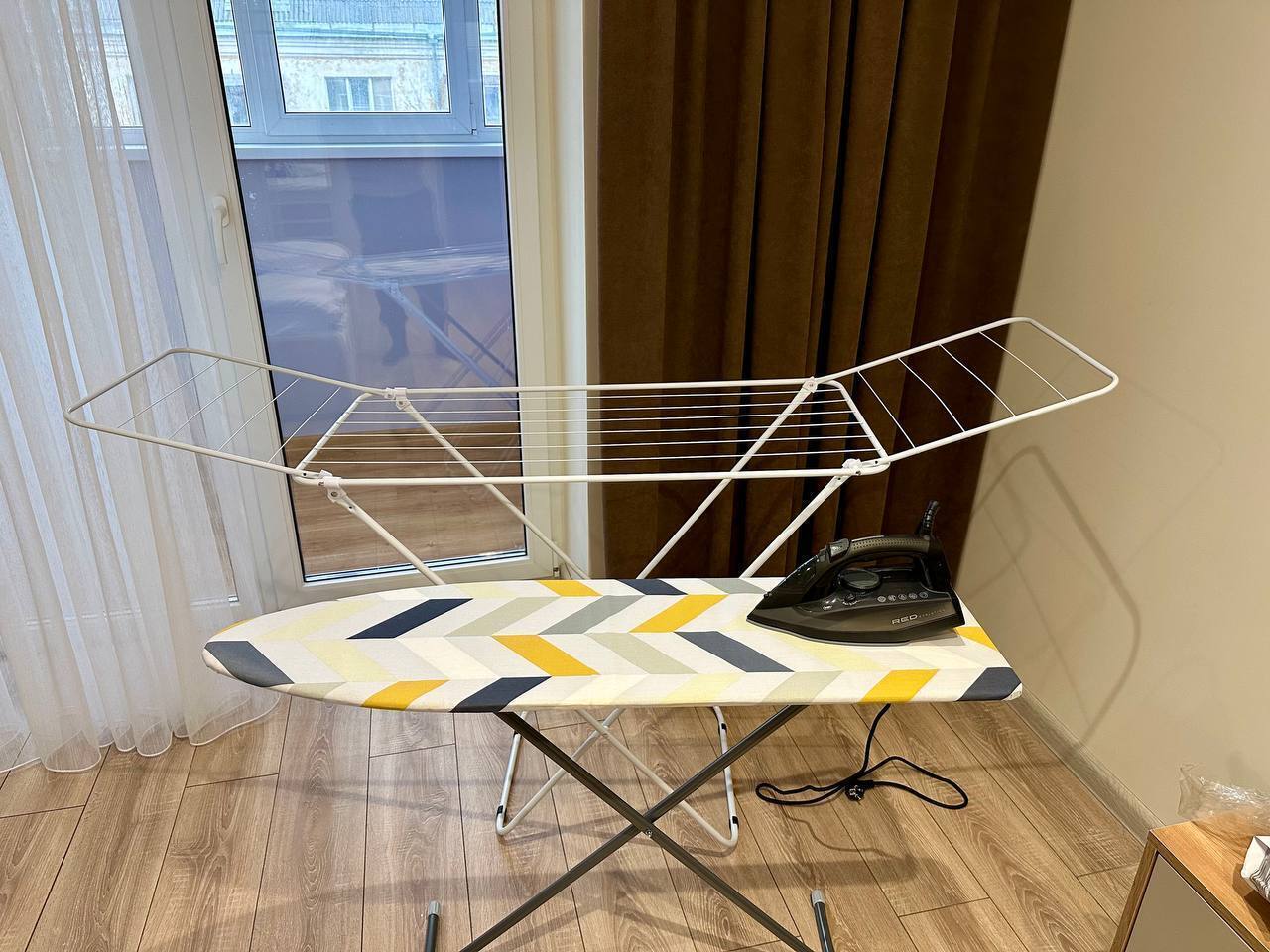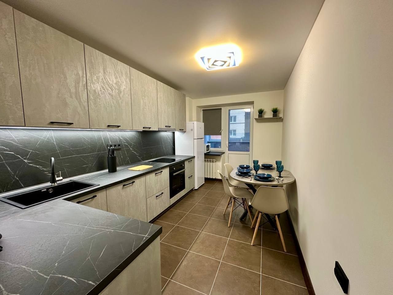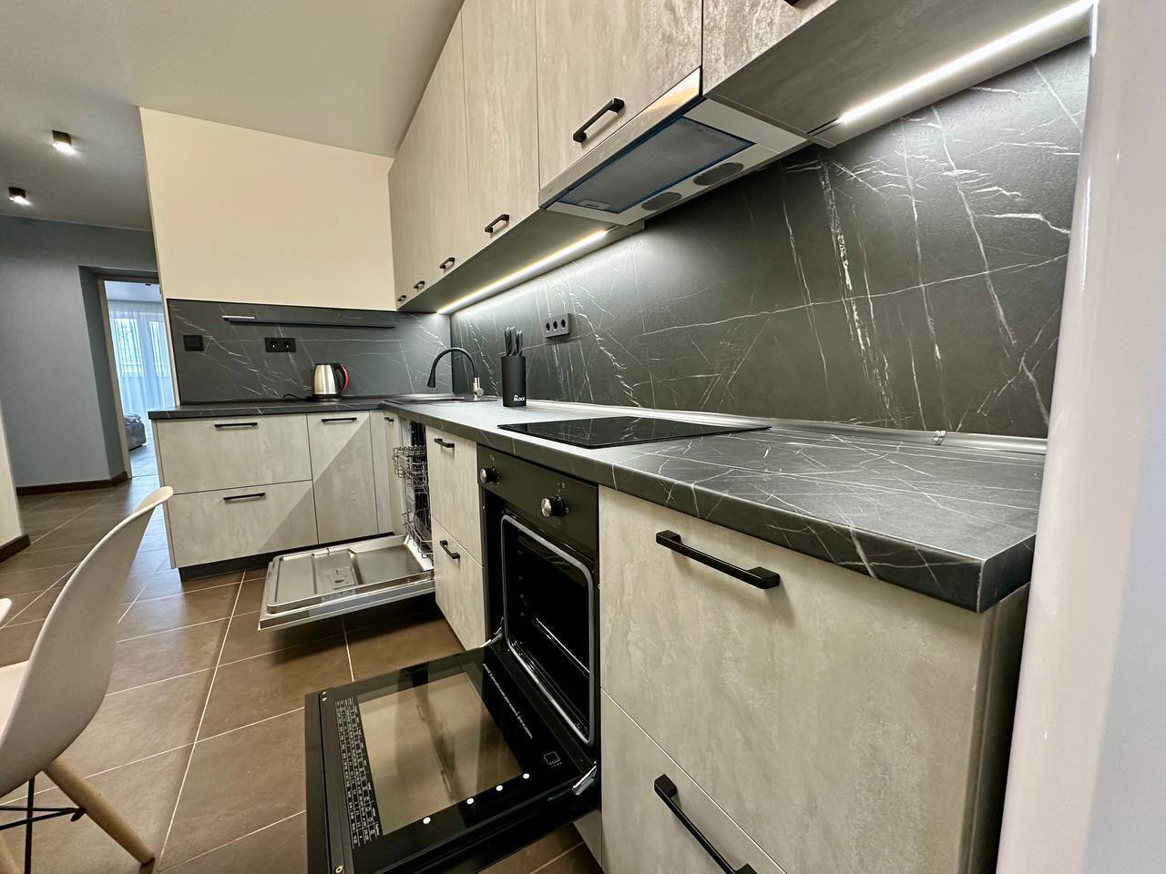 - Индукционная плита, холодильник с морозильной камерой, духовой шкаф, посудомоечная машина, микроволновая печь, чайник, набор посуды.