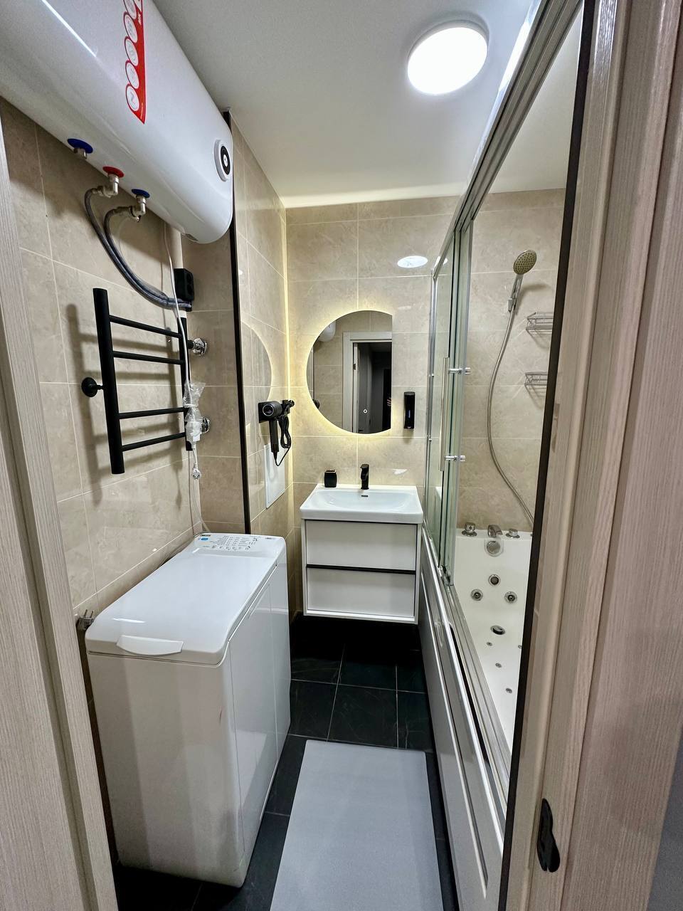 - Ванная с джакузи, стиральная машина, полотенца, мыло, фен.