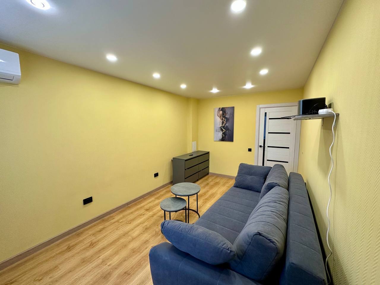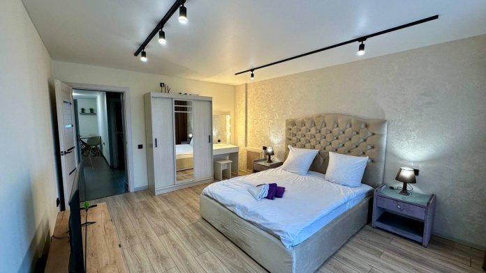 - Большая двуспальная кровать в спальне, раскладной ортопедический диван в гостиной.