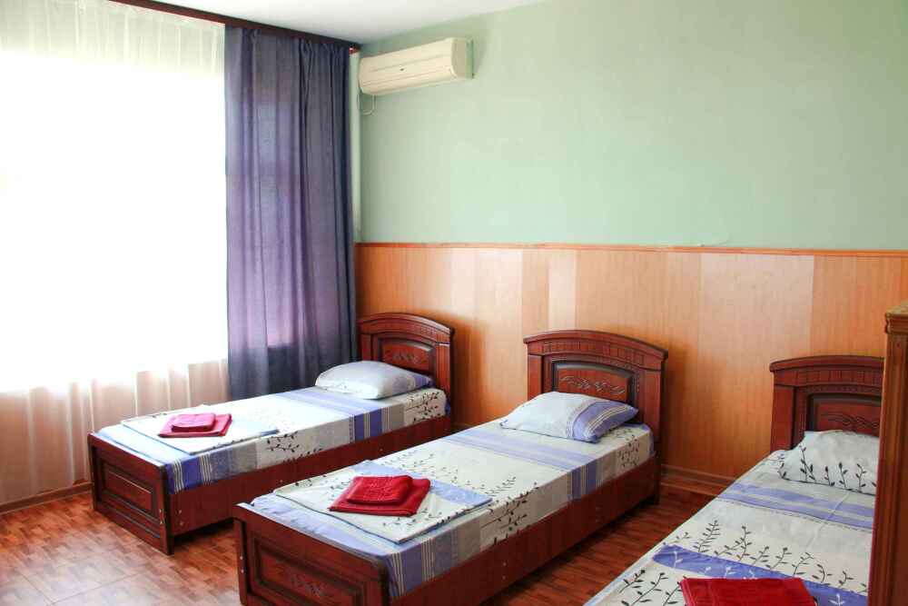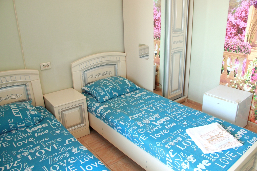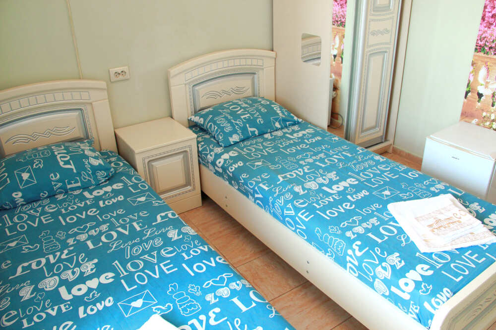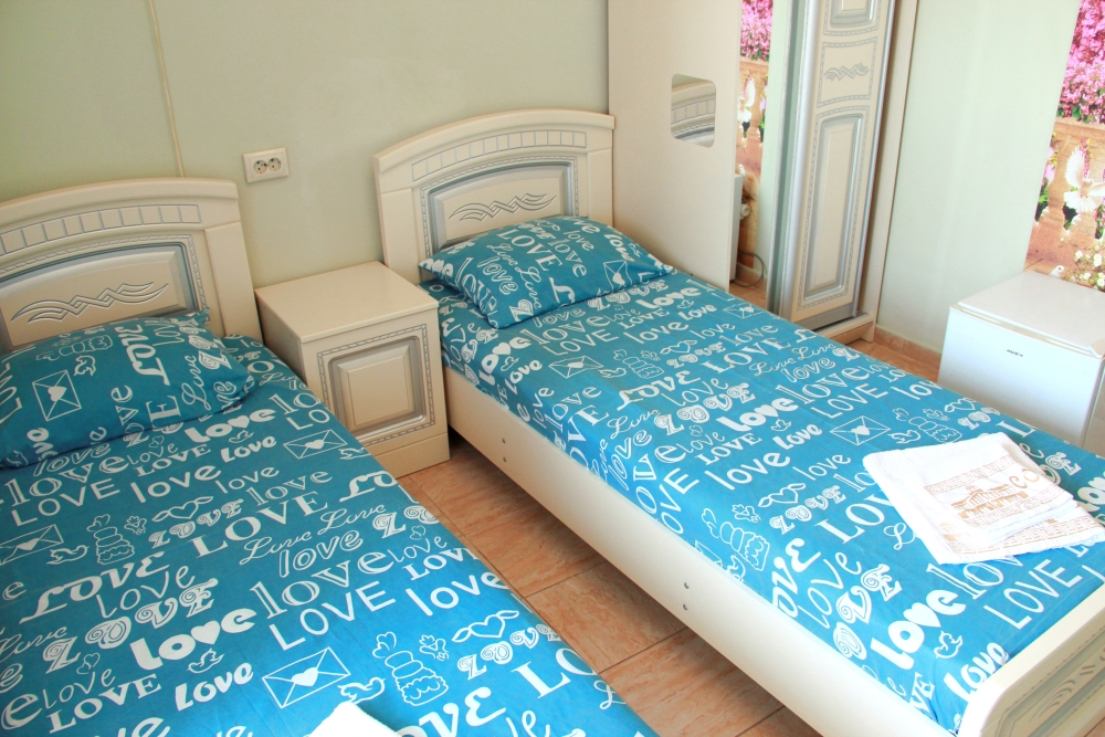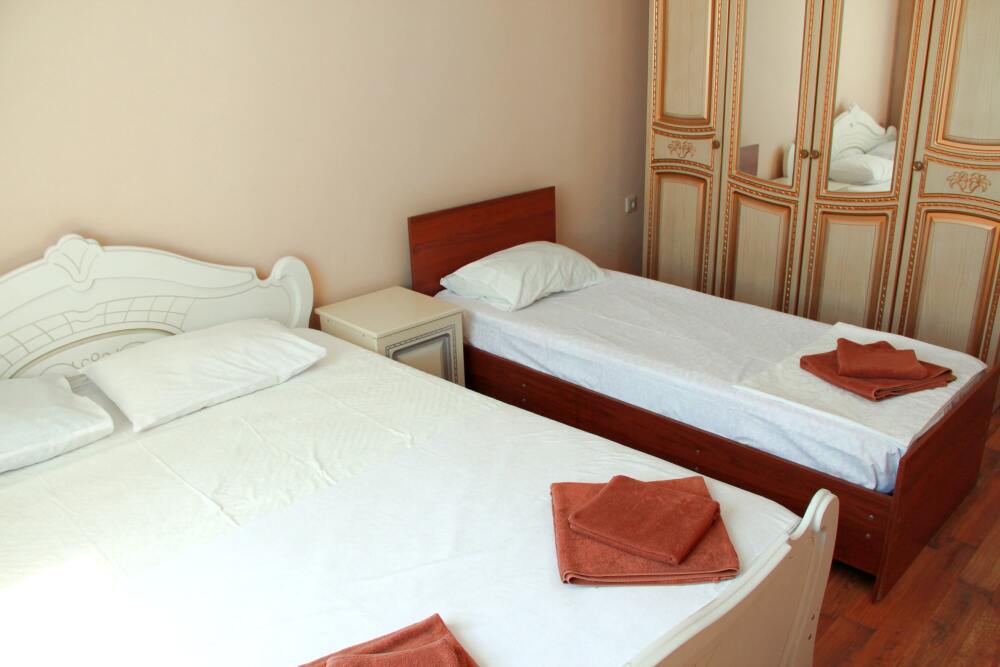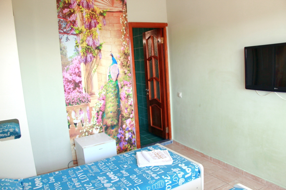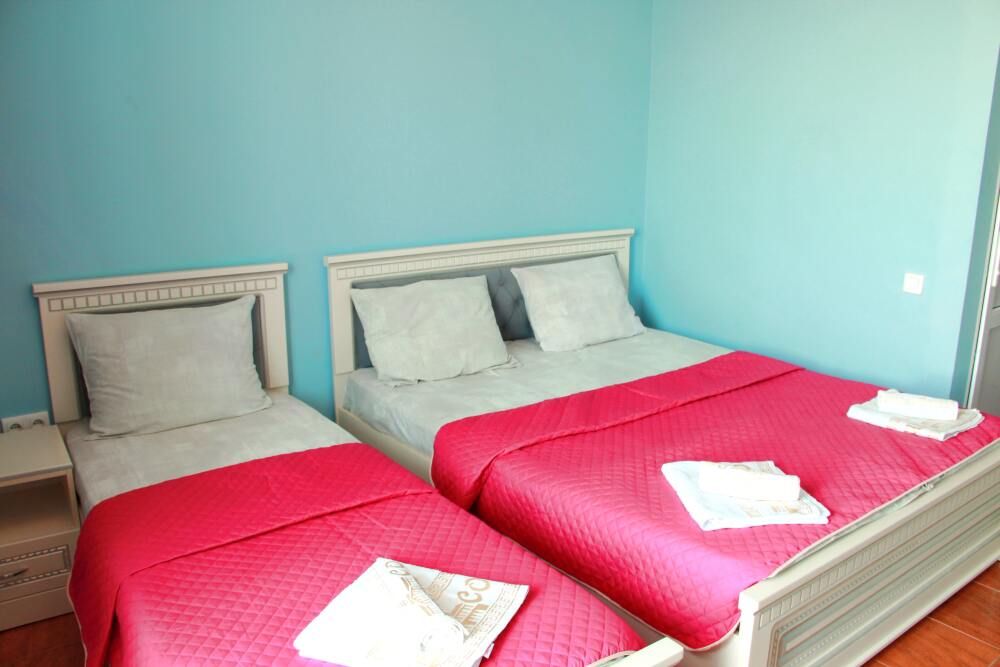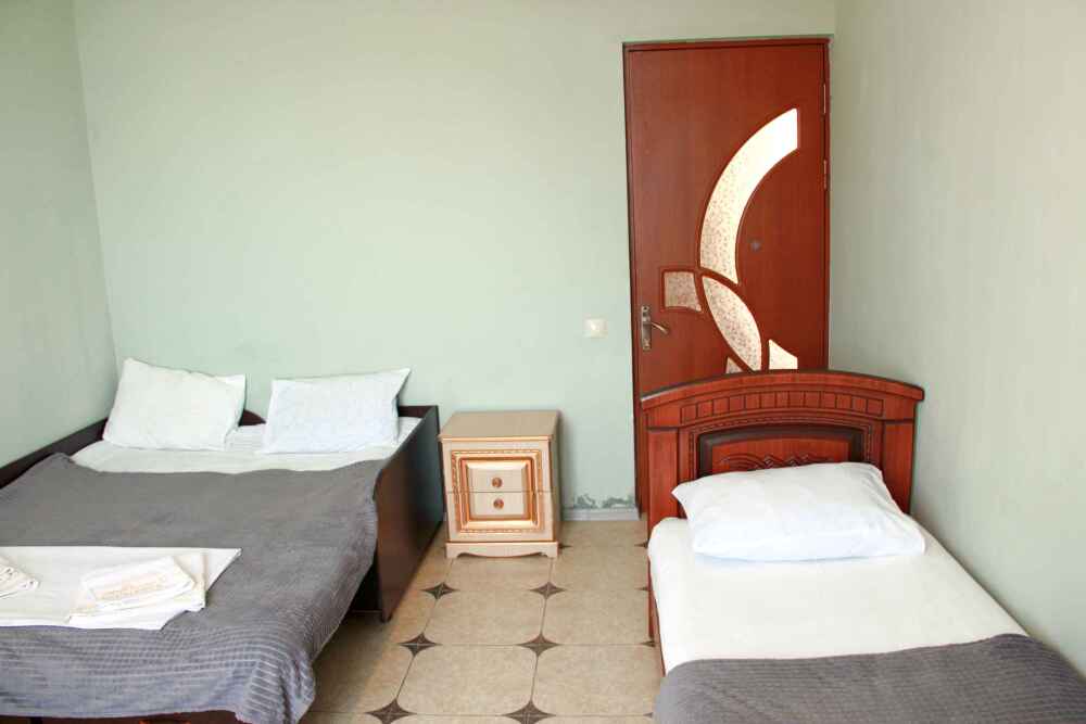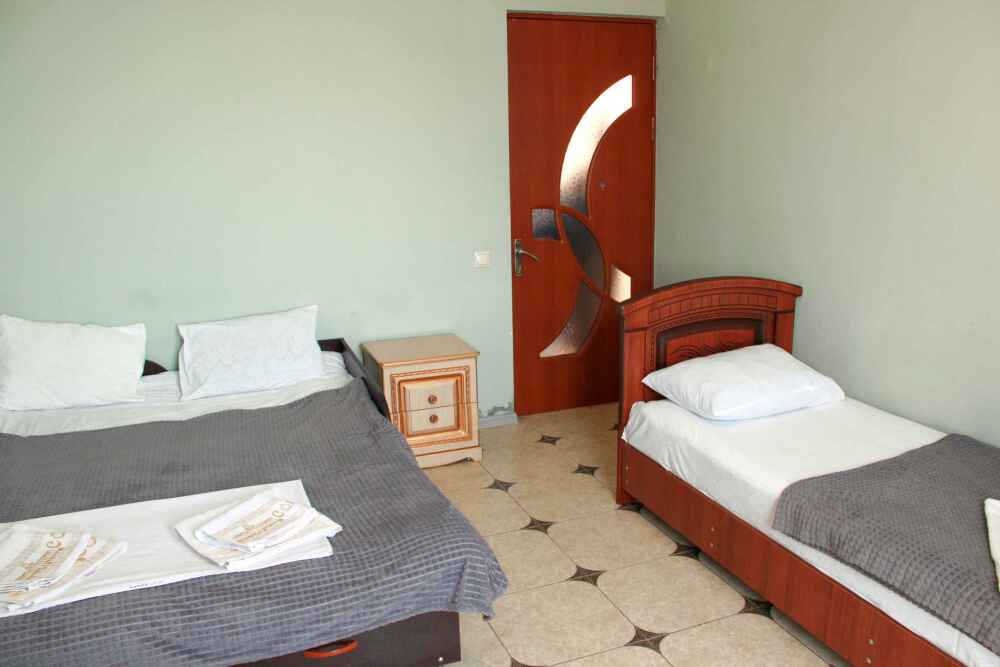 3-х местные номера категории «Эконом» с балконом - уютные однокомнатные номера, 2 этаж второго корпуса, в номере – три раздельные кровати либо 2-х спальный диван и 1-но спальная кровать, шкаф для одежды, прикроватные тумбочки, телевизор, мини-холодильник, кондиционер. В номере есть большой балкон с видом на море и внутренний двор гостевого дома. На балконе есть стол и стулья для отдыха. Санузел (ванна, туалет, умывальник) на 2 номера в коридоре рядом с номерами.