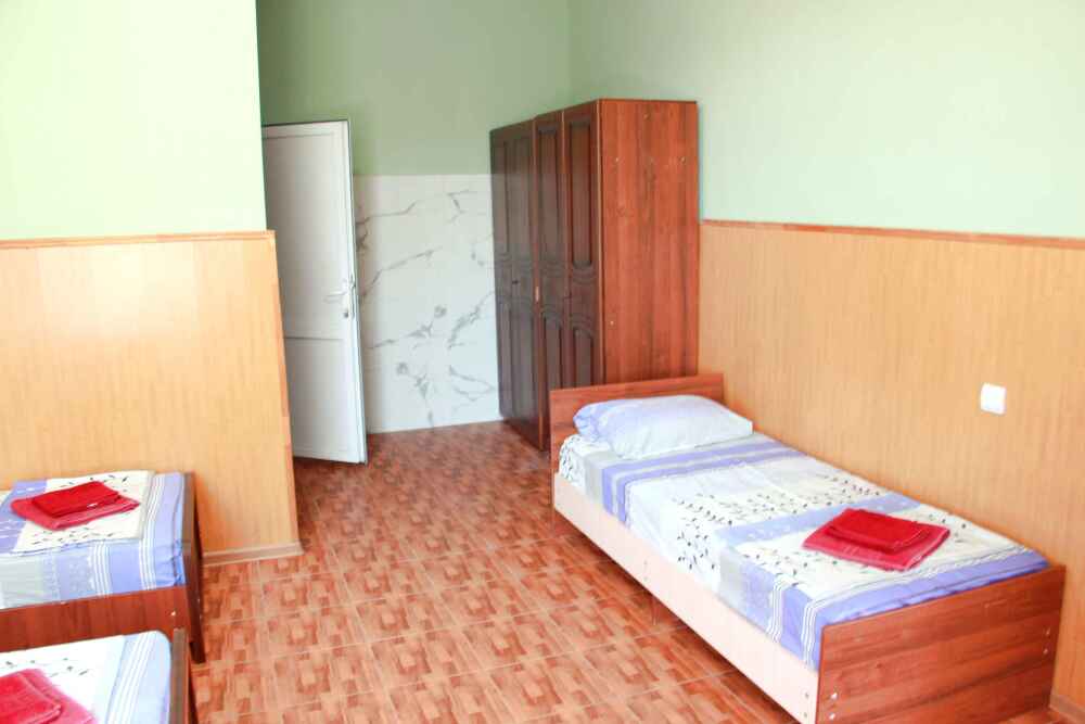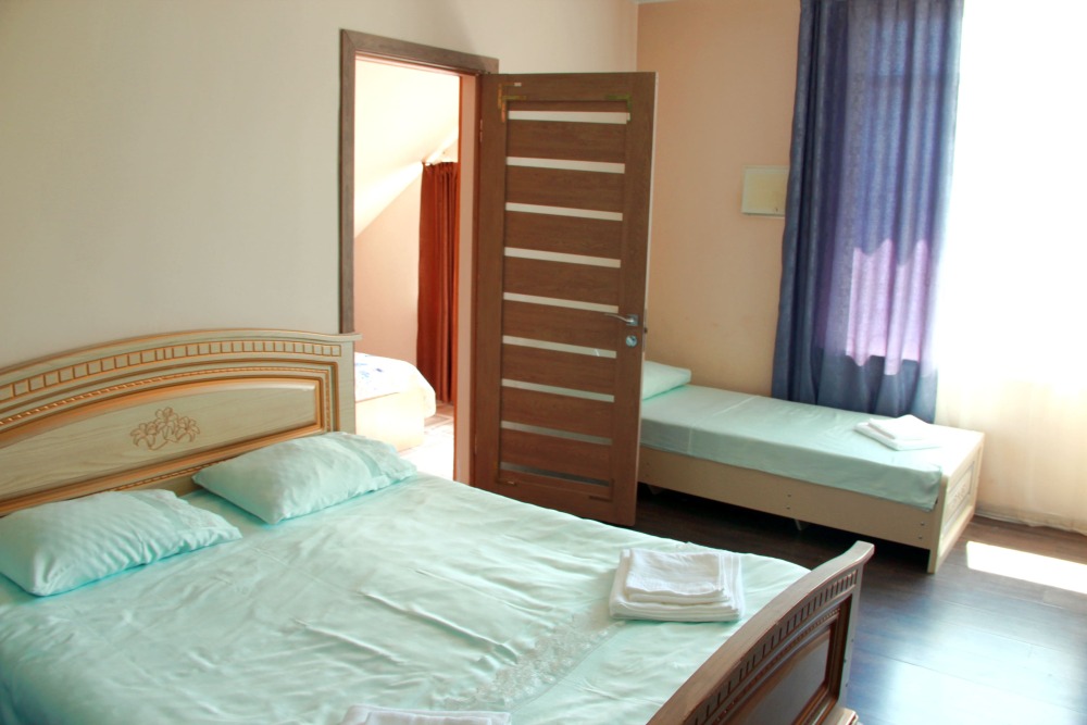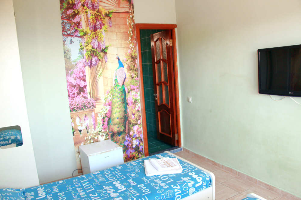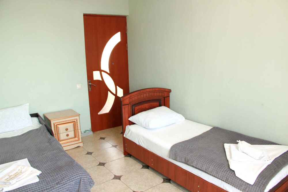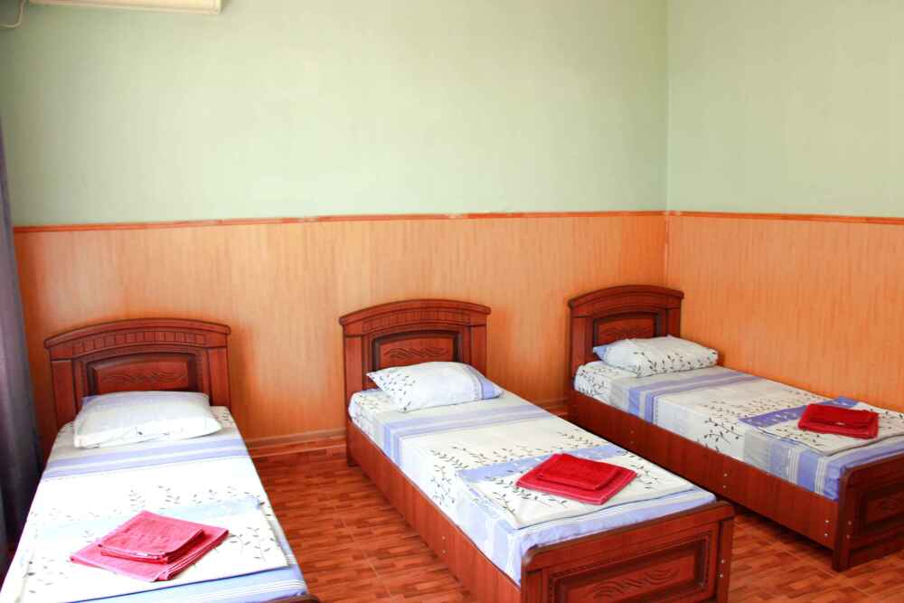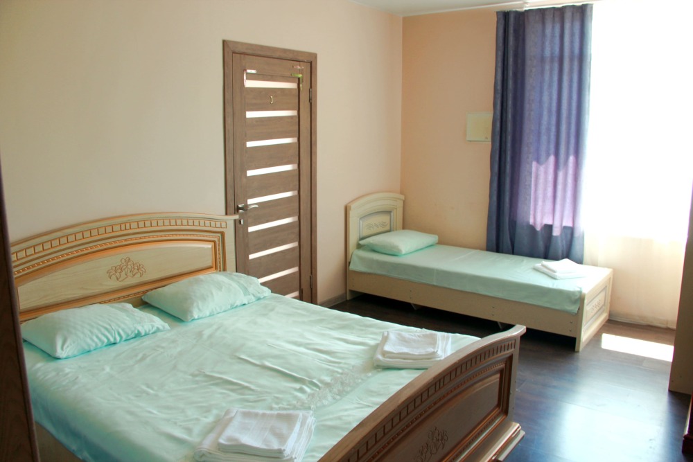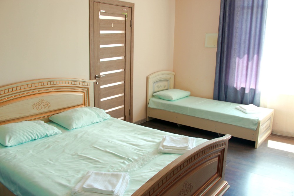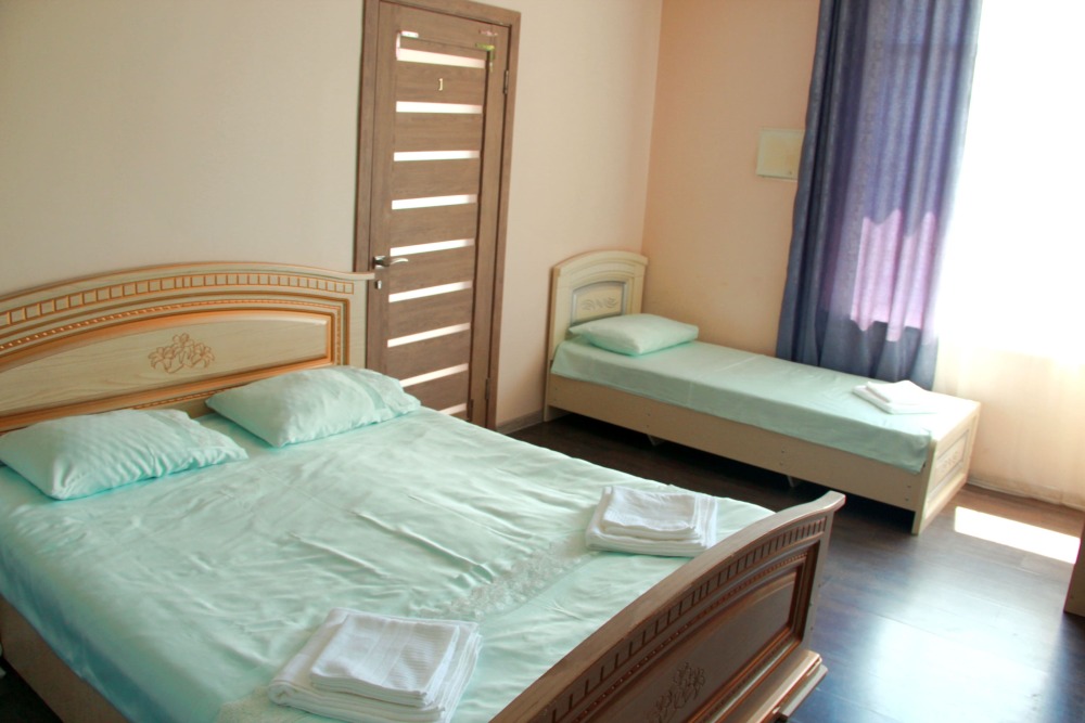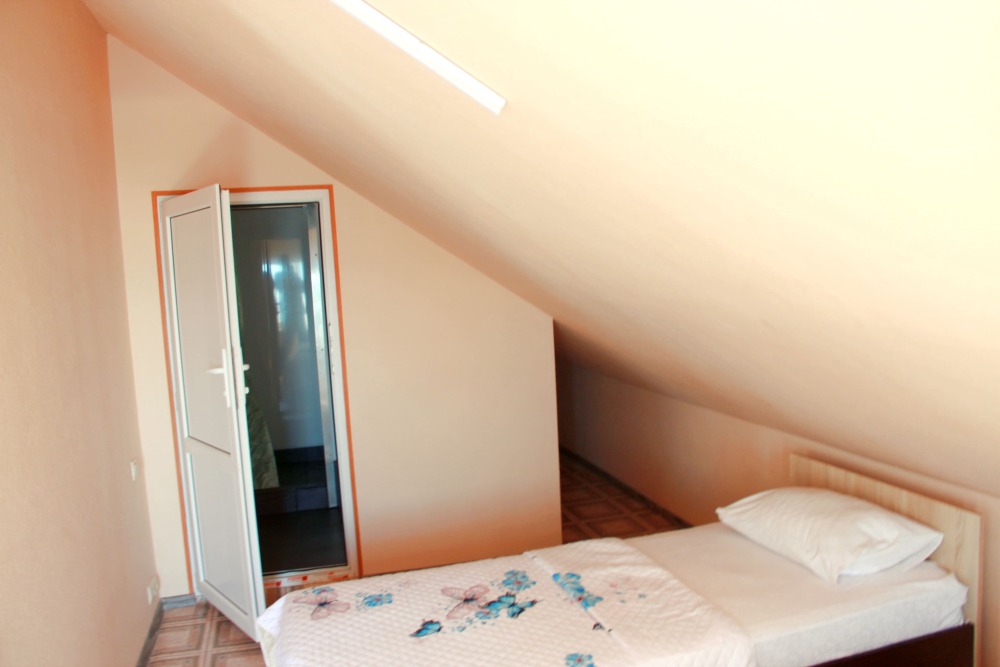 3-х местные номера категории «Эконом» с балконом - уютные однокомнатные номера, 2 этаж второго корпуса, в номере – три раздельные кровати либо 2-х спальный диван и 1-но спальная кровать, шкаф для одежды, прикроватные тумбочки, телевизор, мини-холодильник, кондиционер. В номере есть большой балкон с видом на море и внутренний двор гостевого дома. На балконе есть стол и стулья для отдыха. Санузел (ванна, туалет, умывальник) на 2 номера в коридоре рядом с номерами.