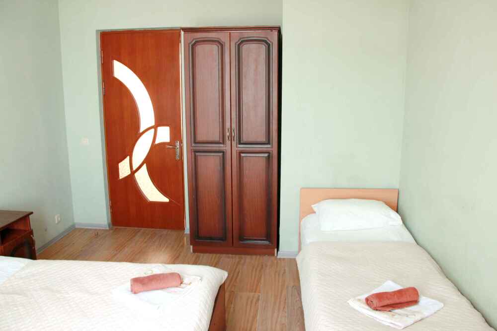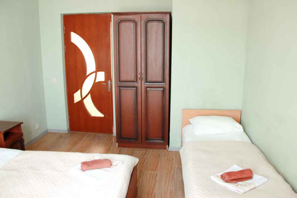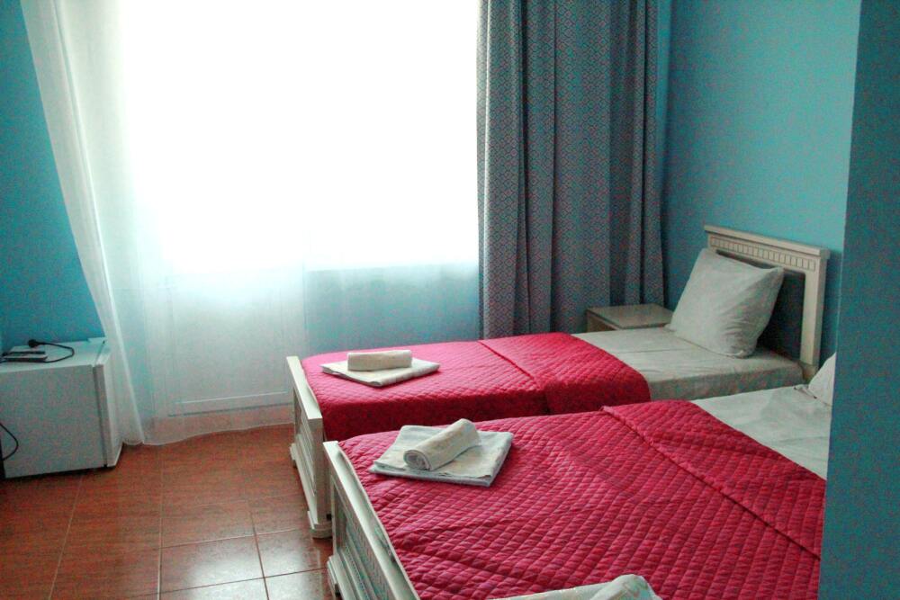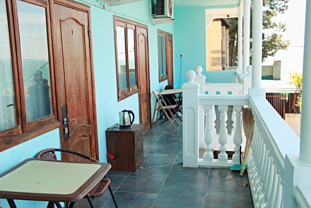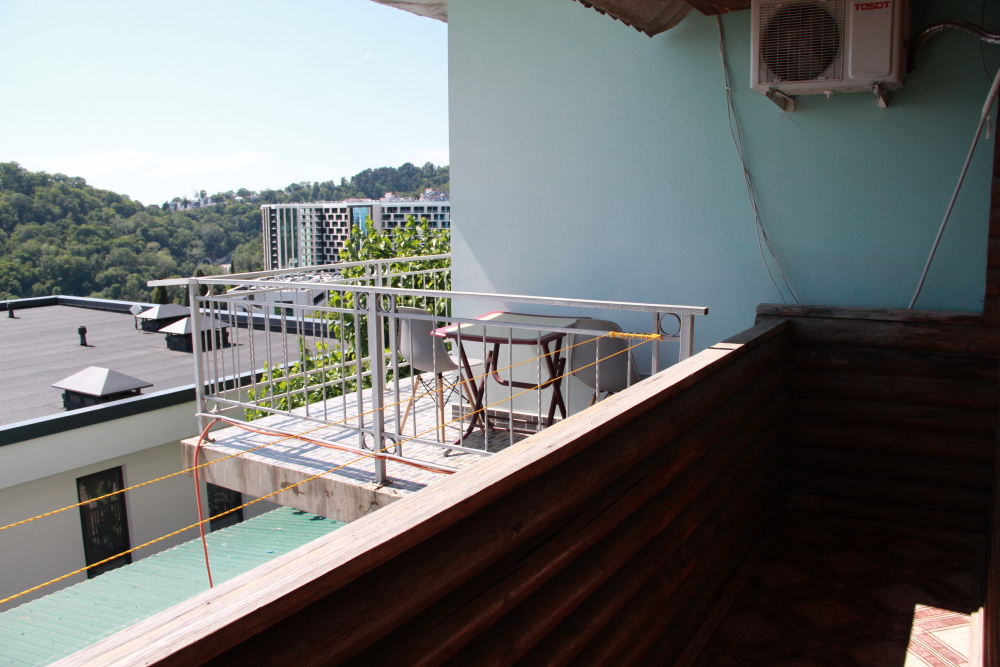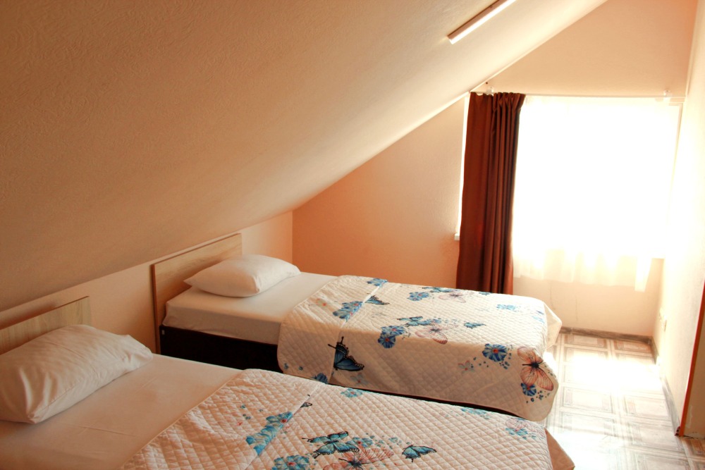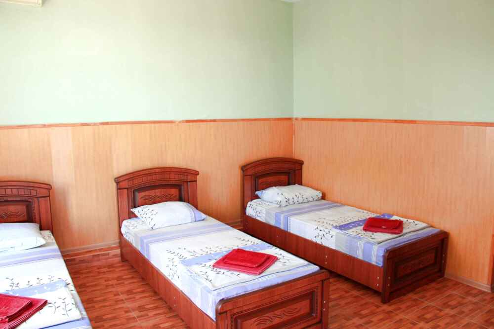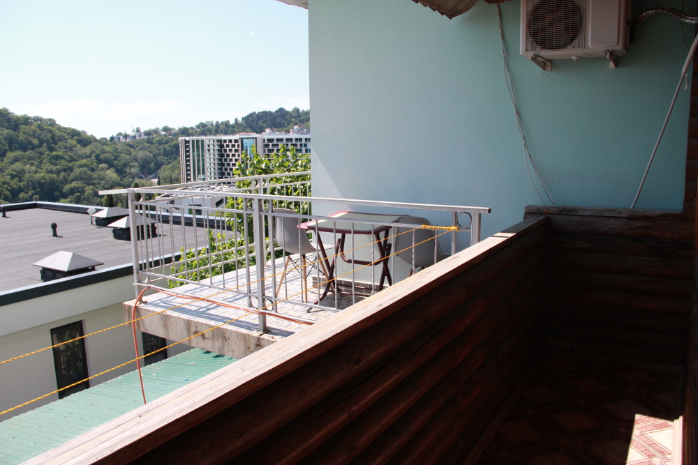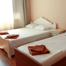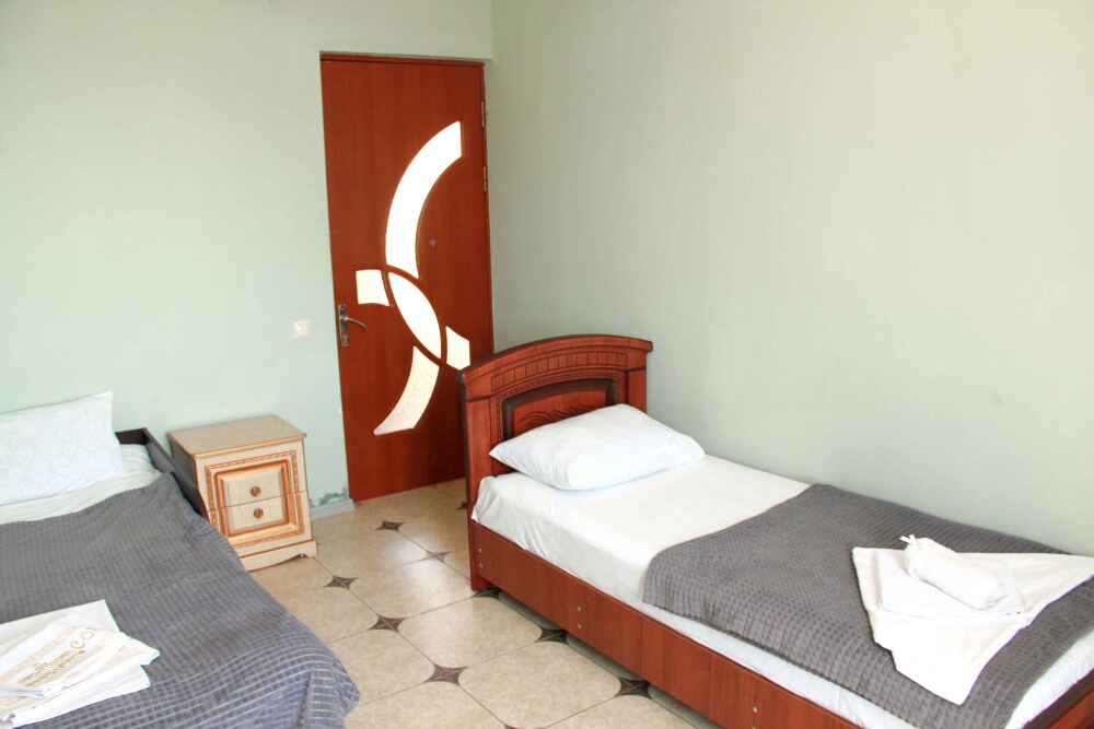 3-х местные номера категории «Эконом» с балконом - уютные однокомнатные номера, 2 этаж второго корпуса, в номере – три раздельные кровати либо 2-х спальный диван и 1-но спальная кровать, шкаф для одежды, прикроватные тумбочки, телевизор, мини-холодильник, кондиционер. В номере есть большой балкон с видом на море и внутренний двор гостевого дома. На балконе есть стол и стулья для отдыха. Санузел (ванна, туалет, умывальник) на 2 номера в коридоре рядом с номерами.