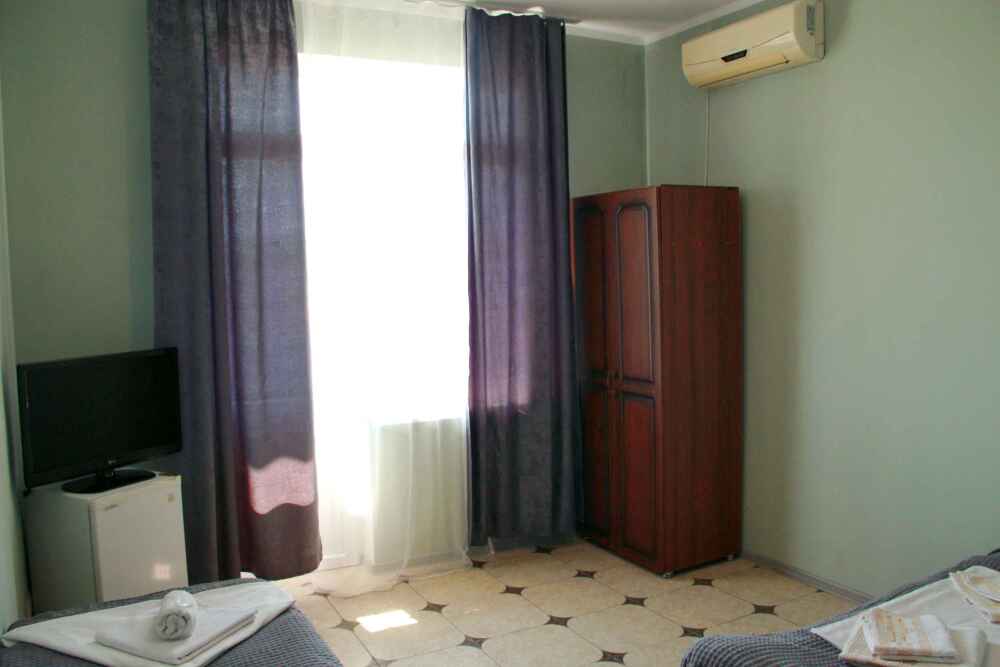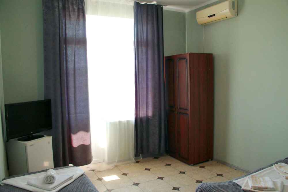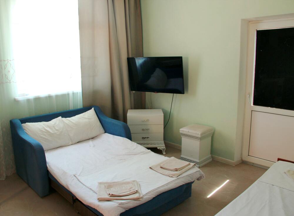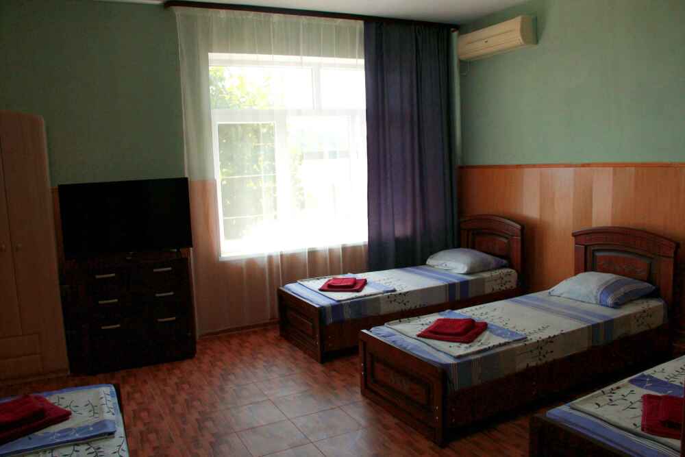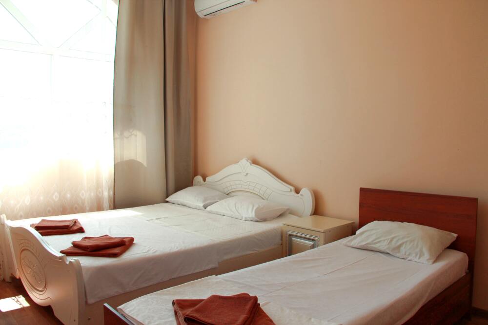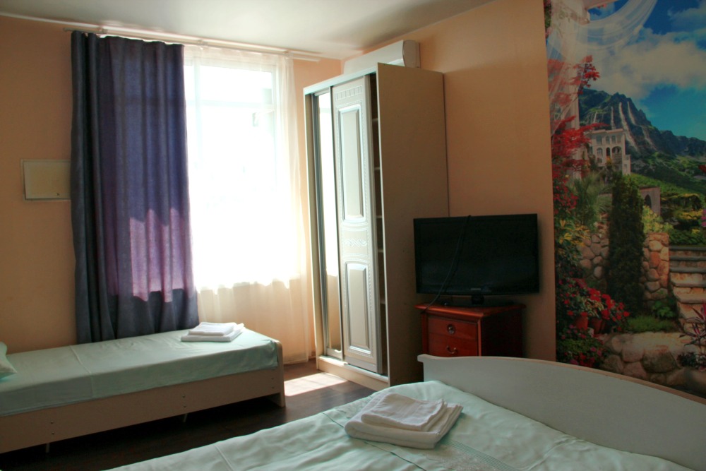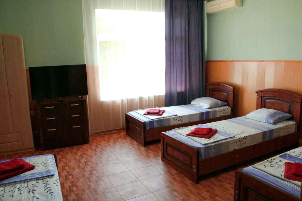 3-х местный номер категории «Стандарт» - отдельный вход с обратной стороны корпуса 2 - однокомнатный уютный номер, расположенный на 2 этаже гостевого дома, в номере 2-х спальная кровать и 1-но спальная кровать, шкаф для одежды, прикроватные тумбочки, телевизор, кондиционер. В номере есть большой балкон с видом на море и внутренний двор гостевого дома. На балконе есть стол и стулья для отдыха. Санузел (душ, туалет, умывальник) в номере.