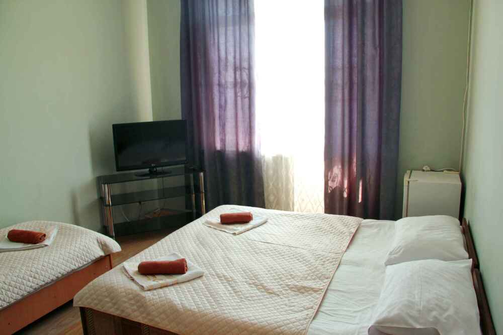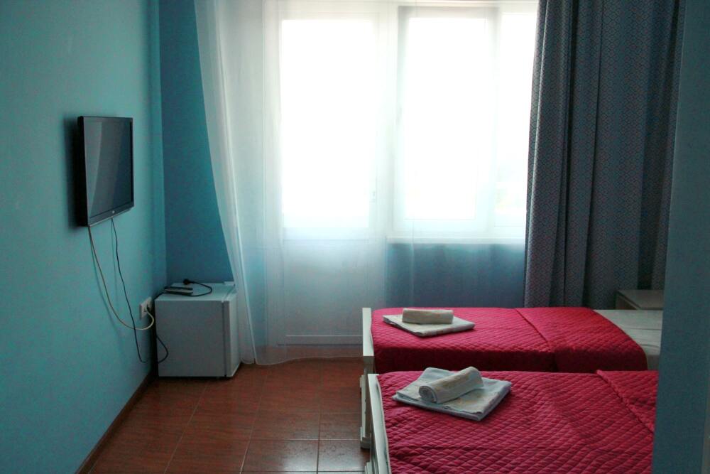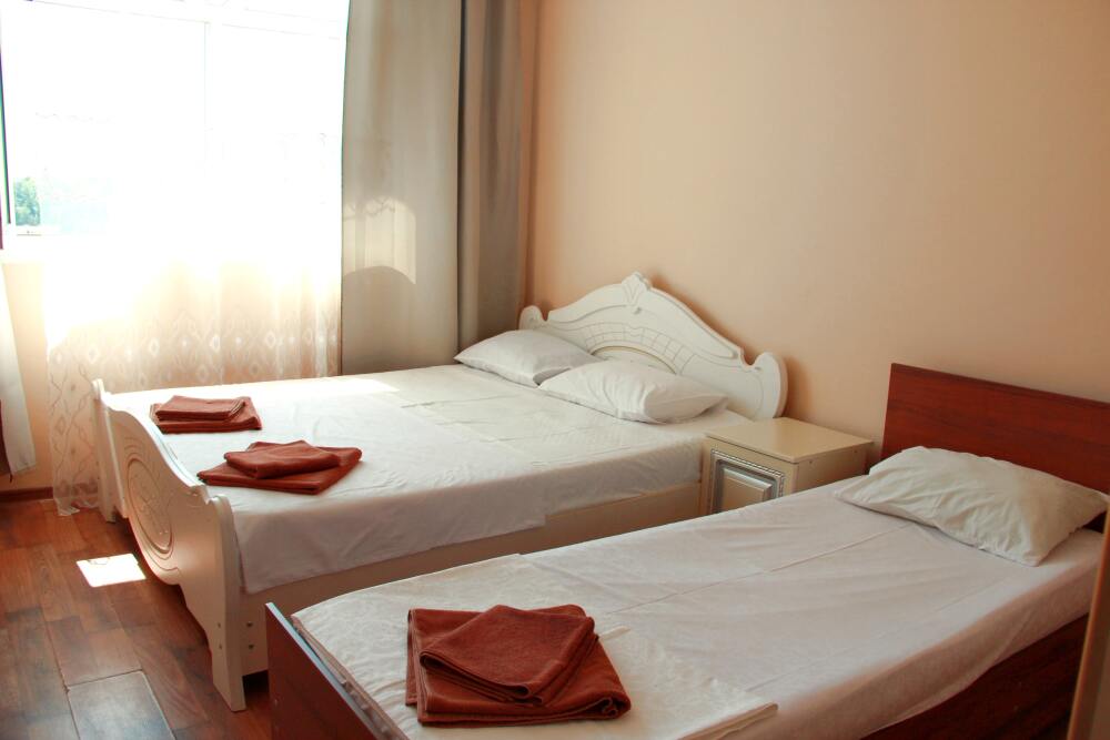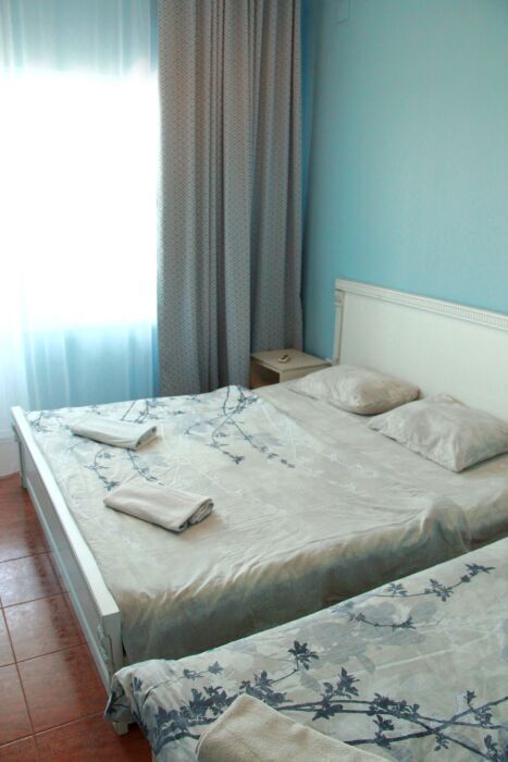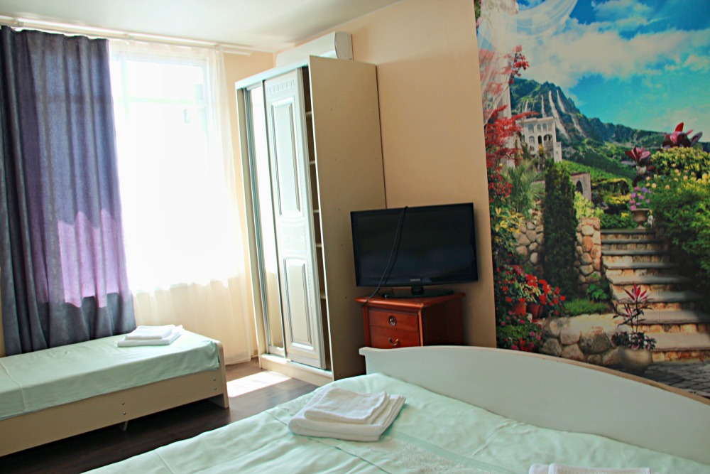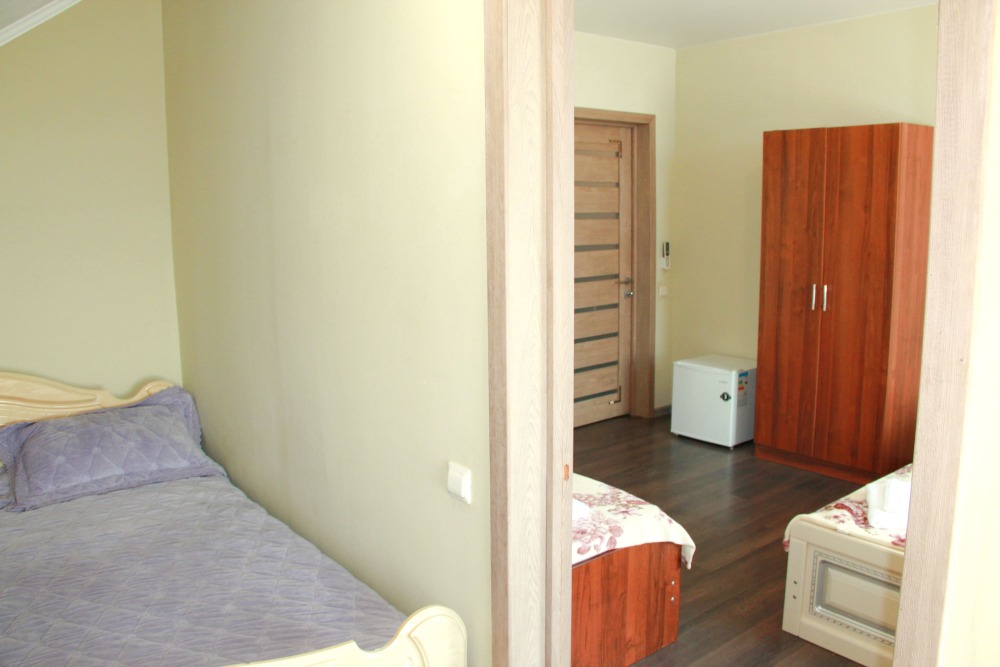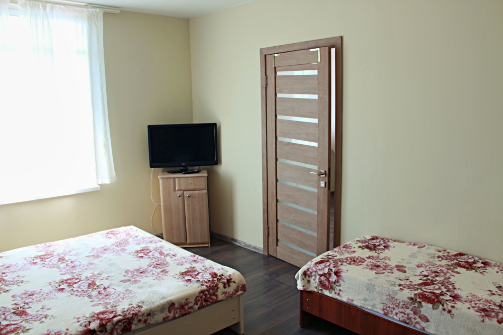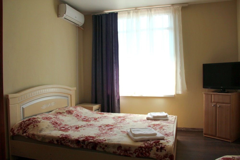 3-х местный номер категории «Стандарт» - отдельный вход с обратной стороны корпуса 2 - однокомнатный уютный номер, расположенный на 2 этаже гостевого дома, в номере 2-х спальная кровать и 1-но спальная кровать, шкаф для одежды, прикроватные тумбочки, телевизор, кондиционер. В номере есть большой балкон с видом на море и внутренний двор гостевого дома. На балконе есть стол и стулья для отдыха. Санузел (душ, туалет, умывальник) в номере.