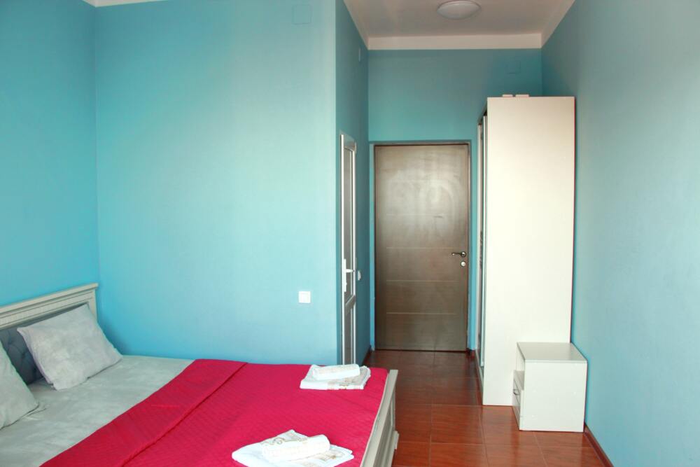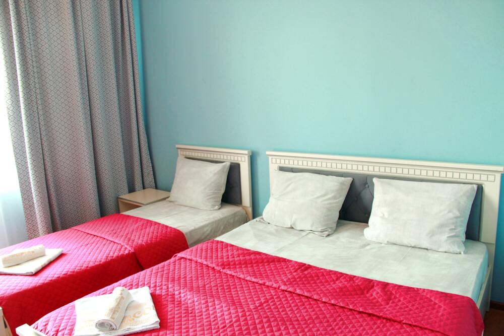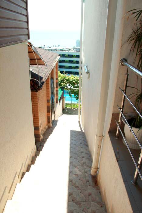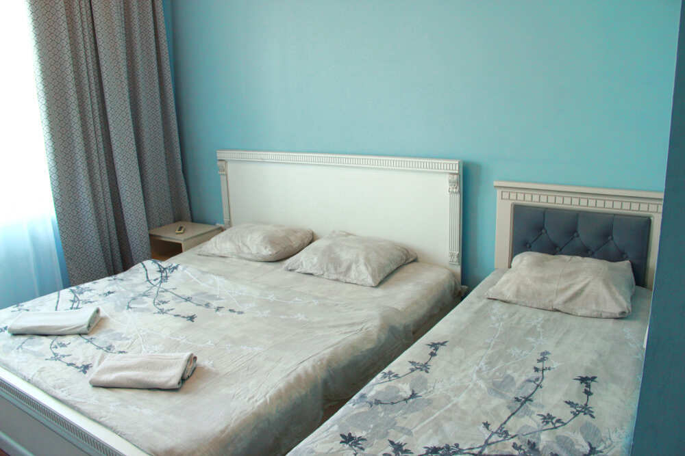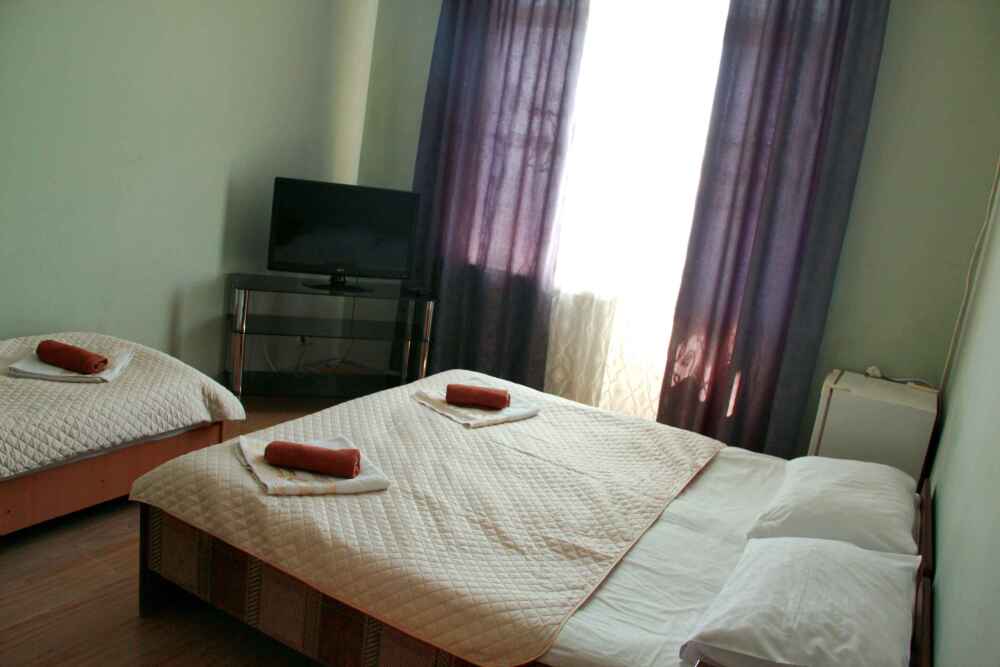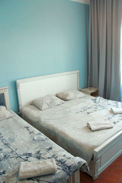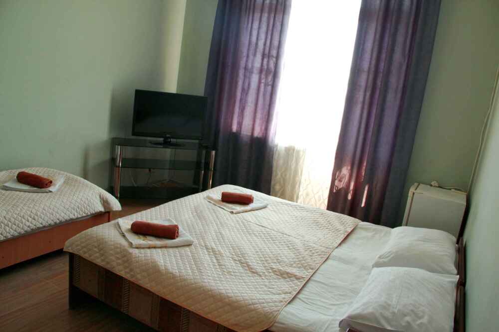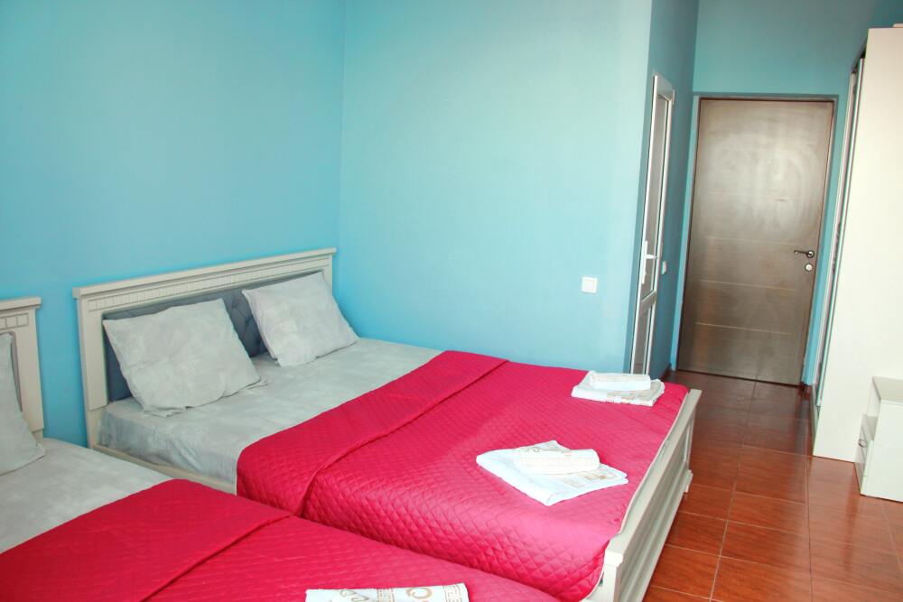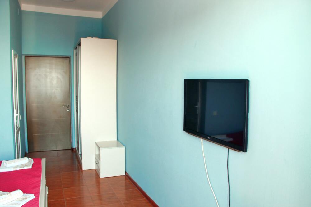 3-х местный номер категории «Стандарт» - отдельный вход с обратной стороны корпуса 2 - однокомнатный уютный номер, расположенный на 2 этаже гостевого дома, в номере 2-х спальная кровать и 1-но спальная кровать, шкаф для одежды, прикроватные тумбочки, телевизор, кондиционер. В номере есть большой балкон с видом на море и внутренний двор гостевого дома. На балконе есть стол и стулья для отдыха. Санузел (душ, туалет, умывальник) в номере.