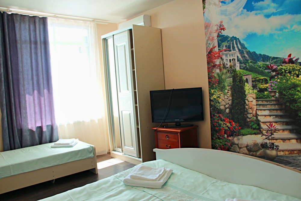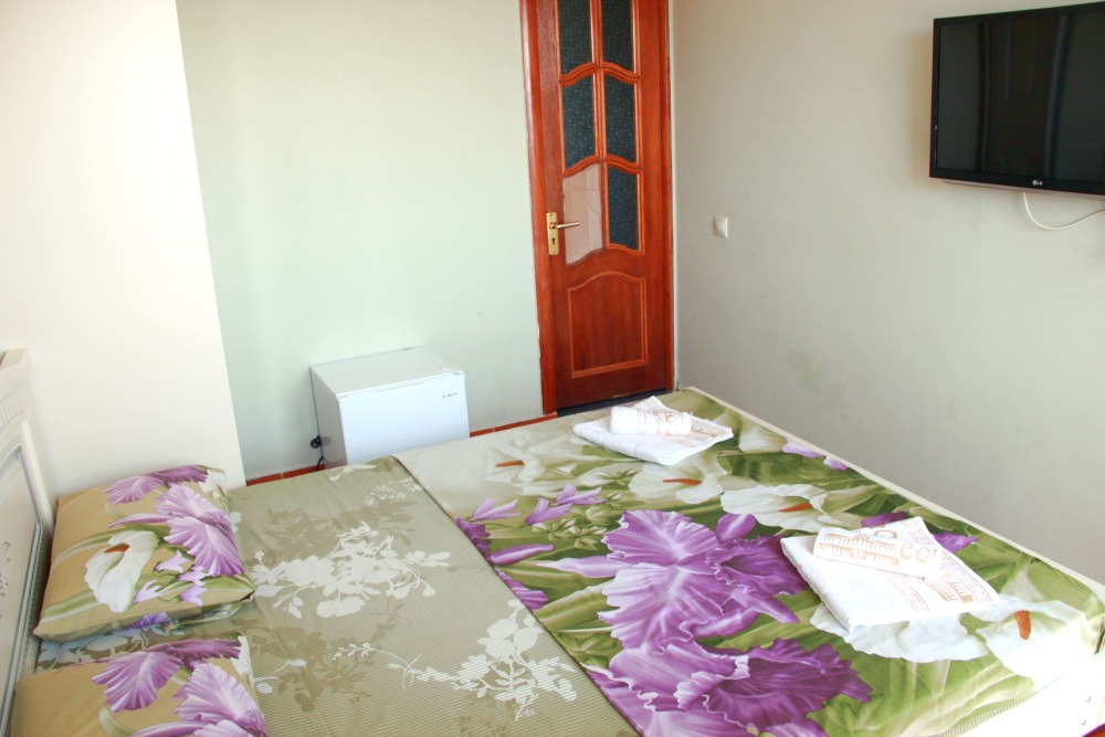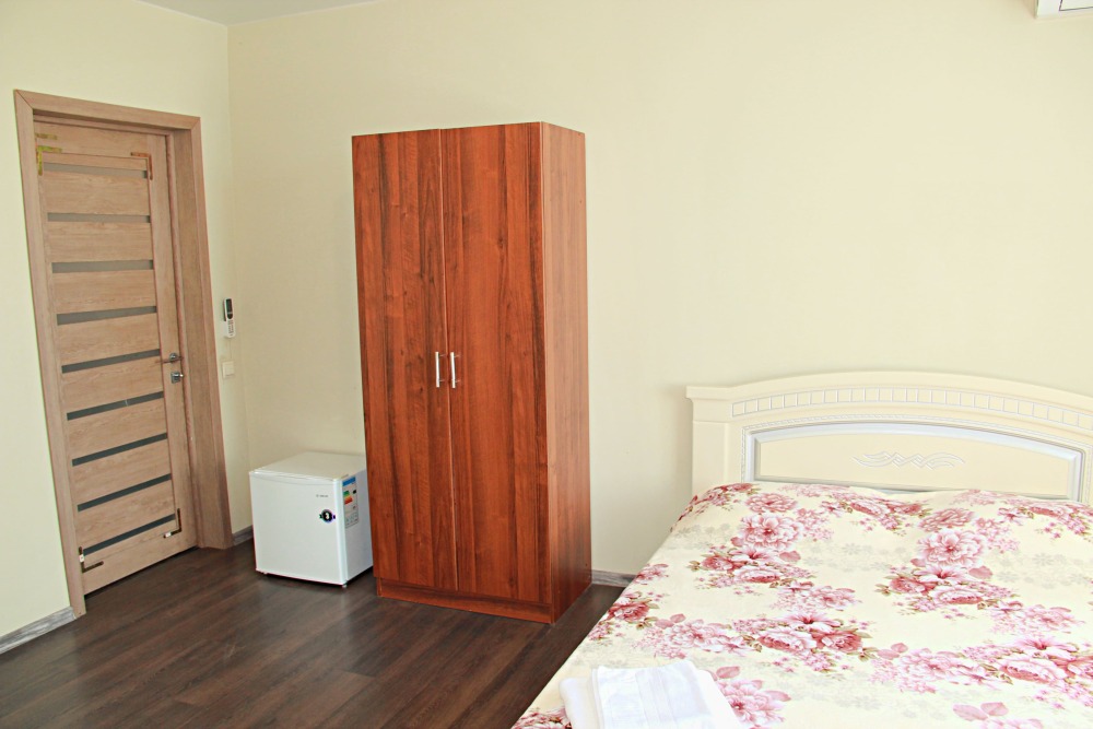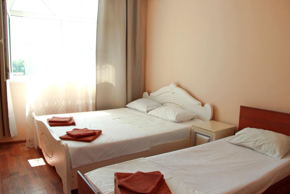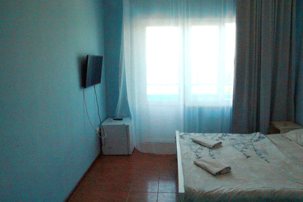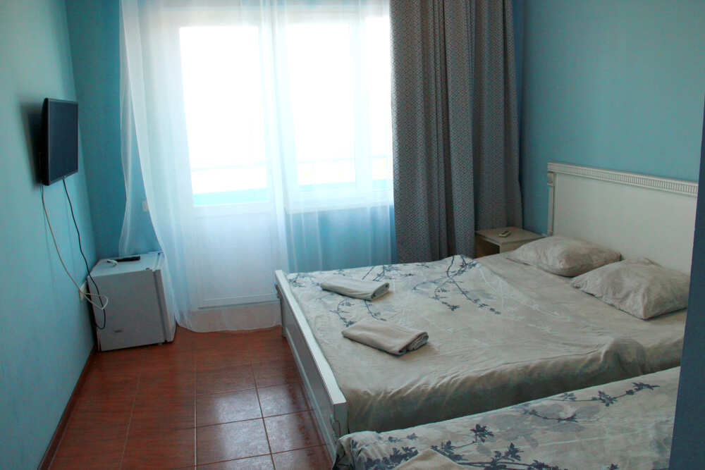 3-х местный номер категории «Стандарт» с балконом - однокомнатные уютные номера, расположенные на 2 этаже гостевого дома, в каждом номере 2-х спальная кровать+1-но спальная кровать, шкаф для одежды, прикроватные тумбочки, телевизор, мини-холодильник, кондиционер. Со всех номеров данной категории открывается потрясающий вид на море. Санузел (душ, туалет, умывальник) в номере. Гладильная доска на этаже рядом с номером. На балконе есть стол и стулья для отдыха.