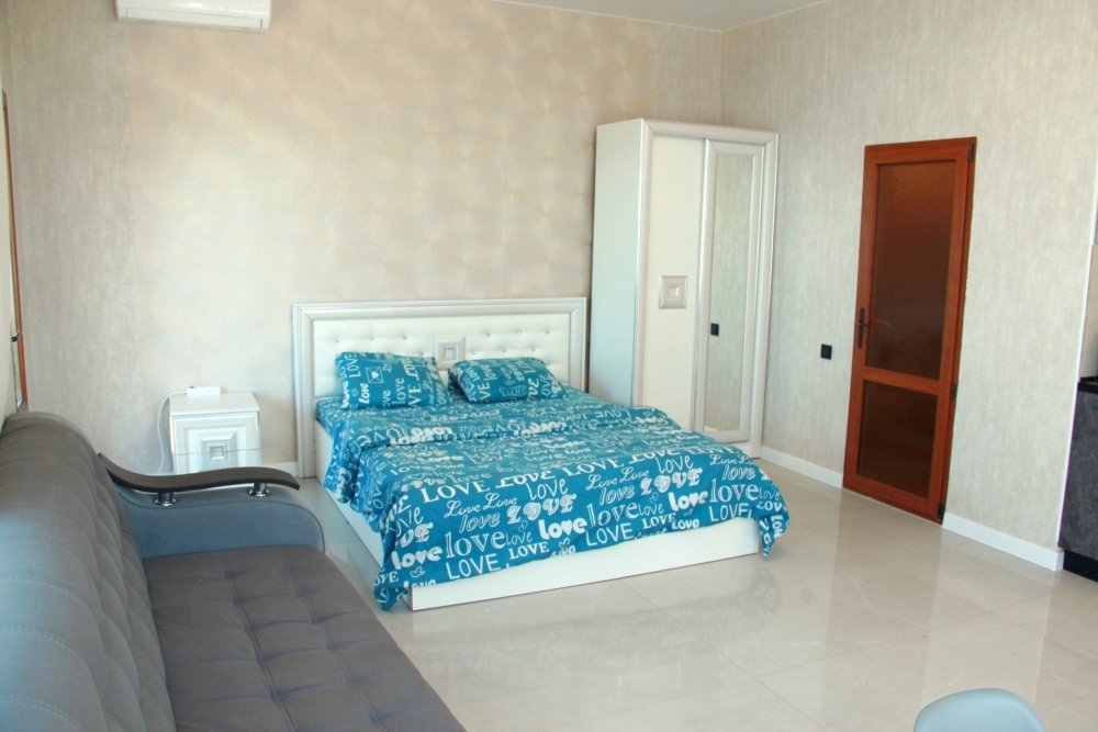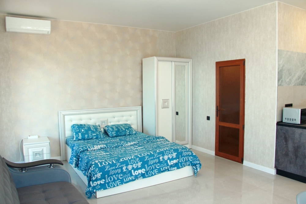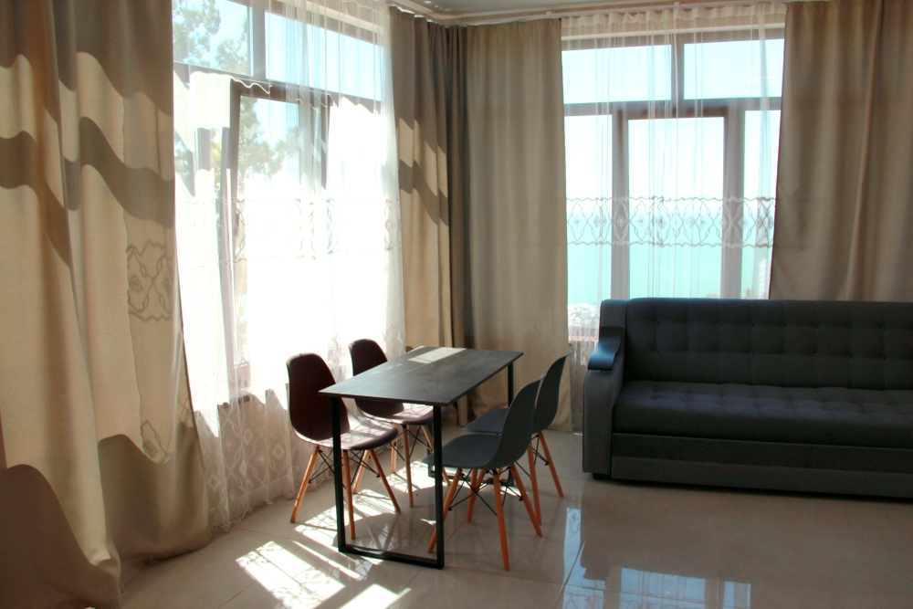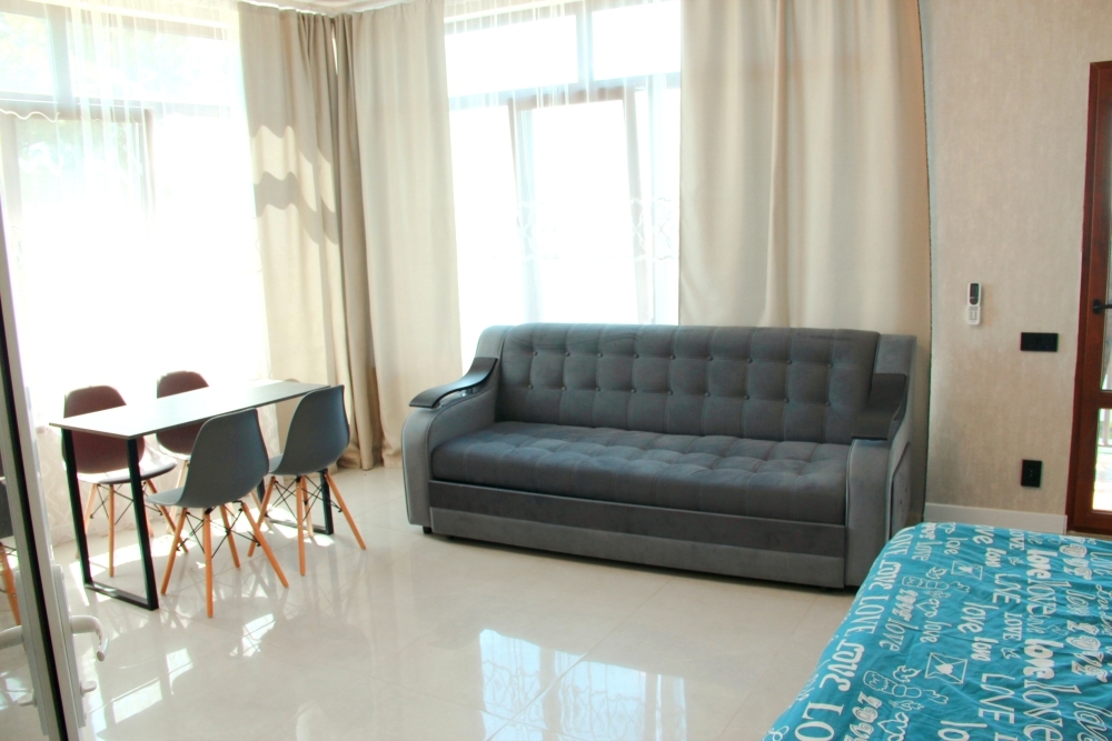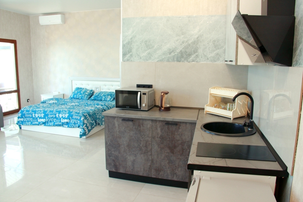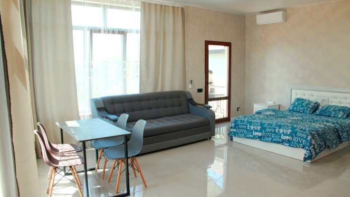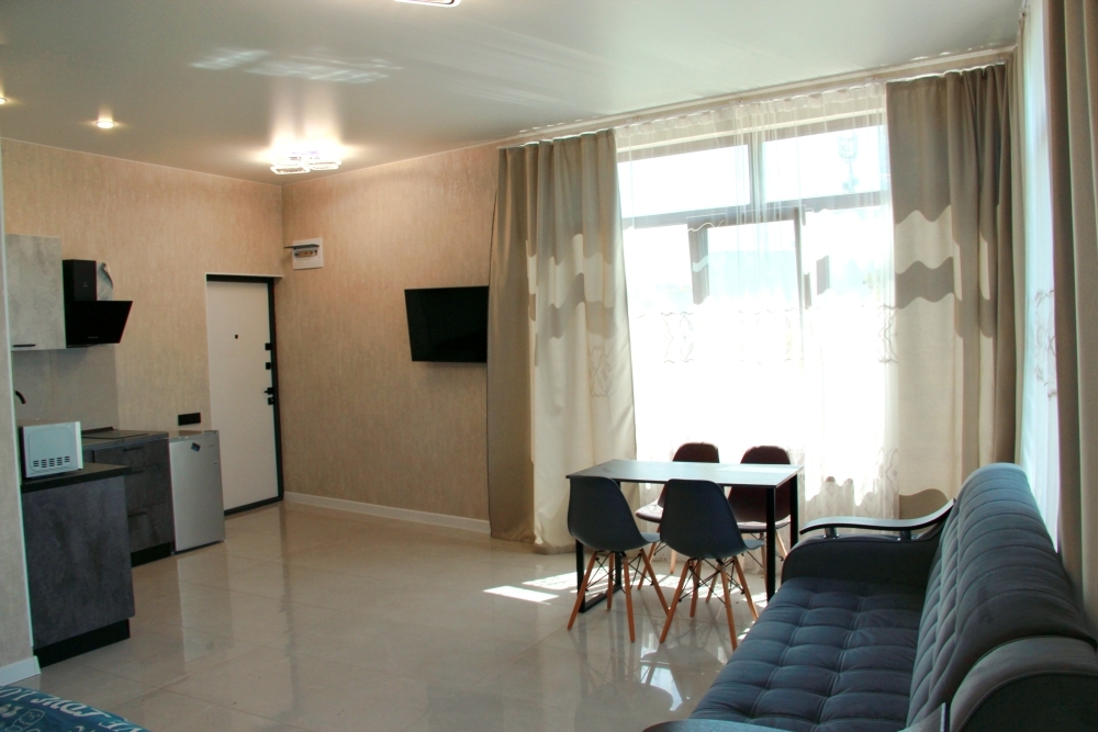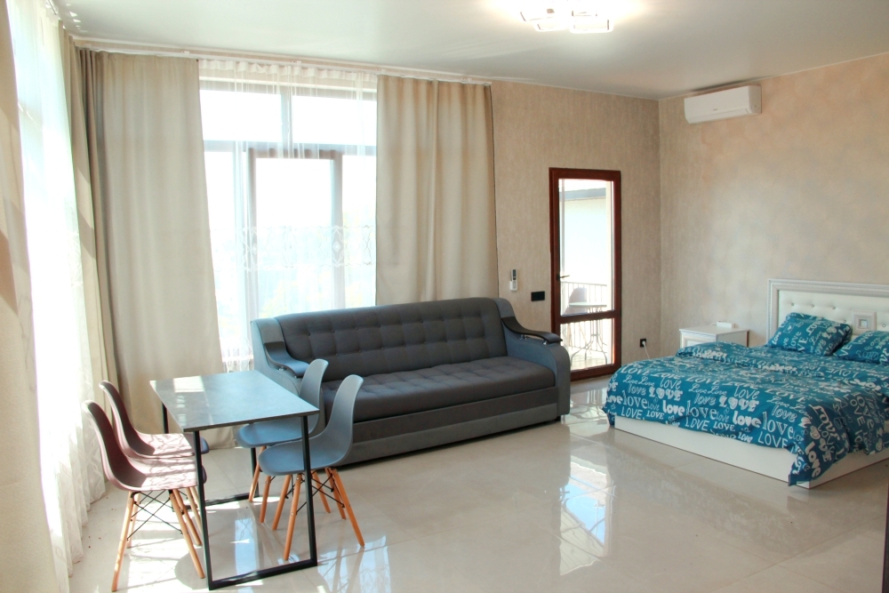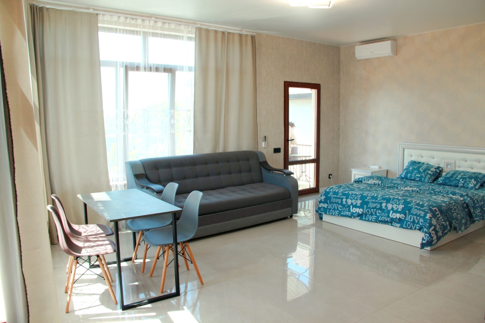 4-х местные номера категории «Студия» с балконом - однокомнатные уютные номера, расположенные на 1 и 2 этаже гостевого дома с отдельными входами, в каждом номере 2-х спальная кровать и 2-х спальный диван, кухонный гарнитур, индукционная плита с вытяжкой, микроволновка, посуда и столовые приборы, обеденный стол и стульями, шкаф для одежды, прикроватные тумбочки, телевизор, кондиционер, холодильник. Санузел (душ, туалет, умывальник, стиральная машина) в номере. С номера на втором этаже открывается потрясающий вид на море. На балконе есть стол и стулья для отдыха.