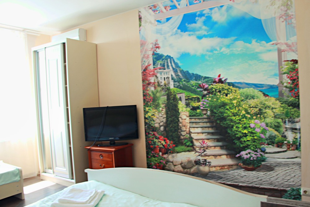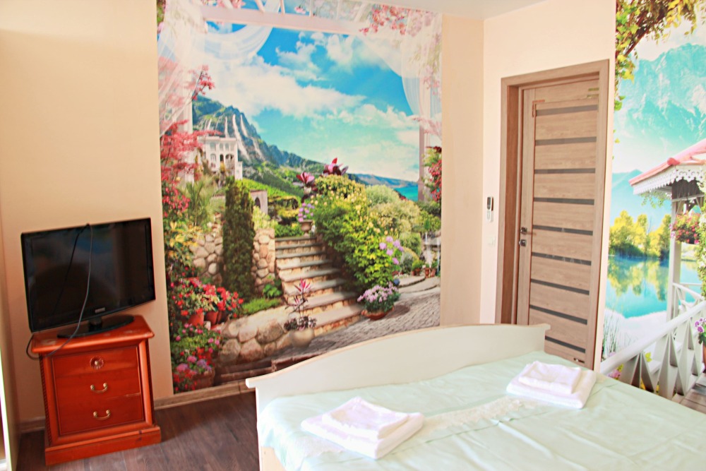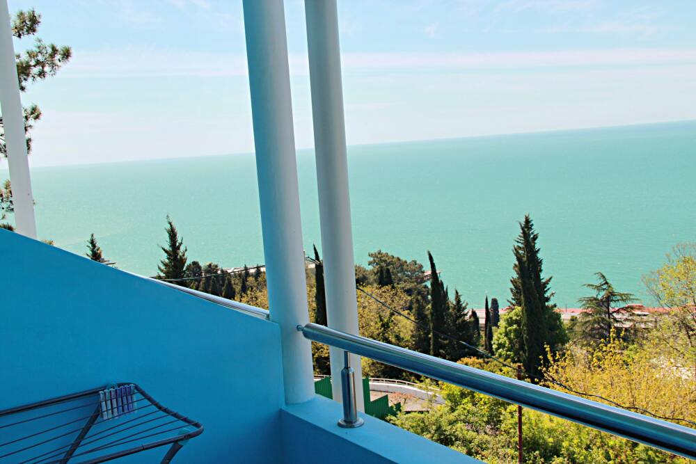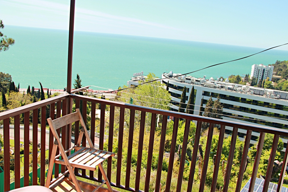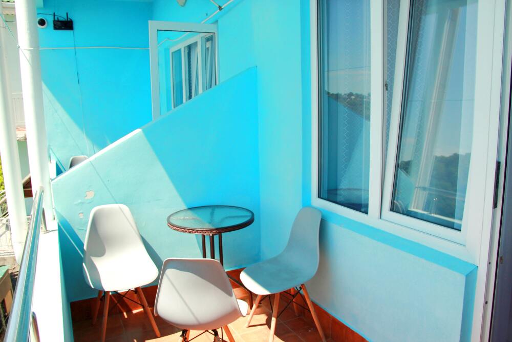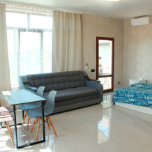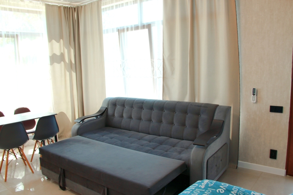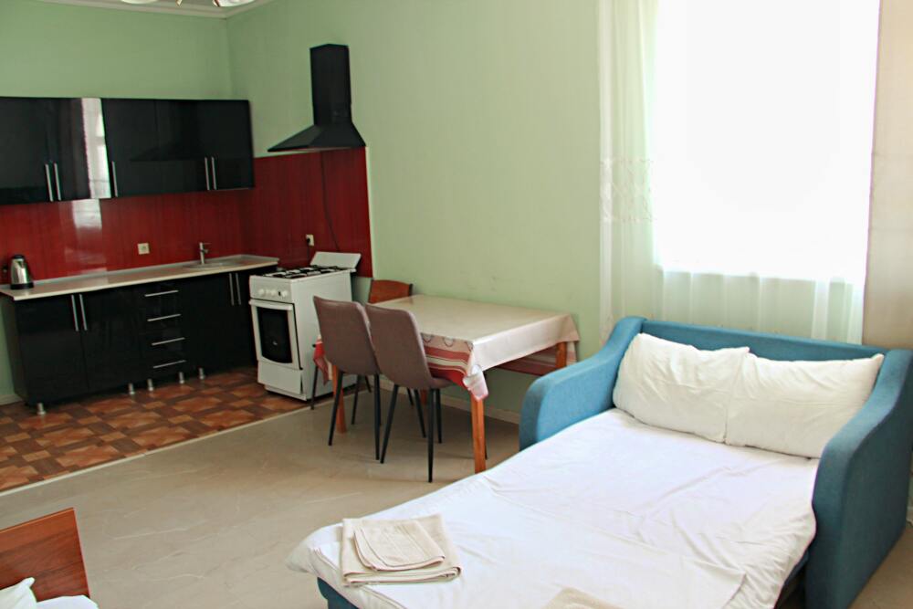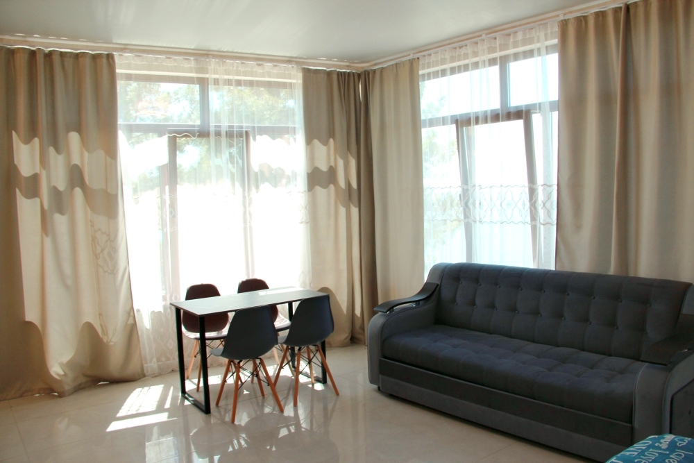 4-х местные номера категории «Студия» с балконом - однокомнатные уютные номера, расположенные на 1 и 2 этаже гостевого дома с отдельными входами, в каждом номере 2-х спальная кровать и 2-х спальный диван, кухонный гарнитур, индукционная плита с вытяжкой, микроволновка, посуда и столовые приборы, обеденный стол и стульями, шкаф для одежды, прикроватные тумбочки, телевизор, кондиционер, холодильник. Санузел (душ, туалет, умывальник, стиральная машина) в номере. С номера на втором этаже открывается потрясающий вид на море. На балконе есть стол и стулья для отдыха.
