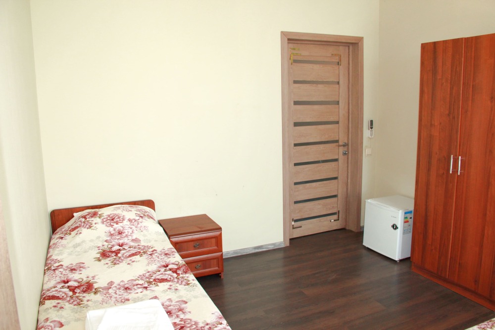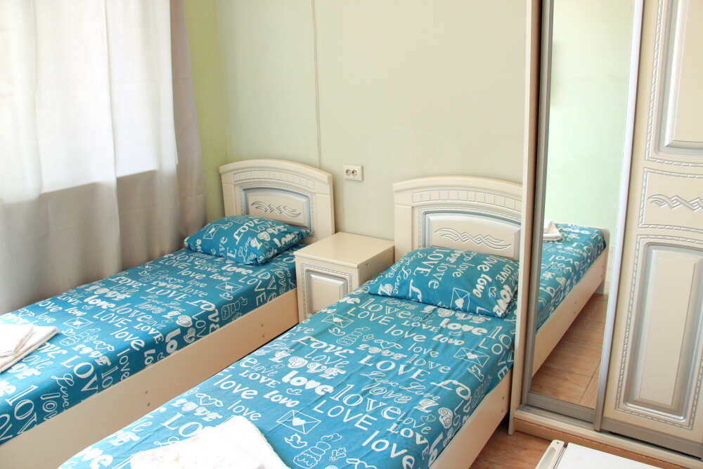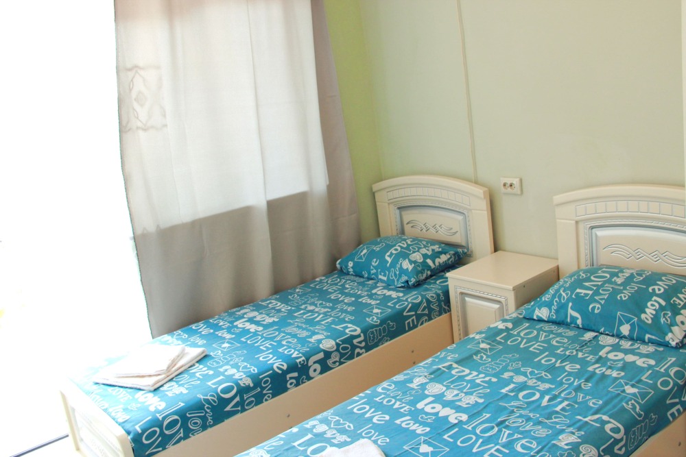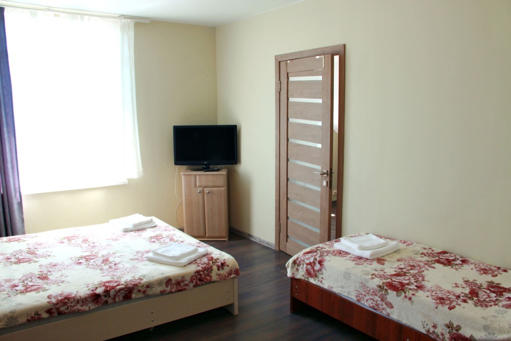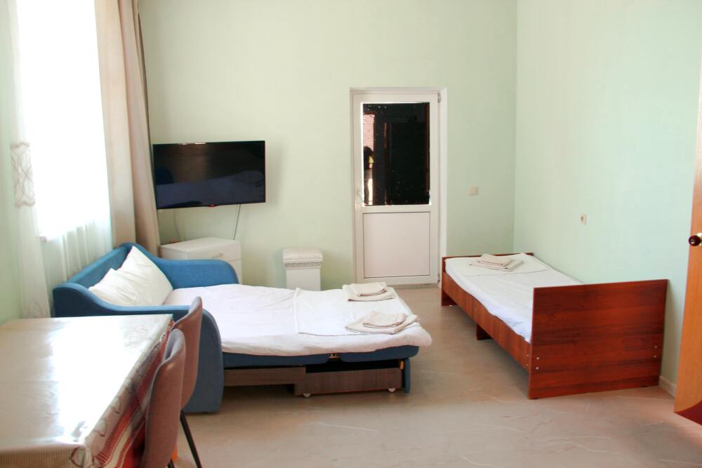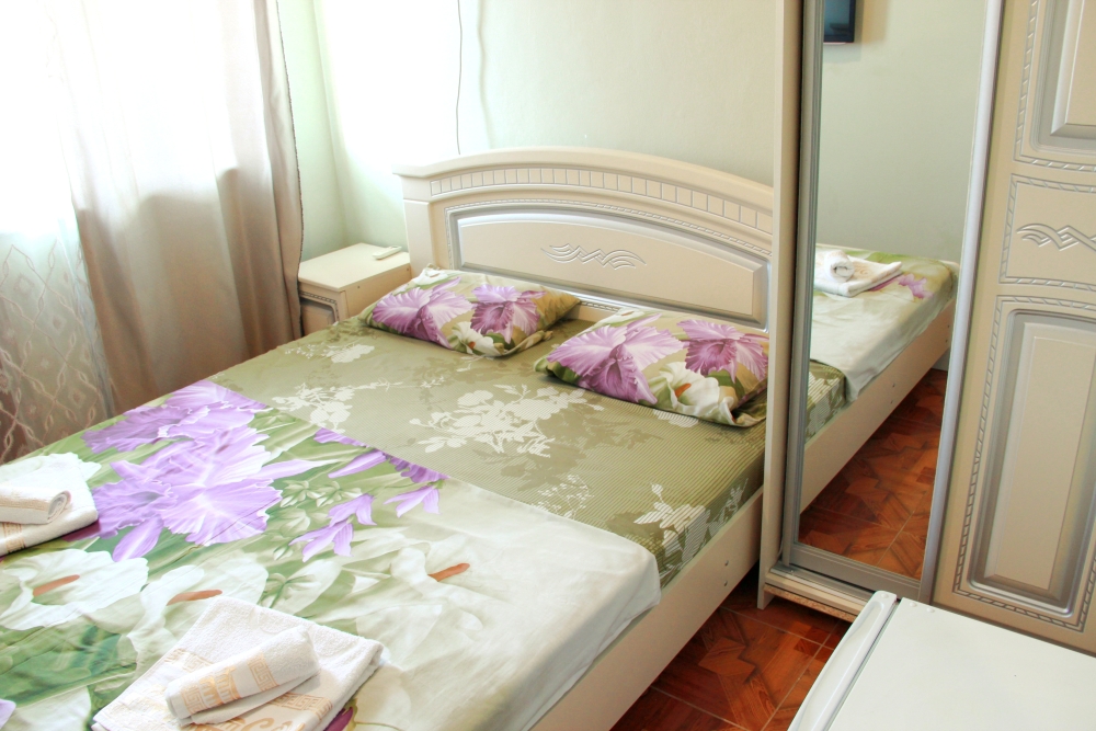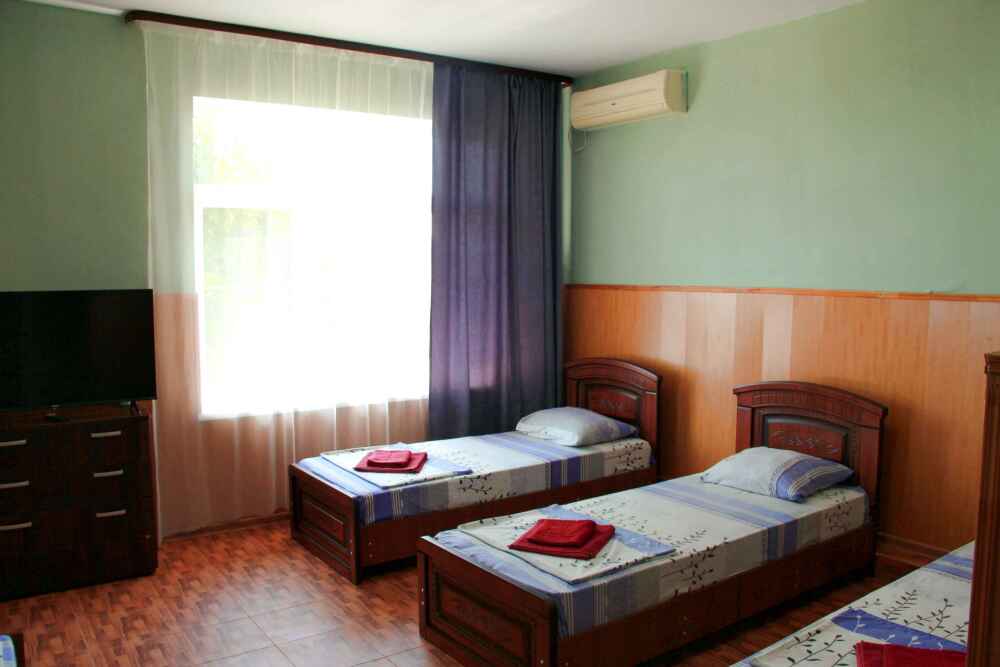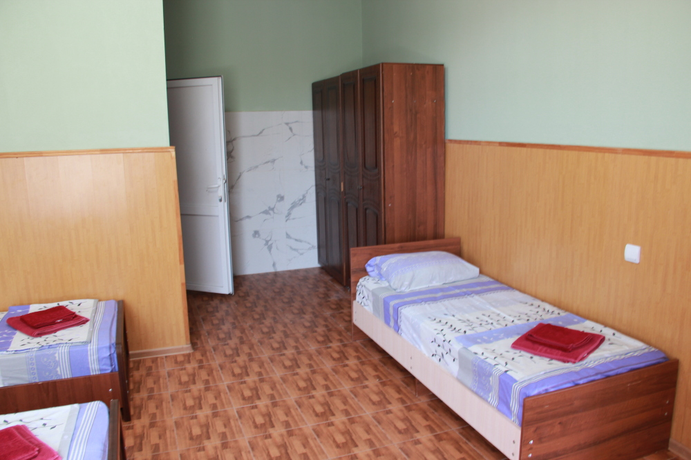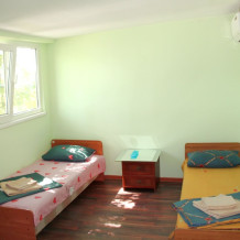 4-х местный семейный номер категории «Стандарт» - однокомнатный уютный номер, 1 этаж, 2 корпус, отдельный вход, в номере – 4 раздельные кровати, комод, 2 шкафа для одежды, журнальный стол, телевизор, кондиционер. Санузел (душ, туалет, раковина) в номере. Окна номера во двор. Рядом с номером стиральная машина и летняя кухня.