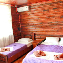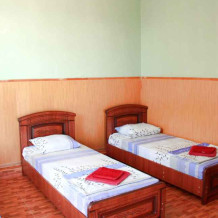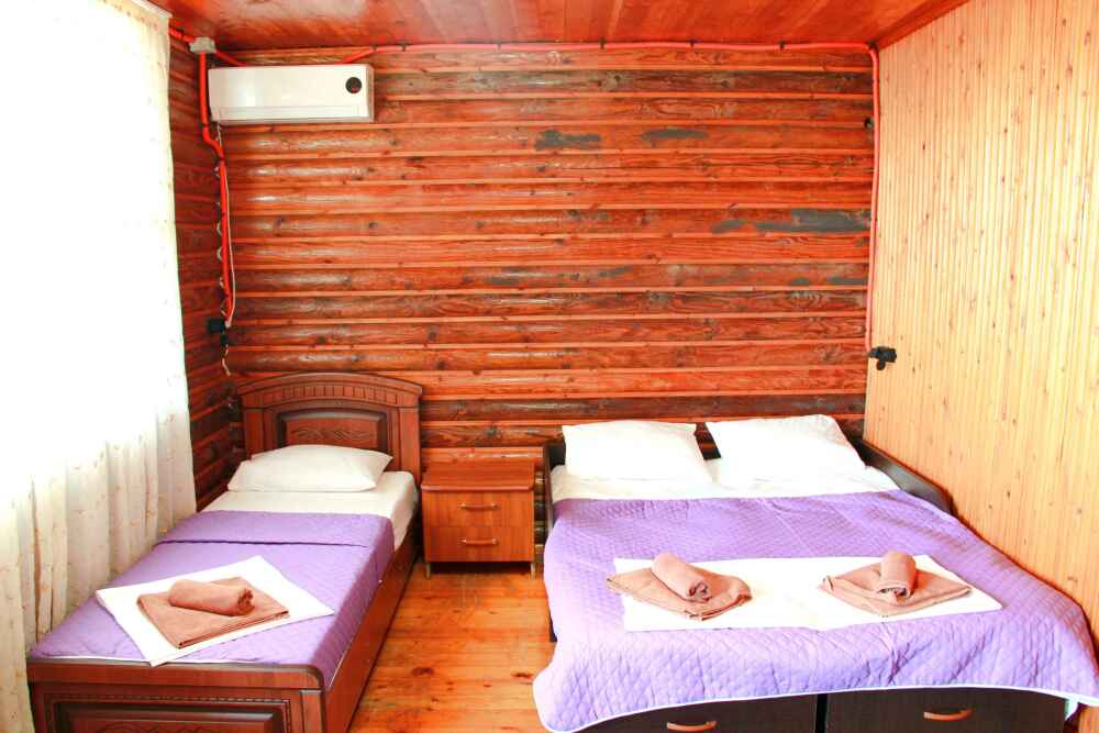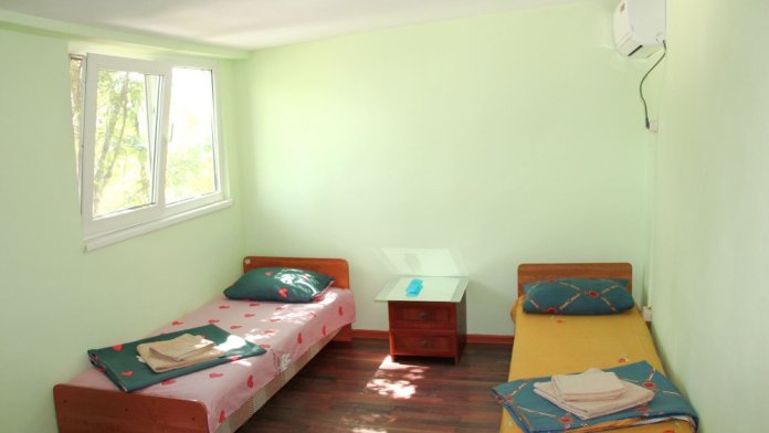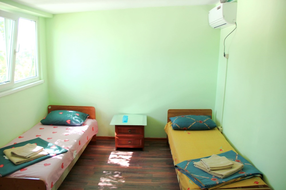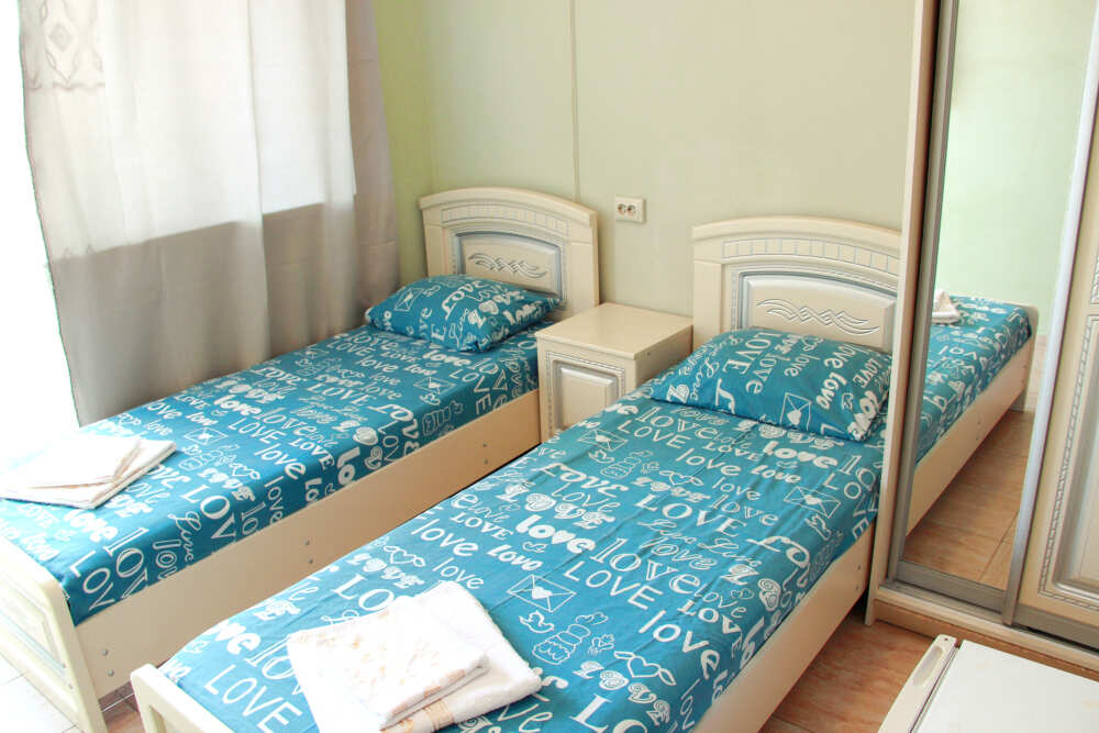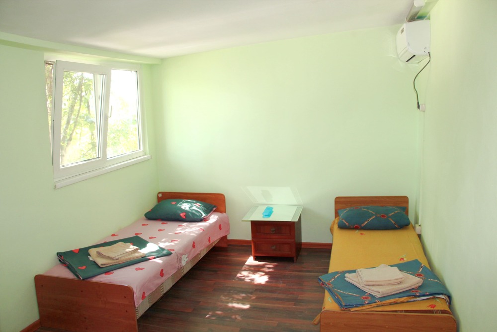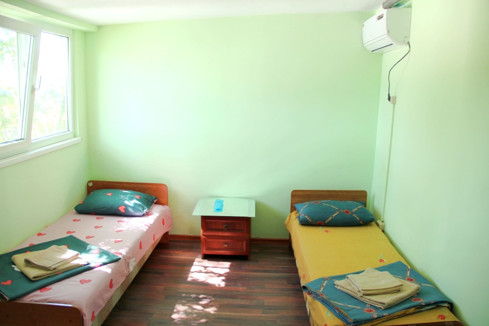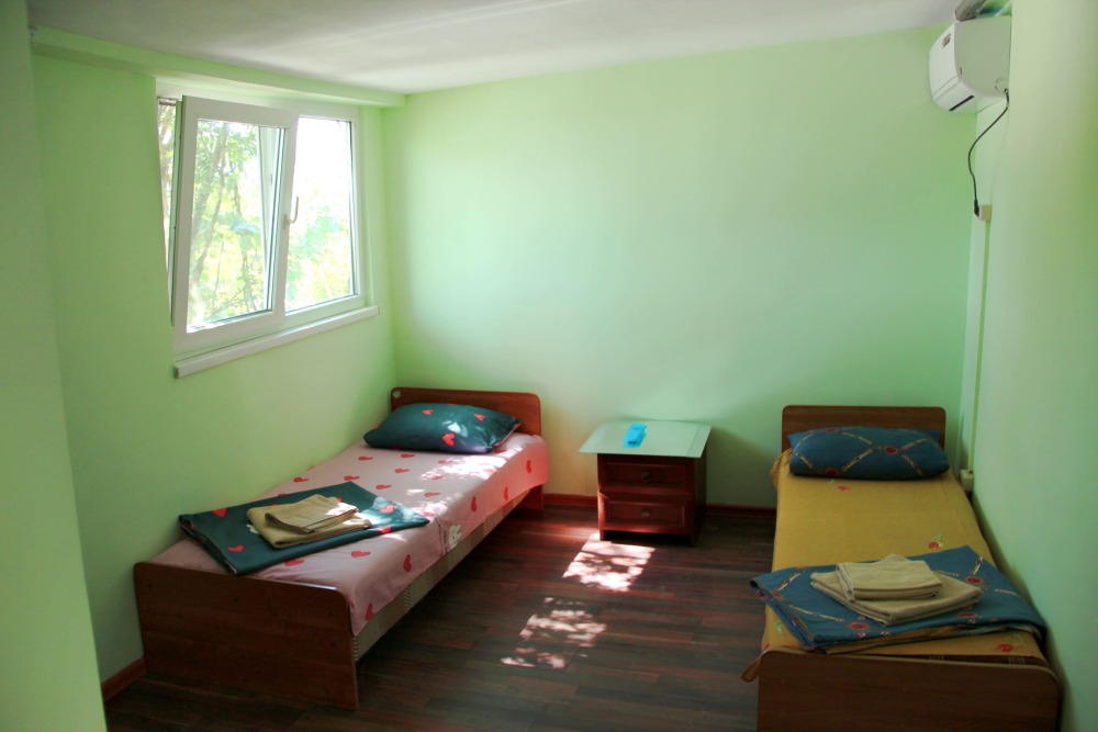 2-х местный номер категории «Эконом» - номер расположен в отдельном летнем домике – 2 раздельные кровати, прикроватные тумбочки, кондиционер, телевизор, шкаф. Санузел (душ, туалет, раковина) в номере.