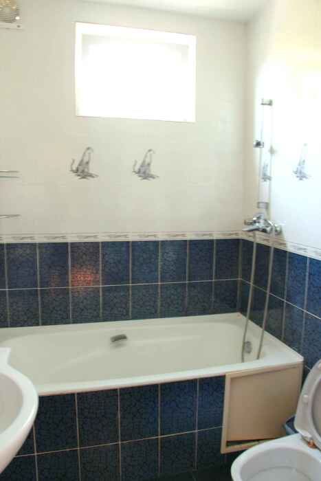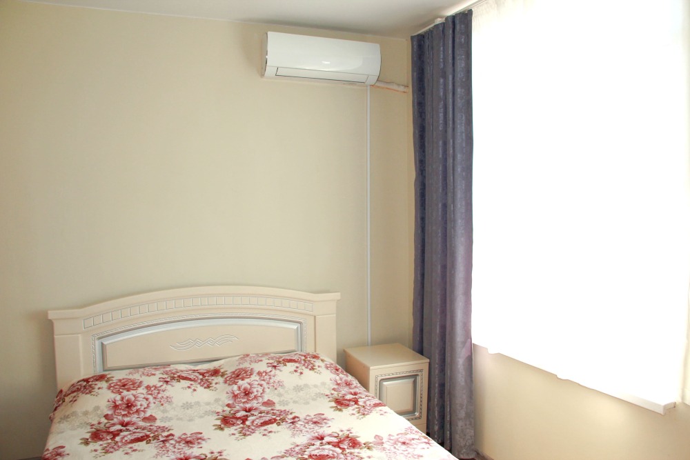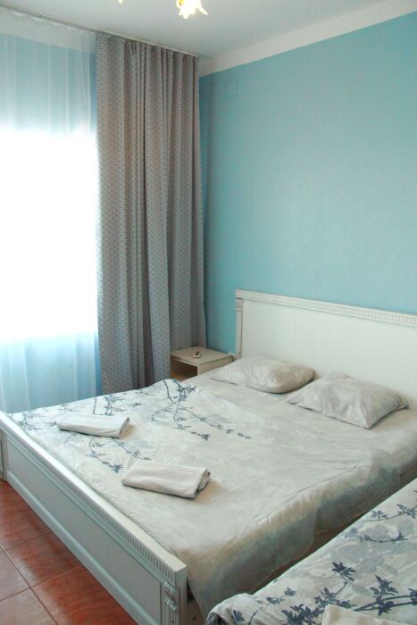 В номере - в комнате 1 – 2-х спальная кровать, 1-но спальная кровать, кондиционер, телевизор, шкаф, зеркало, вид из окна на море, в комнате 2 – 2 раздельные кровати либо 2-х спальная кровать, санузел (душ, туалет, раковина), окно с видом на море и внутренний двор