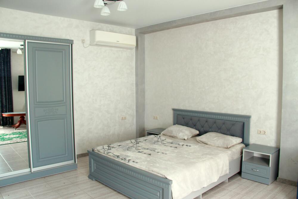 6-ти местный 2-х комнатный семейный номер категории «Стандарт» - двухкомнатный уютный номер, 3 этаж, 2 корпус, отдельный вход, в номере – в общей кухне-гостиной – кухонный гарнитур, холодильник, плита, электрический чайник, вытяжка, кухонные и столовые приборы и посуда, обеденный стол и стулья, 2-х местный диван, 1-но спальня кровать, в спальне – 2-х спальная кровать+1-но спальная кровать, вместительный шкаф для одежды, кондиционер. Санузел (душ, туалет, раковина, стиральная машина) в номере. Из окон номера открывается потрясающий вид на море. На большом балконе есть стол и стулья для отдыха.