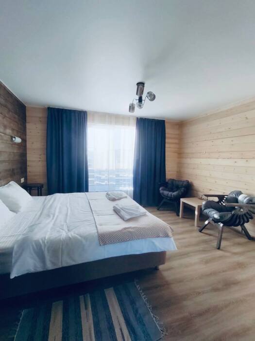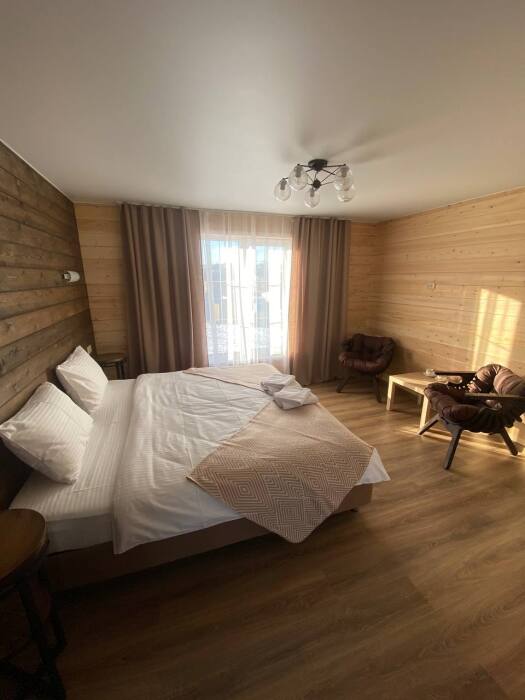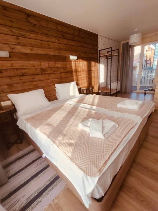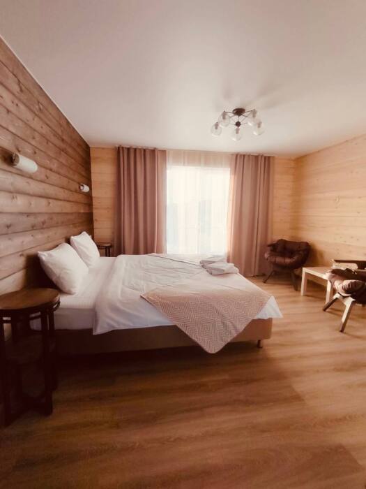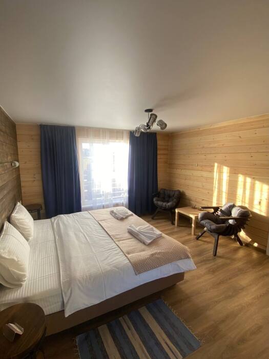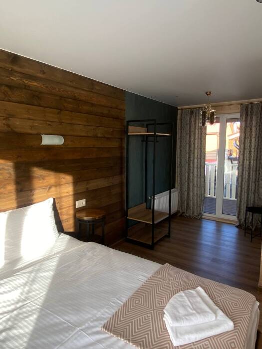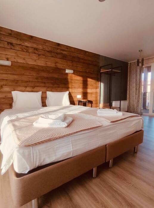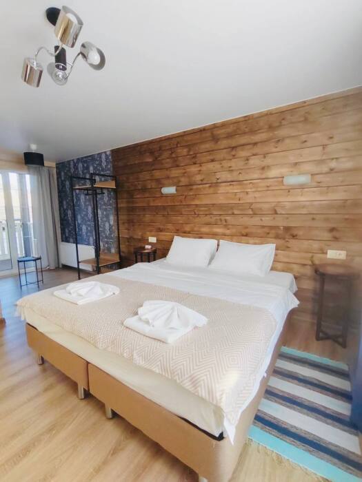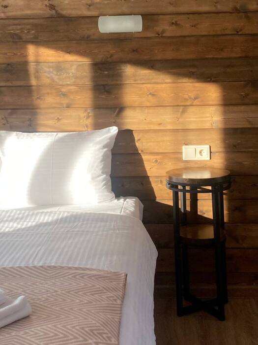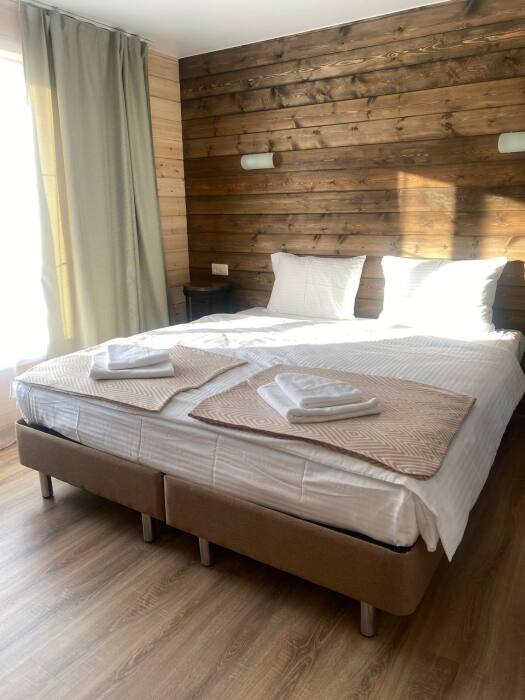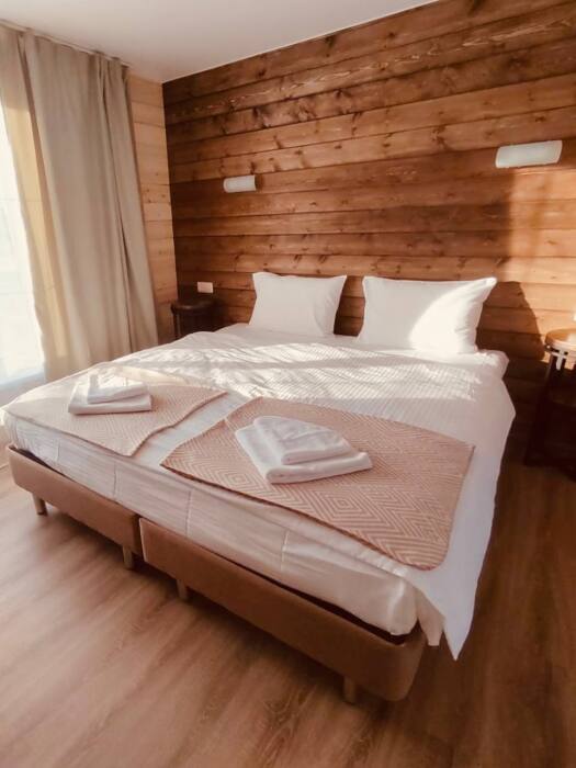 В номере возможно расположение, как на одной двуспальной кровати, так и на 2х раздельных кроватях. Номера повышенного метража, каждый оборудован просторной верандой с отдельным выходом.