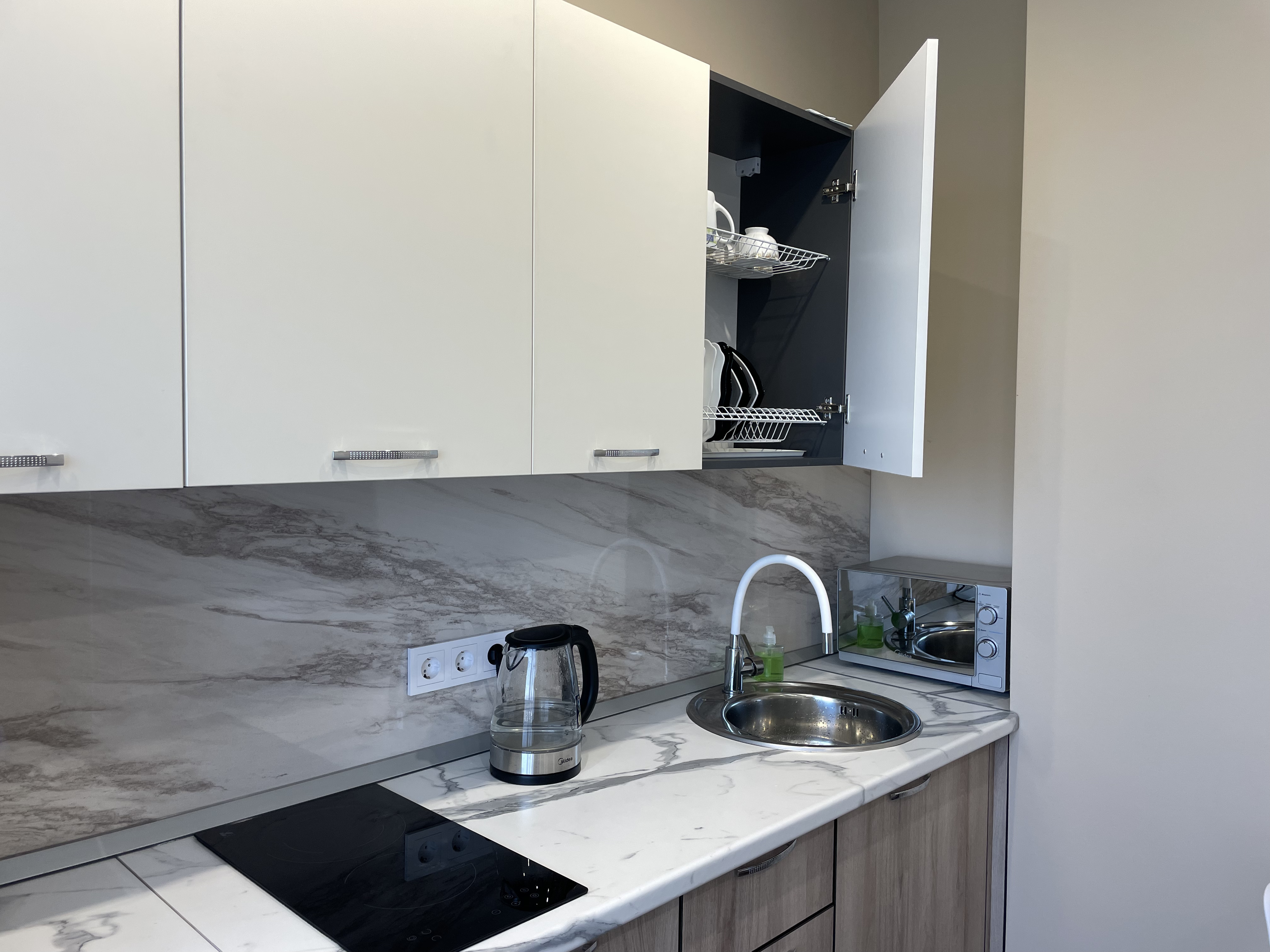 - На кухне вся необходимая техника и удобный уютный диванчик.